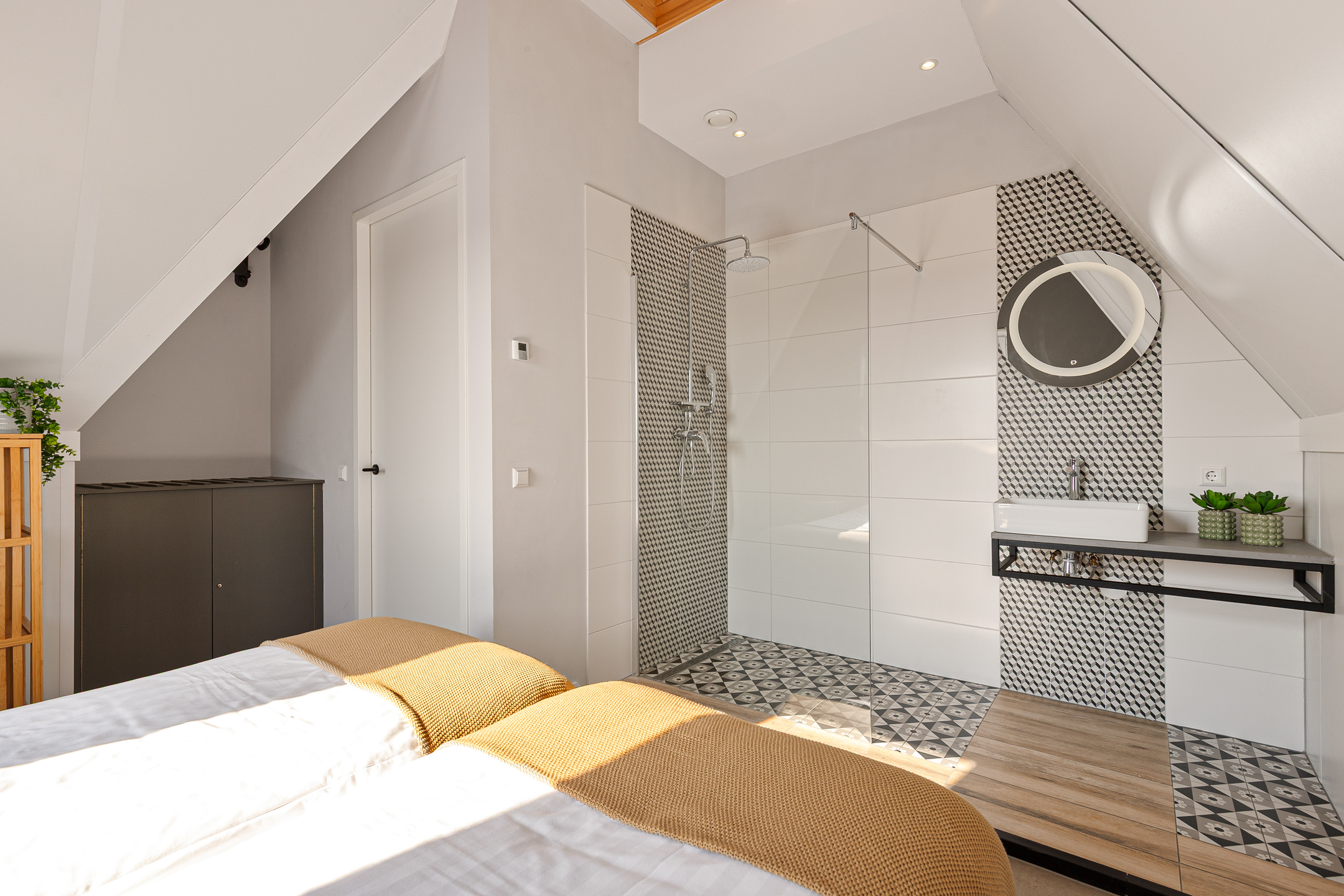 Overloop met toegang tot drie ruime slaapkamers met elk een eigen ensuite badkamer betegeld in mediterrane stijl, voorzien van inloopdouche en wastafelmeubel. De verdiepingsvloer is afgewerkt met een duurzame pvc-vloer en ook hier is vloerverwarming aanwezig. Alle kamers zijn individueel qua temperatuur in te regelen. Op de overloop is een tweede toilet en grote kastruimte gesitueerd.