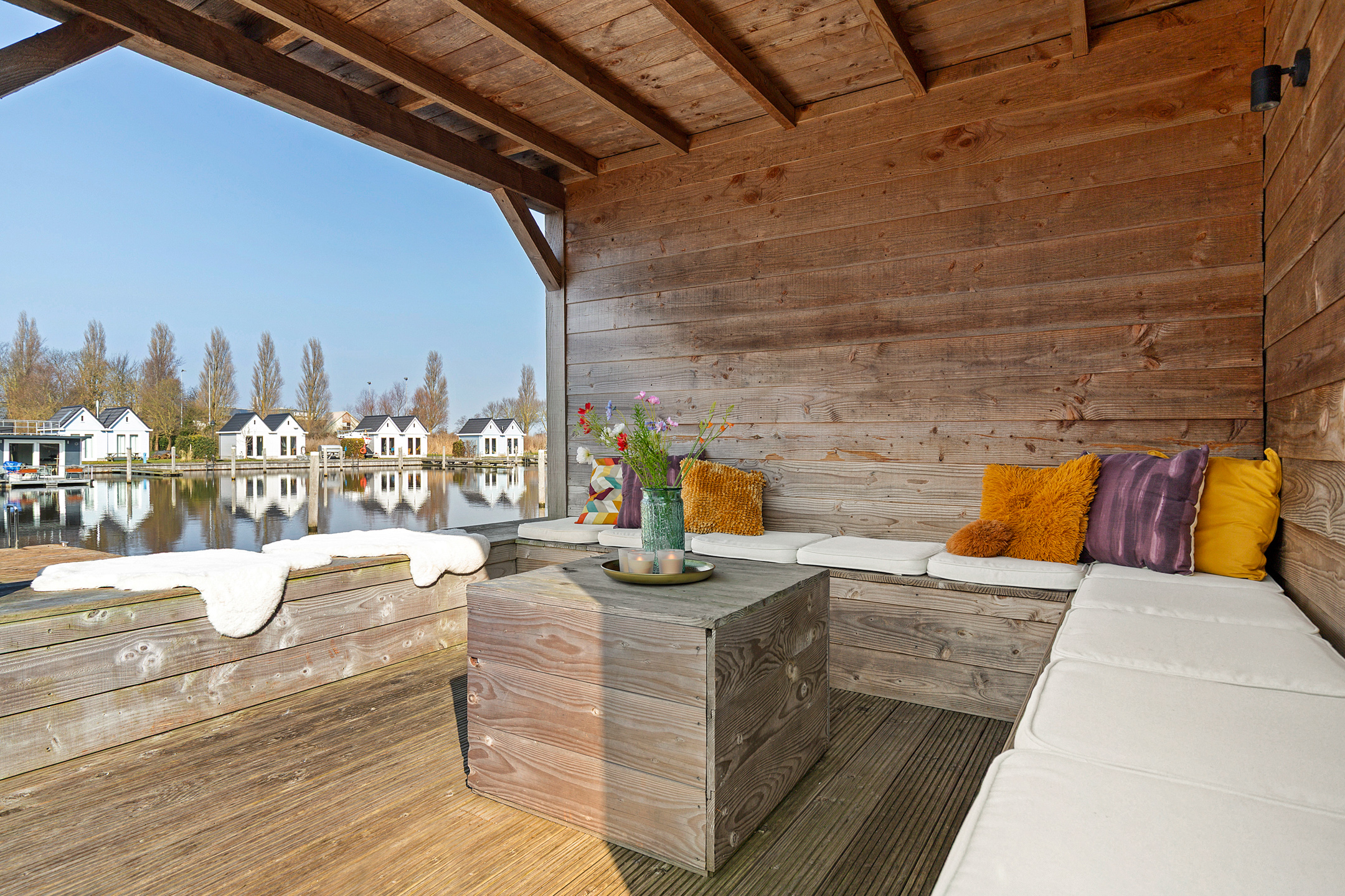 Aan de steiger staat een houten overkapping met berging, een ideale plek om beschut buiten te zitten, zelfs wanneer het weer wat minder is. De bergruimte is groot genoeg voor fietsen, tuingereedschap en/of bootkussens.