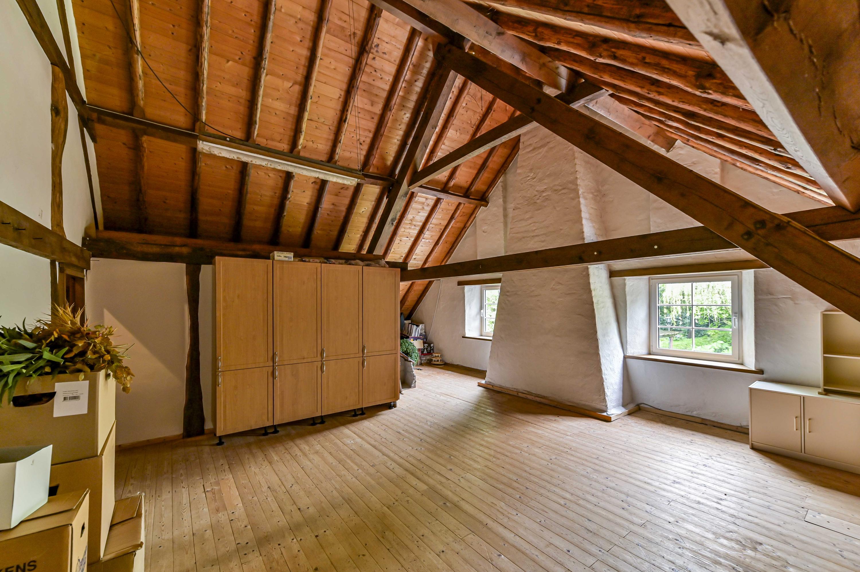 The farmhouse-style kitchen (approx. 30 m²) features built-in cupboards, unique details and a granite worktop. Double doors connect to the inner courtyard. From here, the former dining room (approx. 26 m²) gives access to the spacious living room.