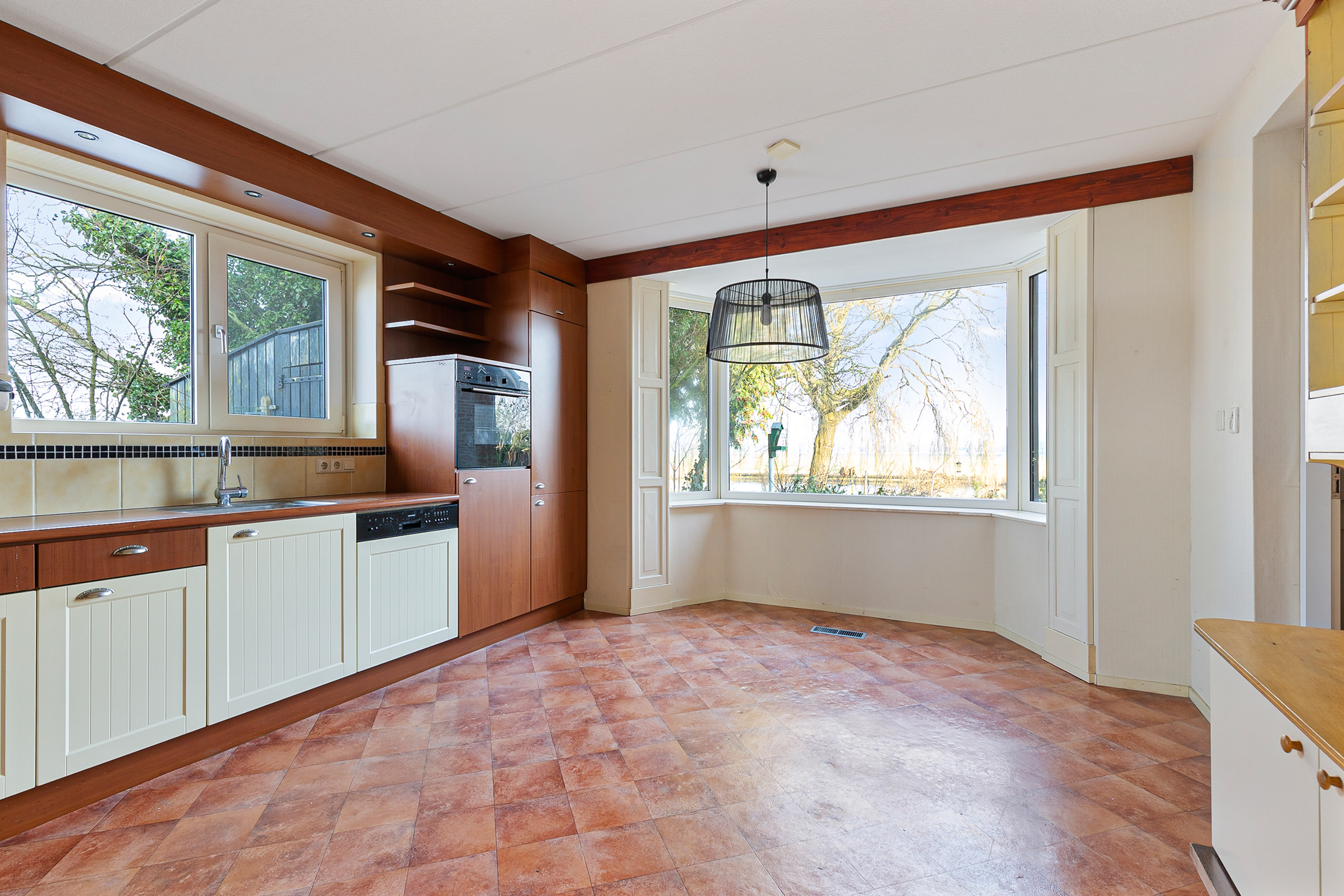 The entrance leads into a spacious hallway providing access to the various rooms. The generous living room is oriented towards the water and the typical Frisian vistas and, thanks to the large windows, offers breathtaking views. Adjacent is the conservatory with double garden doors, a wonderfully bright space that seamlessly connects indoor and outdoor living.