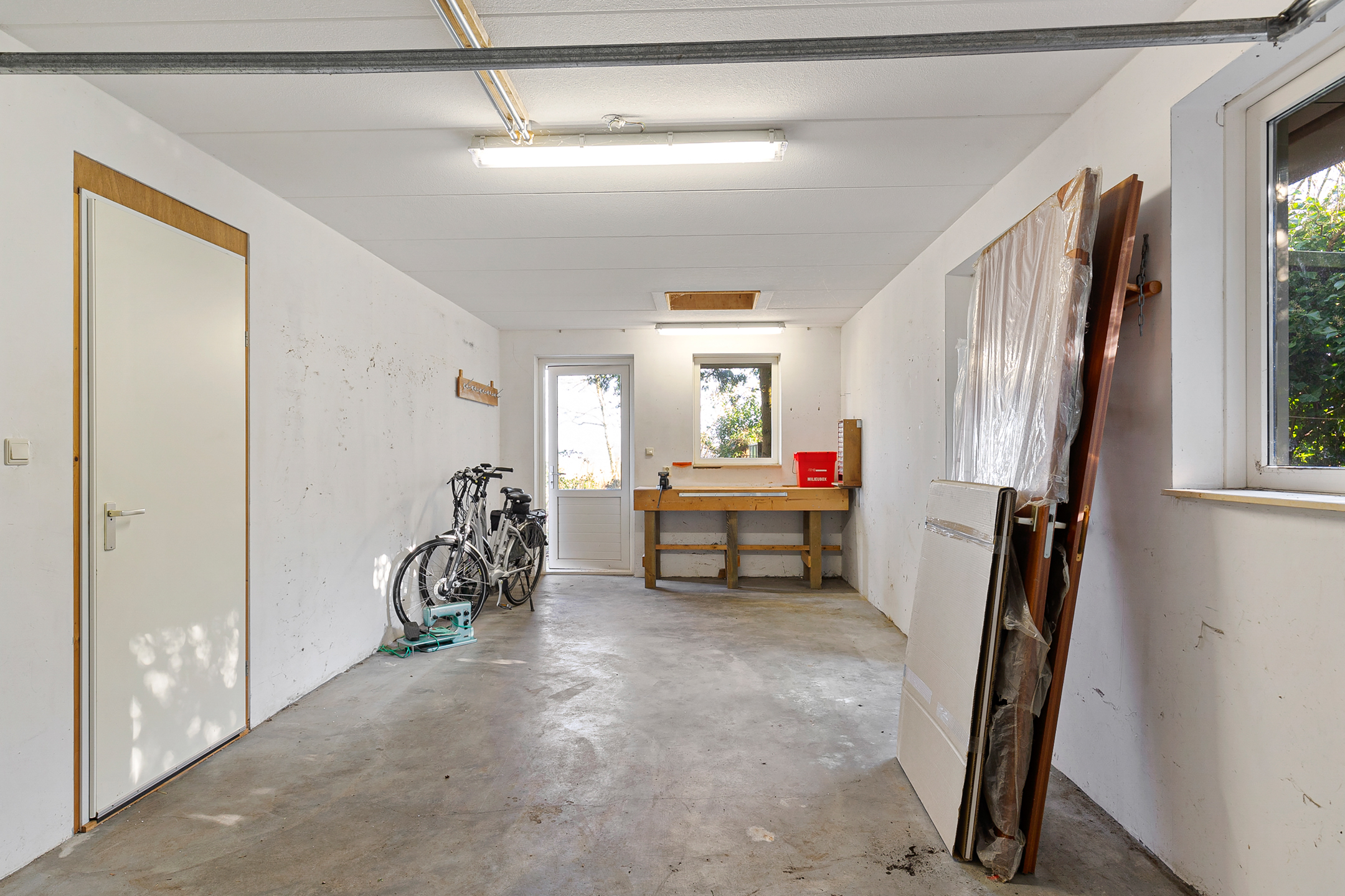 The generous internal garage features a concrete floor, overhead door, garden door and windows. There is space for a large car, workbench, bicycles and additional storage. This area can also be converted into an office or practice space. The private driveway accommodates two cars, and there is additional parking space directly in front of the property.