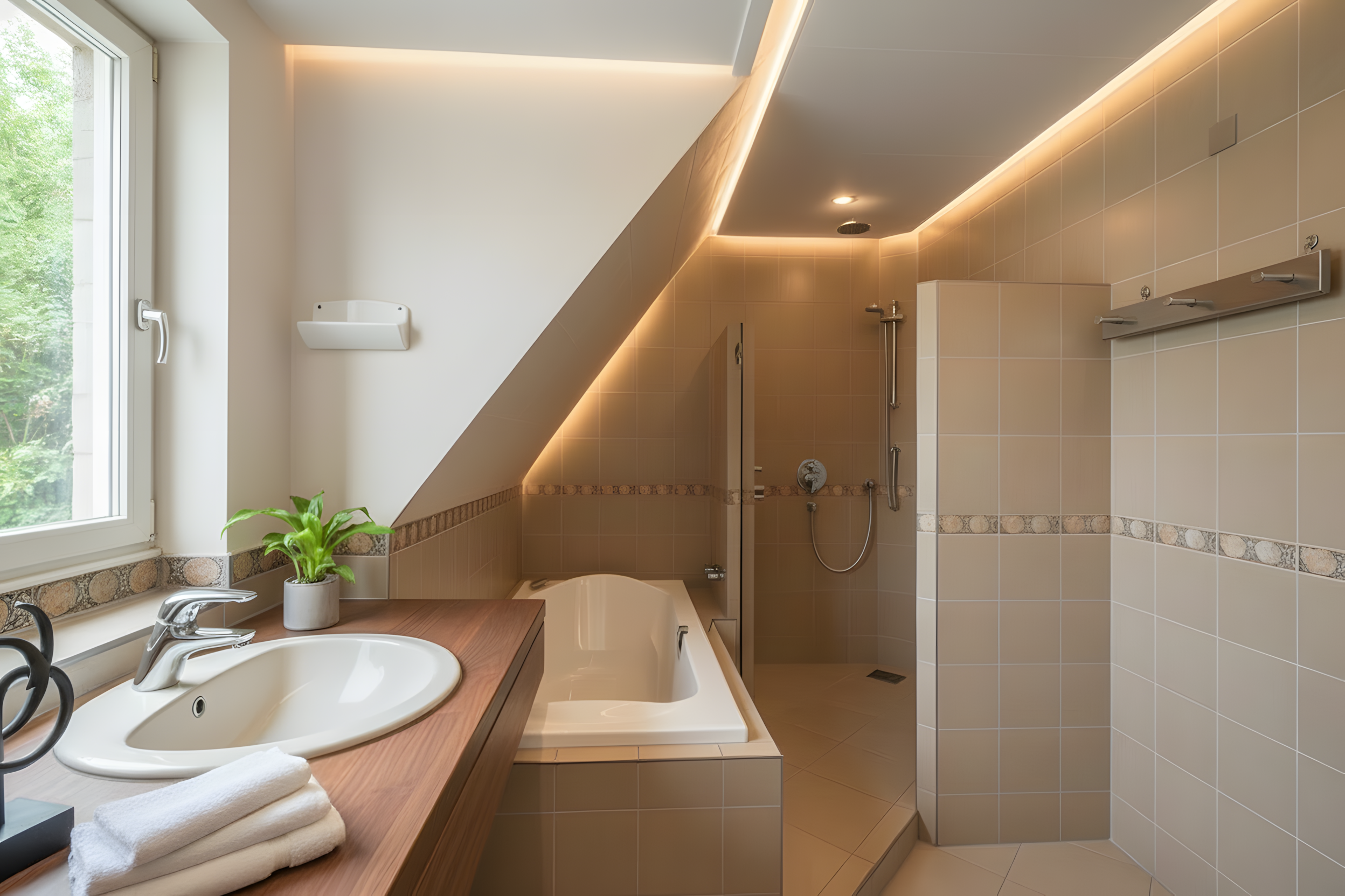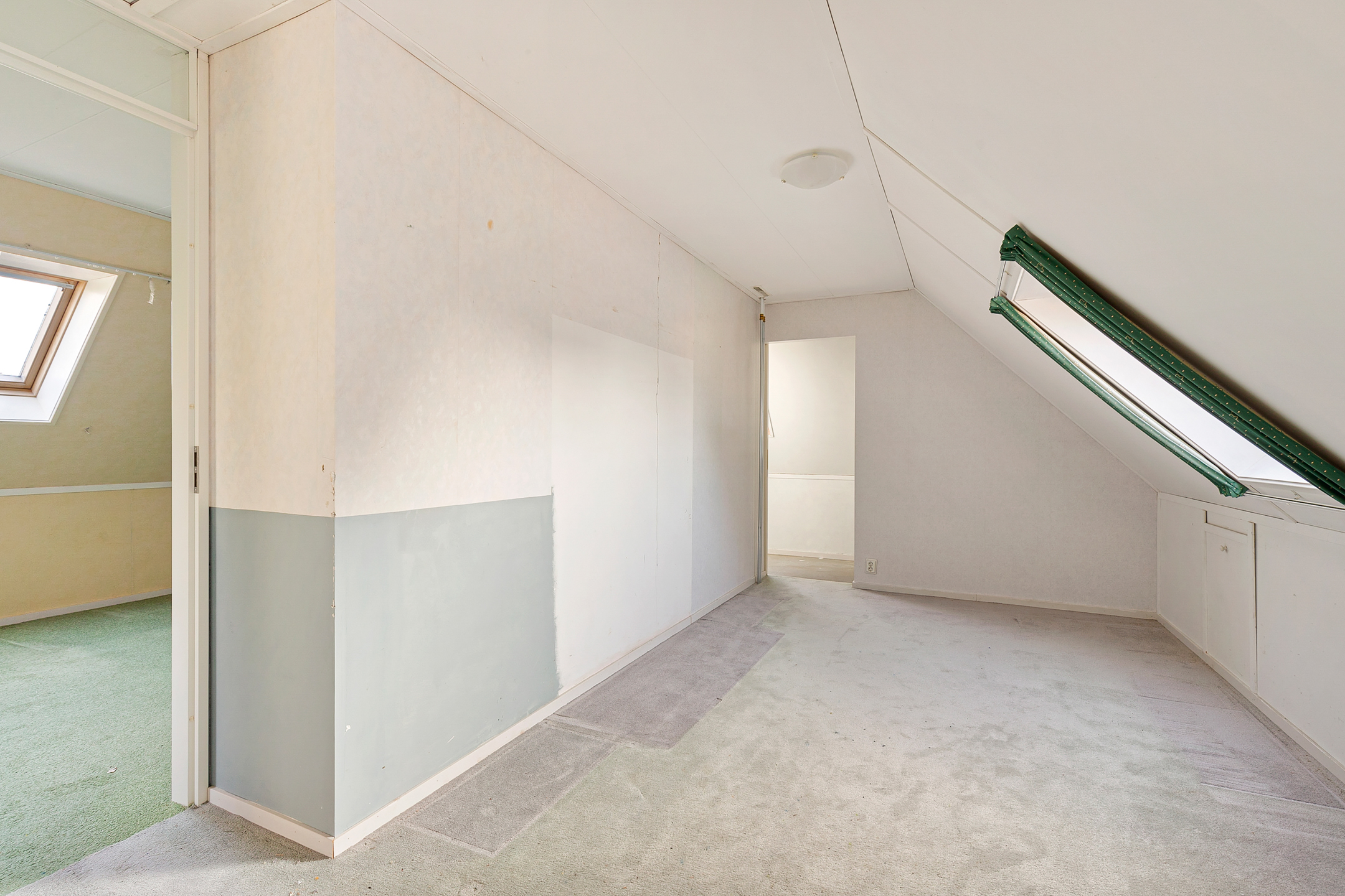 A fixed staircase leads to the insulated attic floor with standing height, roof windows and ample storage space. This level houses the installations for the heat recovery system, warm air heating and heat pump. From the landing, a separate loft storage area can also be accessed.