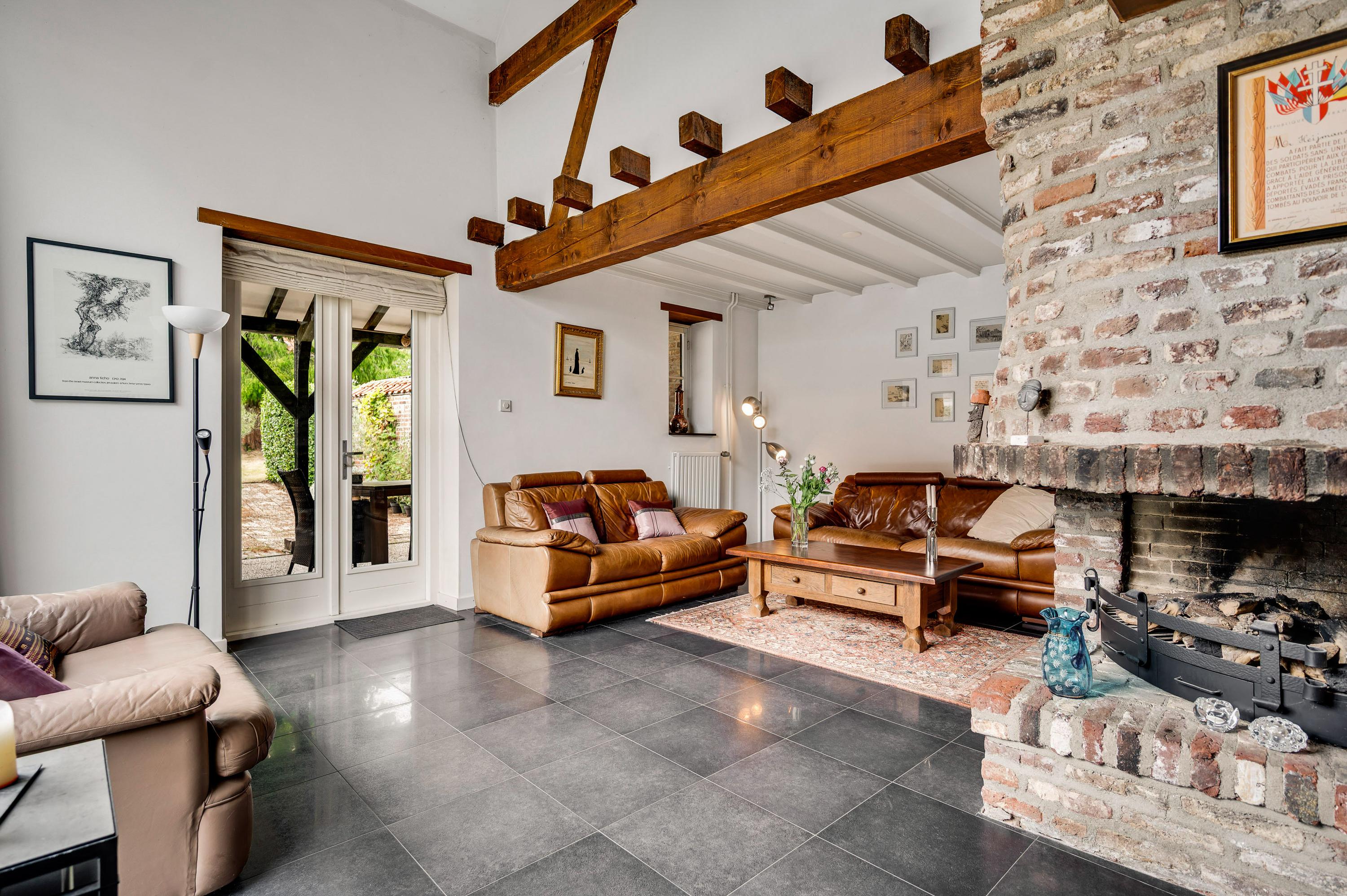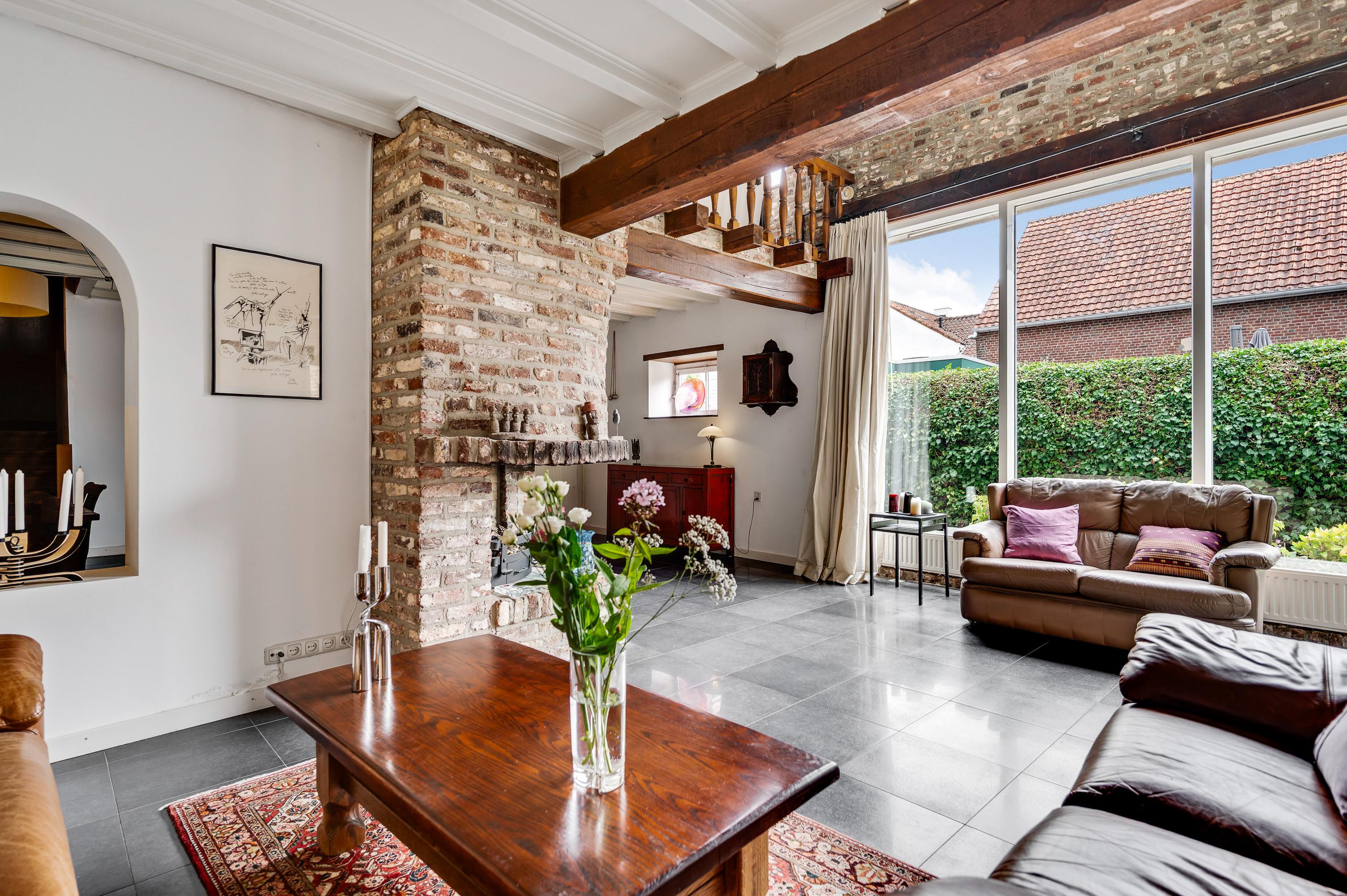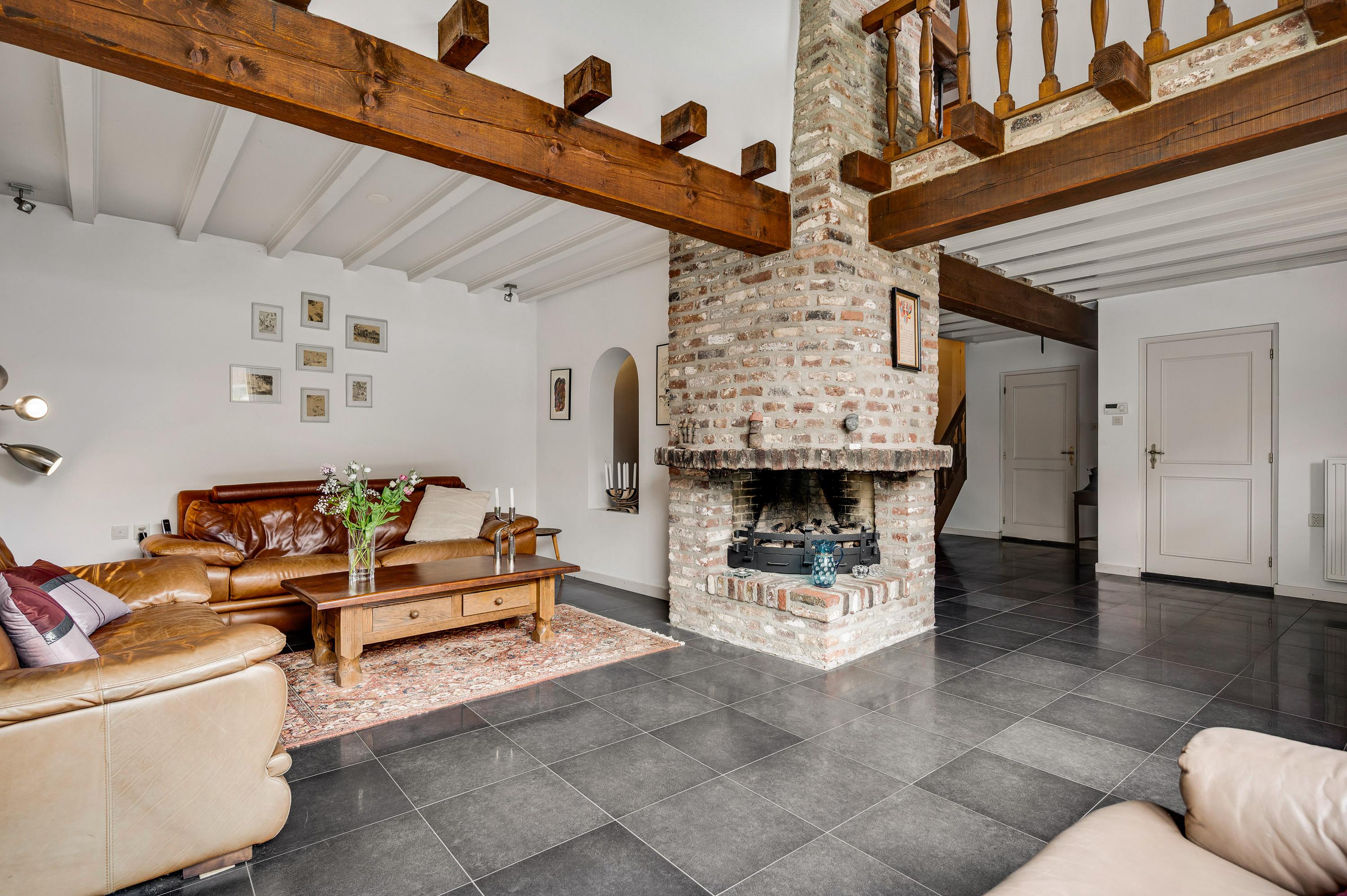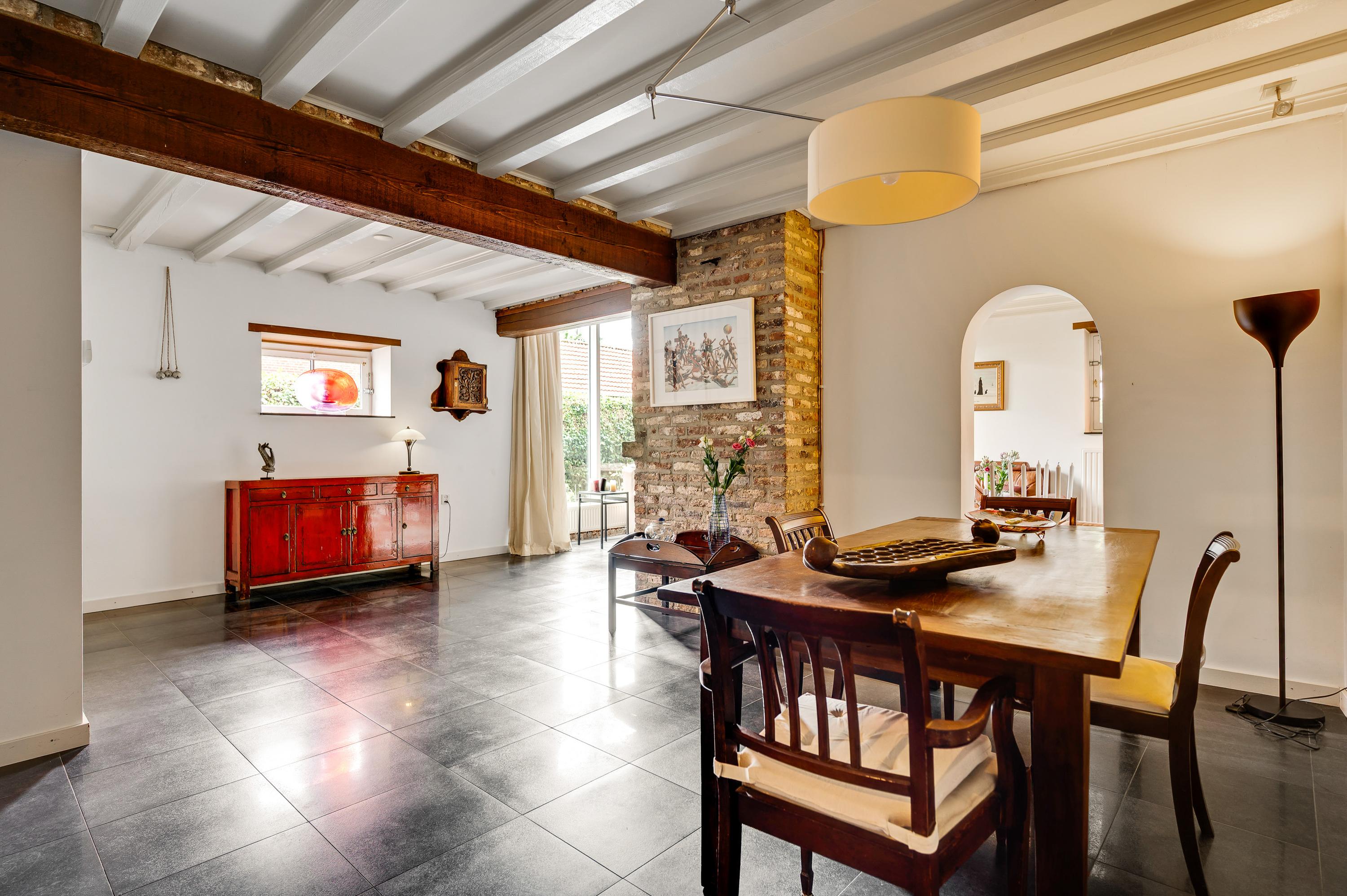 The spacious and bright living room (approx. 56 m²) offers excellent access to the garden thanks to large windows at the side and double doors at the rear. The living room is divided into a cozy sitting area with a fireplace and a separate dining area, ideal for dinners with family and friends. The modern floor tiles and sleek plastered walls give the space a timeless look.