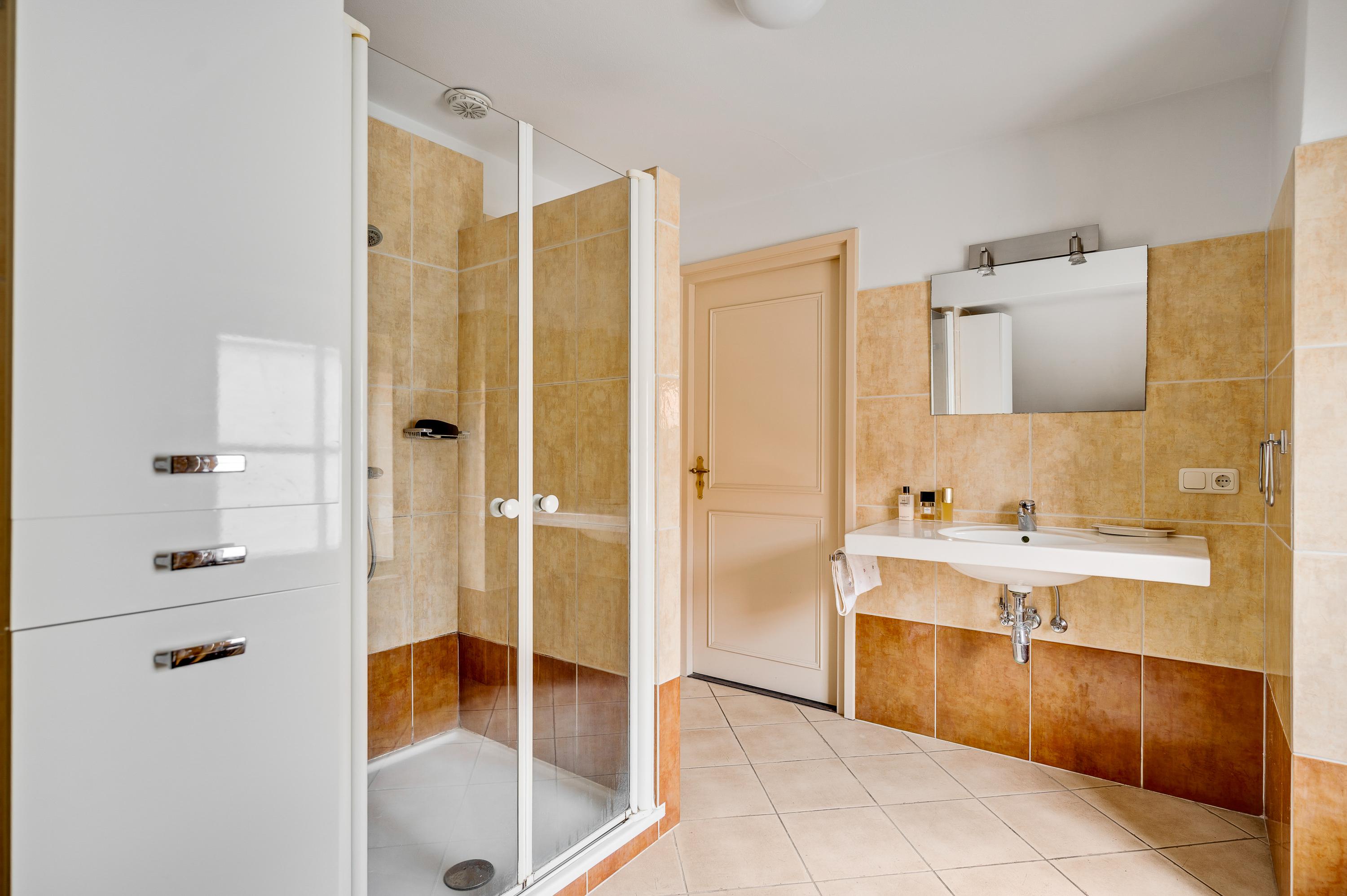 Also on the ground floor are an additional bedroom and a second bathroom with a shower and sink.
