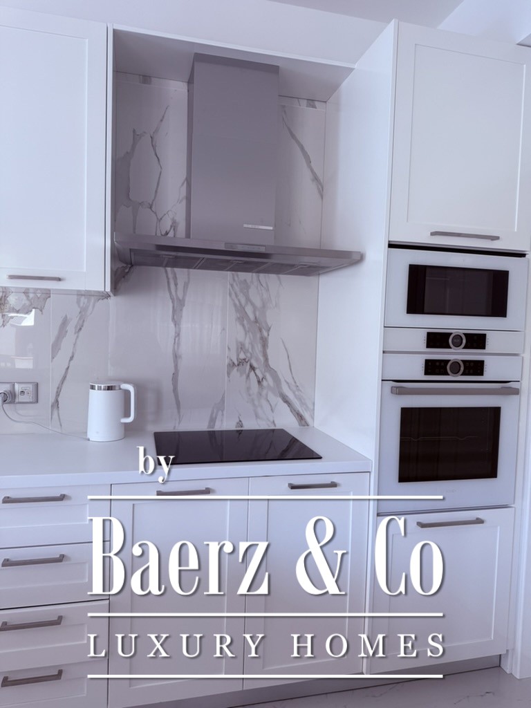The fully furnished villa spans three levels with a 214 m² internal area on a 463 m² plot. Renovated in 2024, its five-bedroom layout includes five bathrooms and a guest WC. Four bedrooms reside on the second floor while the expansive master suite, complete with en-suite bathroom and a private storage room, occupies the top level. The kitchen faces the landscaped garden, complementing a separate dining area and a cozy living room anchored by a steam fireplace. Materials are elegantly matched with tiles, marble, and laminate throughout.