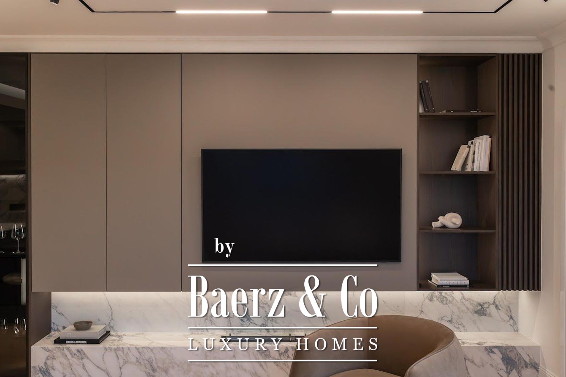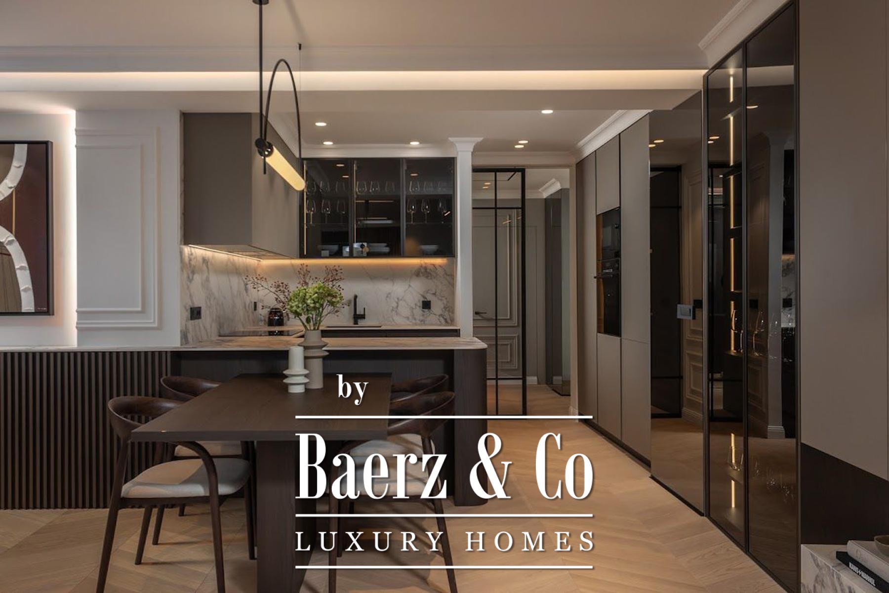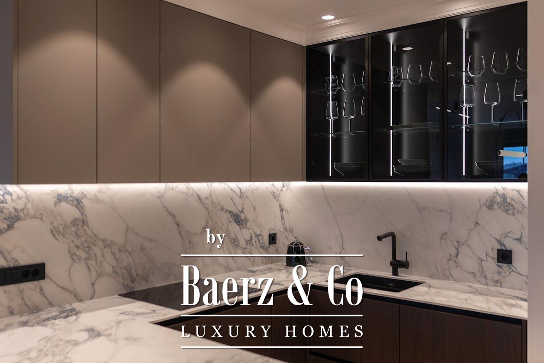 From the direct elevator entry connecting the underground garage to the private entrance, the penthouse signals rare intimacy and discretion. The residence features five bedrooms and five bathrooms, each with custom sanitary installations and underfloor heating. The living spaces are enveloped in light, with elegant Chevron Boen parquet, aluminum joinery, triple-glazed windows, and integrated LED illumination imparting a refined, welcoming ambiance.