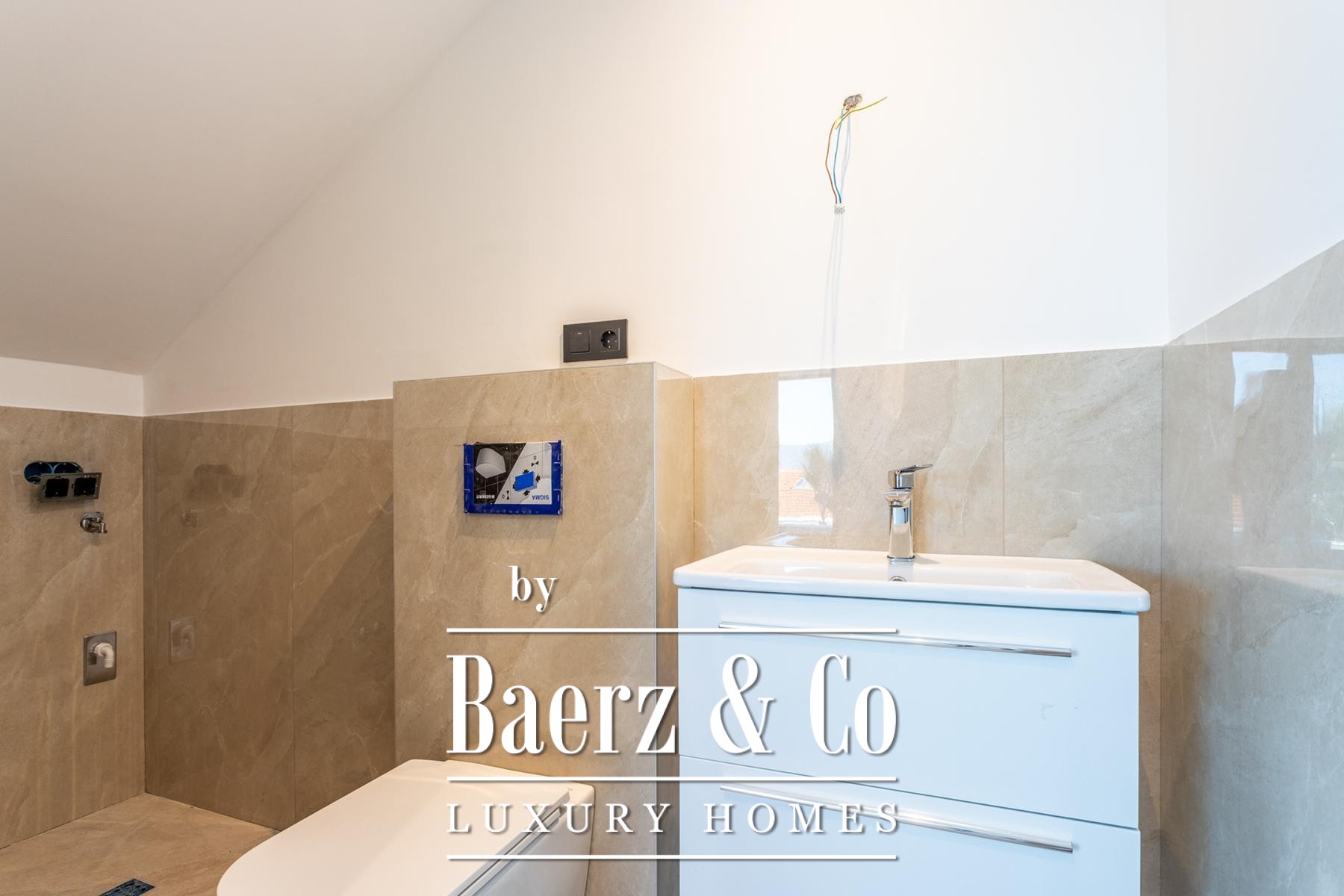 A hallway, guest toilet with laundry facilities, and a flex room—suitable as an office, gym, or playroom—complete the main level’s considered layout. Upstairs, three bedrooms each feature en-suite bathrooms and full glazing, presenting panoramic Adriatic views at every glance.