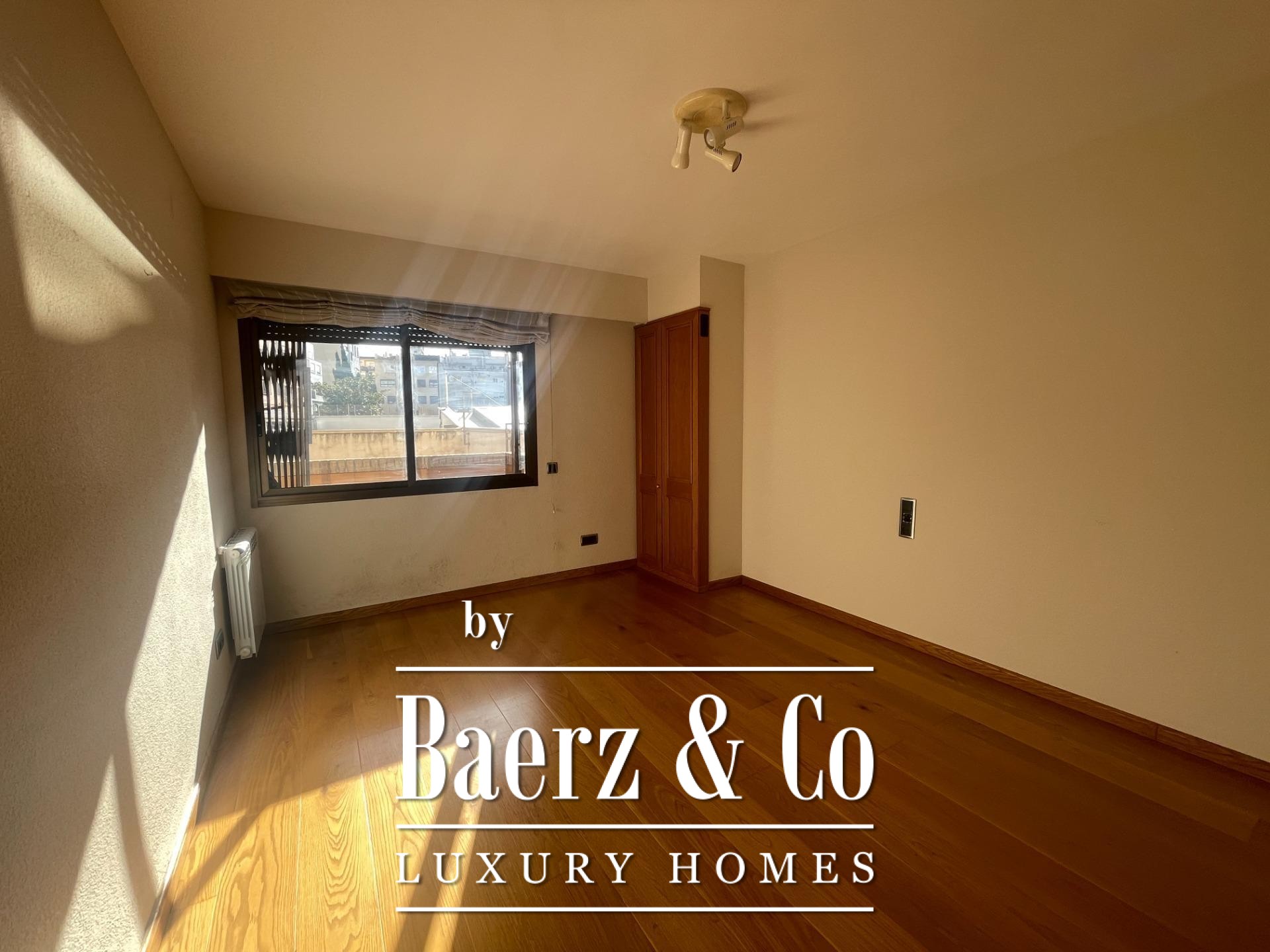 The kitchen is both spacious and functional, offering room for informal dining and access to an interior terrace. Marble floors accentuate the entrance and common areas, while oak and wooden floors in the living room and bedrooms bring warmth and subtlety. The apartment is fitted with ducted air conditioning for year-round comfort and features internal oak woodwork. A parking space in the building elevates convenience.