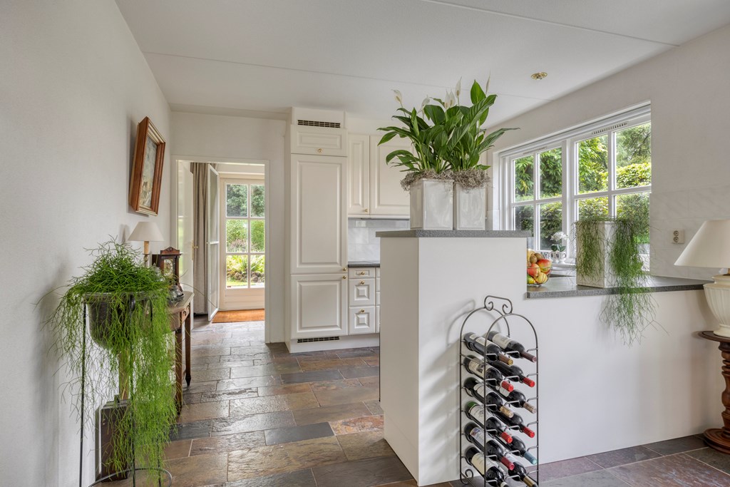 The garden all around is immaculately maintained. At the front, the wide driveway offers parking for multiple cars; under the carport your car is sheltered. From here you also have direct access to the garage, with overhead door and side door—a particularly spacious and multifunctional area of no less than 57 m². Ideal for daily use, safely storing bicycles, carrying out DIY projects, or setting up a large work or hobby room with its own entrance. The rear garden is a delight: a large sun terrace with decorative paving, manicured lawn, a pond, and borders full of color and variety. Thanks to mature hedges, trees, and the woodland to the rear, you’ll enjoy peace and privacy. Whether you want to have breakfast outdoors, read under the tree, or host guests on a summer evening—you can do it all here. With direct access from the living room, utility room, and garage, the garden is also extremely practical in layout.