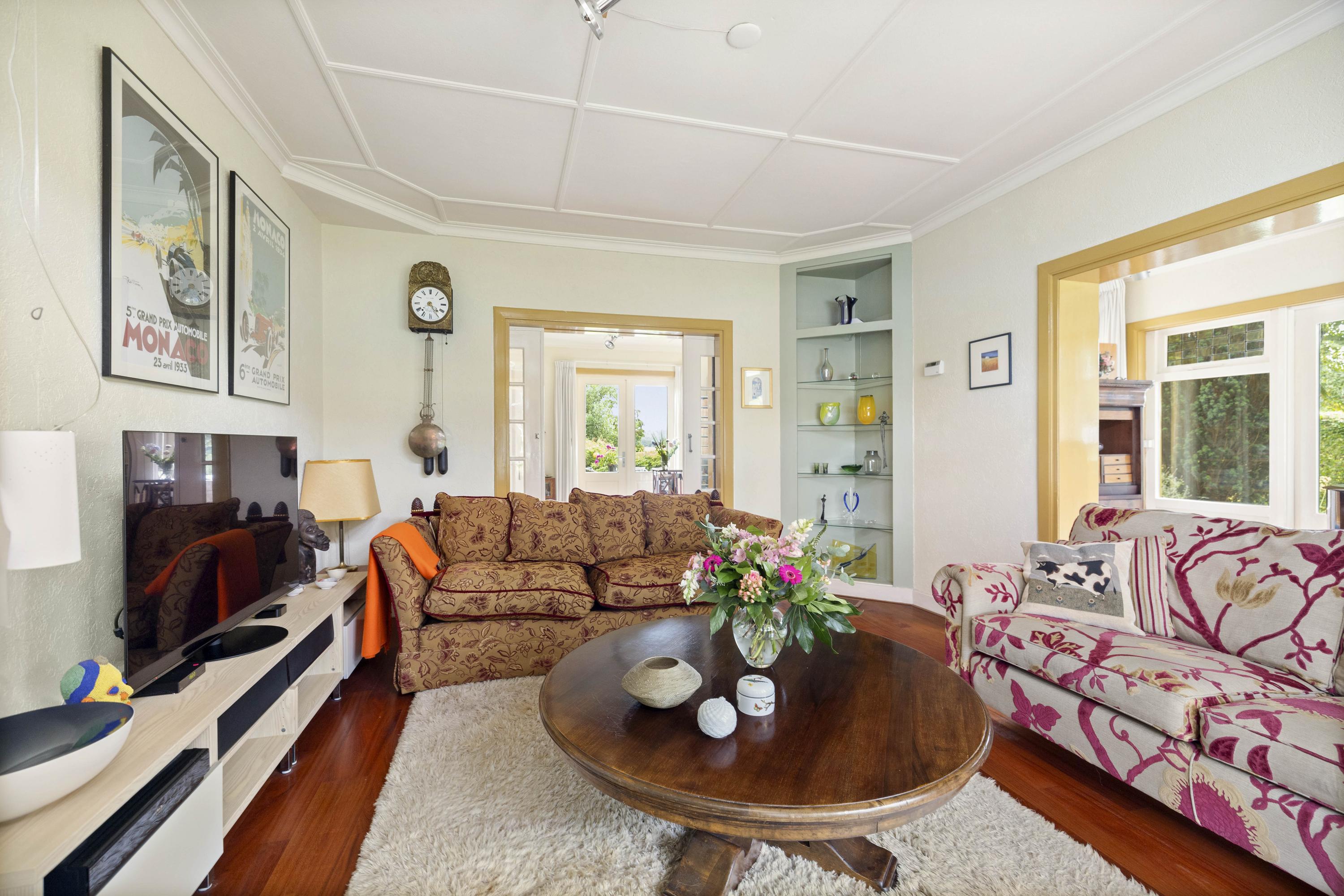 On the right-hand side is a lovely lounge with a fireplace and the conservatory – now used as a music room – with its characteristic pentagonal window and French doors to the garden. En suite is a library with French doors to the rear sun terrace.