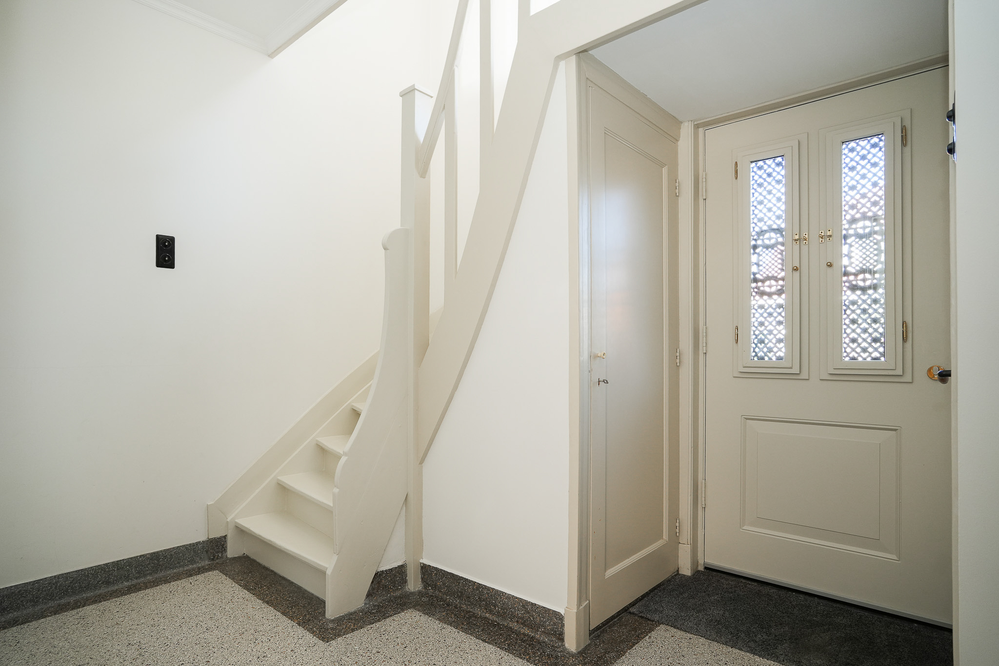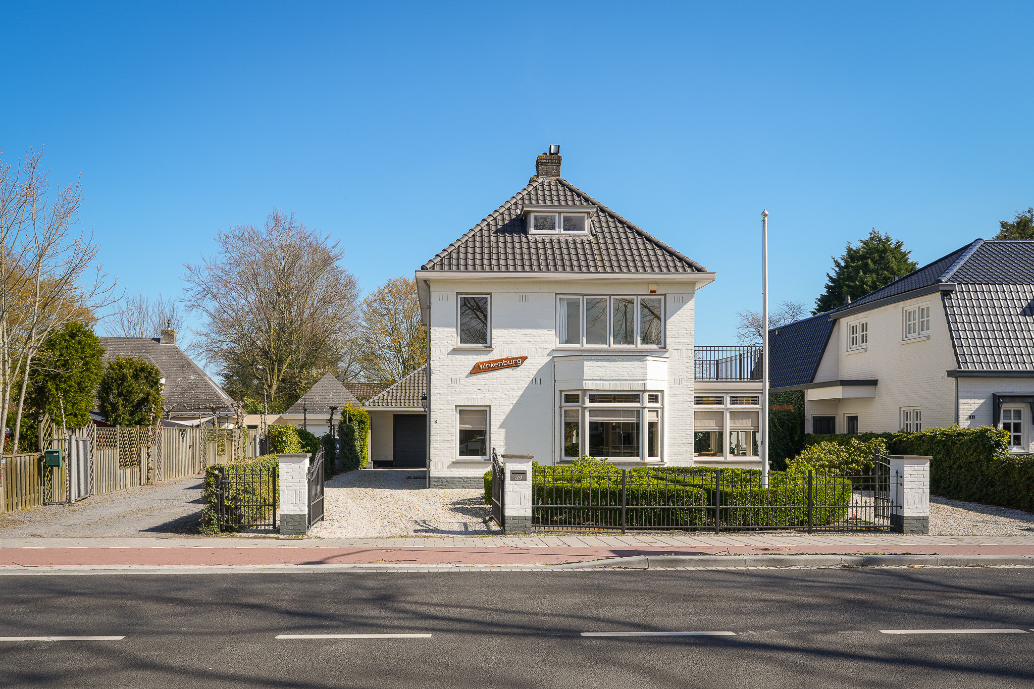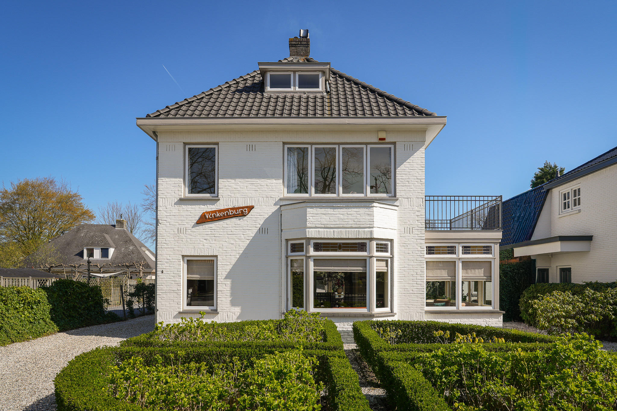 This striking white villa, named Vinkenburg, was built in 1929 to a design by municipal architect De Groot. Characteristic features from the period have been carefully preserved, including the wide overhangs, bay window, conservatory, stained-glass transoms and panelled doors with traditional ironmongery.