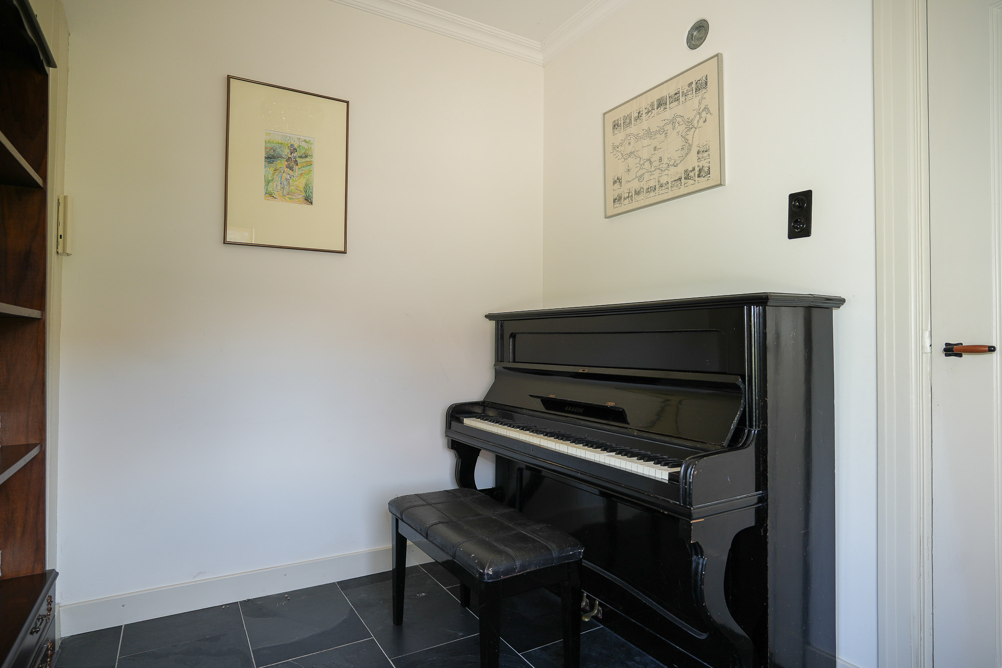 The original main house comprises a total of five bedrooms, three of which are located on this floor. Two are currently used as bedrooms and one as a study. One of the bedrooms provides access to the balcony above the conservatory. These rooms share a second fully fitted bathroom with bathtub, shower cabin with rainfall shower and a double vanity unit. A large roof window provides pleasant natural light. The entire floor is finished with a herringbone PVC floor.