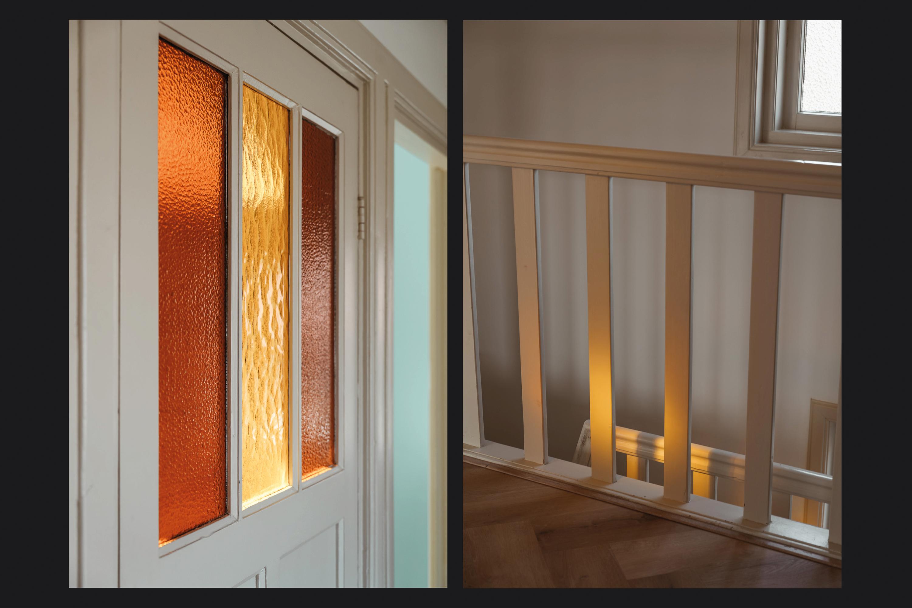 Double en suite doors with stained glass, flanked by built-in cupboards, lead to the rear room, which connects directly to the kitchen-diner. This kitchen-diner is located in the extension completed in 2021/2022 and is fully oriented towards the garden. It forms the heart of the home, with views of the garden and direct access outside.