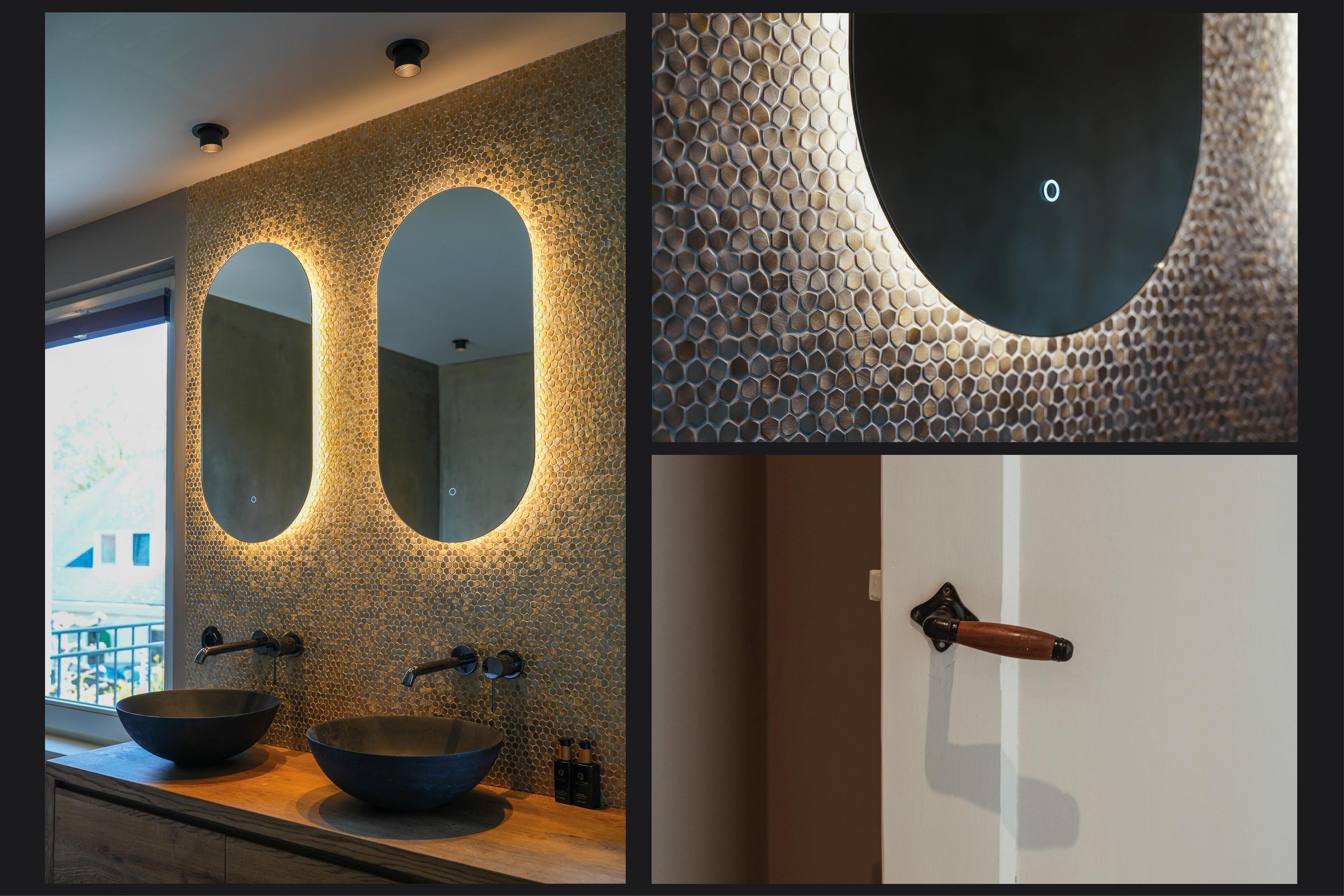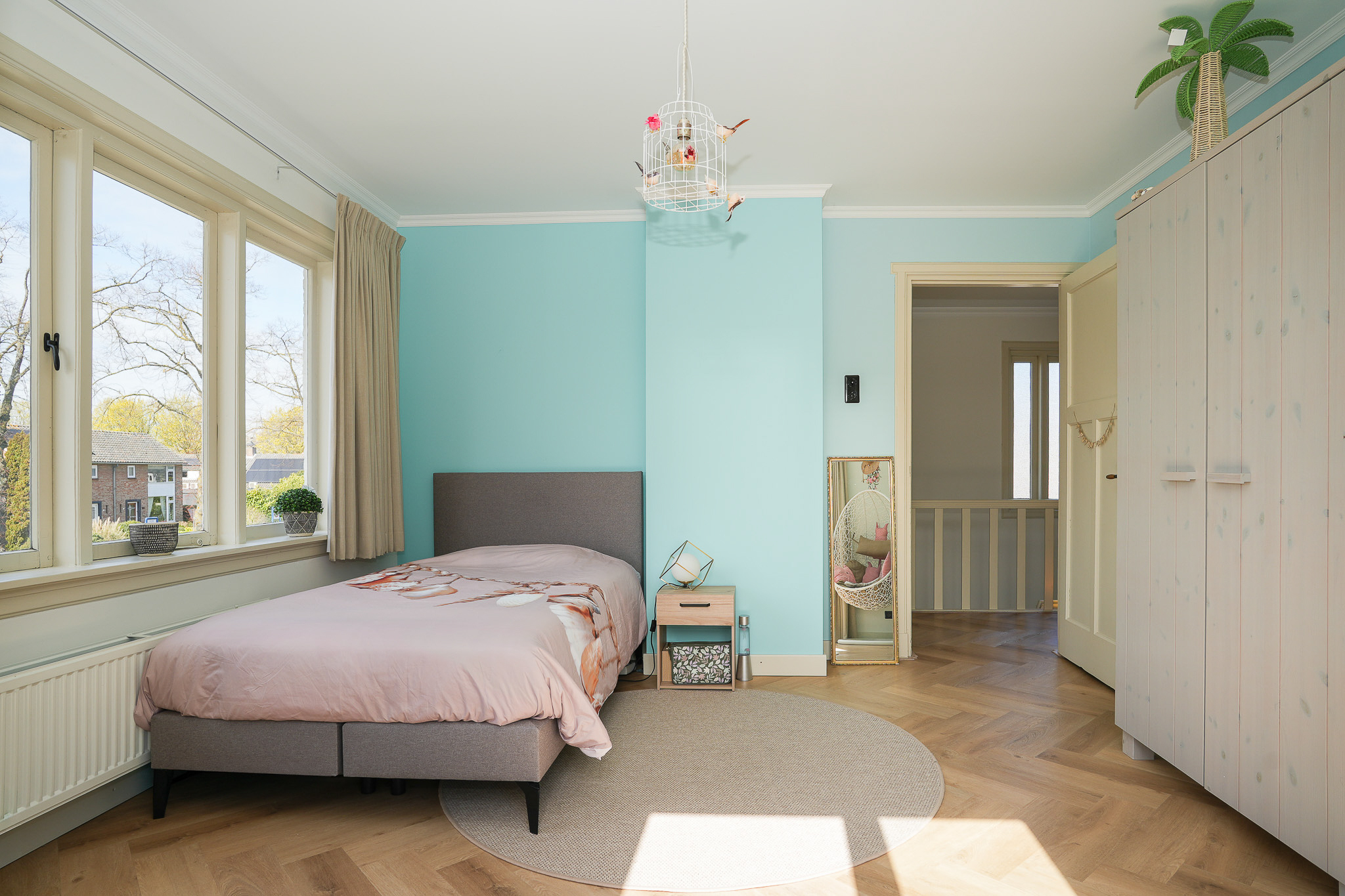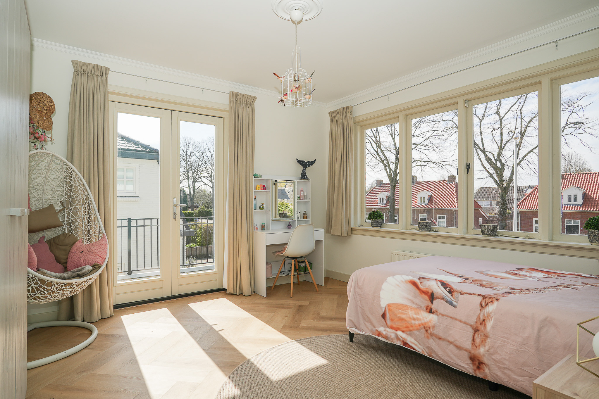 The landing reflects the care and attention given to the renovation. The new extension blends seamlessly with the original architecture. There is also a separate toilet on this level. In the rear extension is a bedroom with balcony, a luxurious open bathroom and a walk-in closet. The bathroom is fitted with a semi-freestanding bathtub, a spacious walk-in shower with rainfall shower and a stylish vanity unit. The wall behind the vanity is finished with hexagonal mosaic tiles, while the shower and bath areas feature concrete ciré finishes. Thanks to its east-facing position, the morning sun enters here, and the balcony is directly accessible from the bedroom.