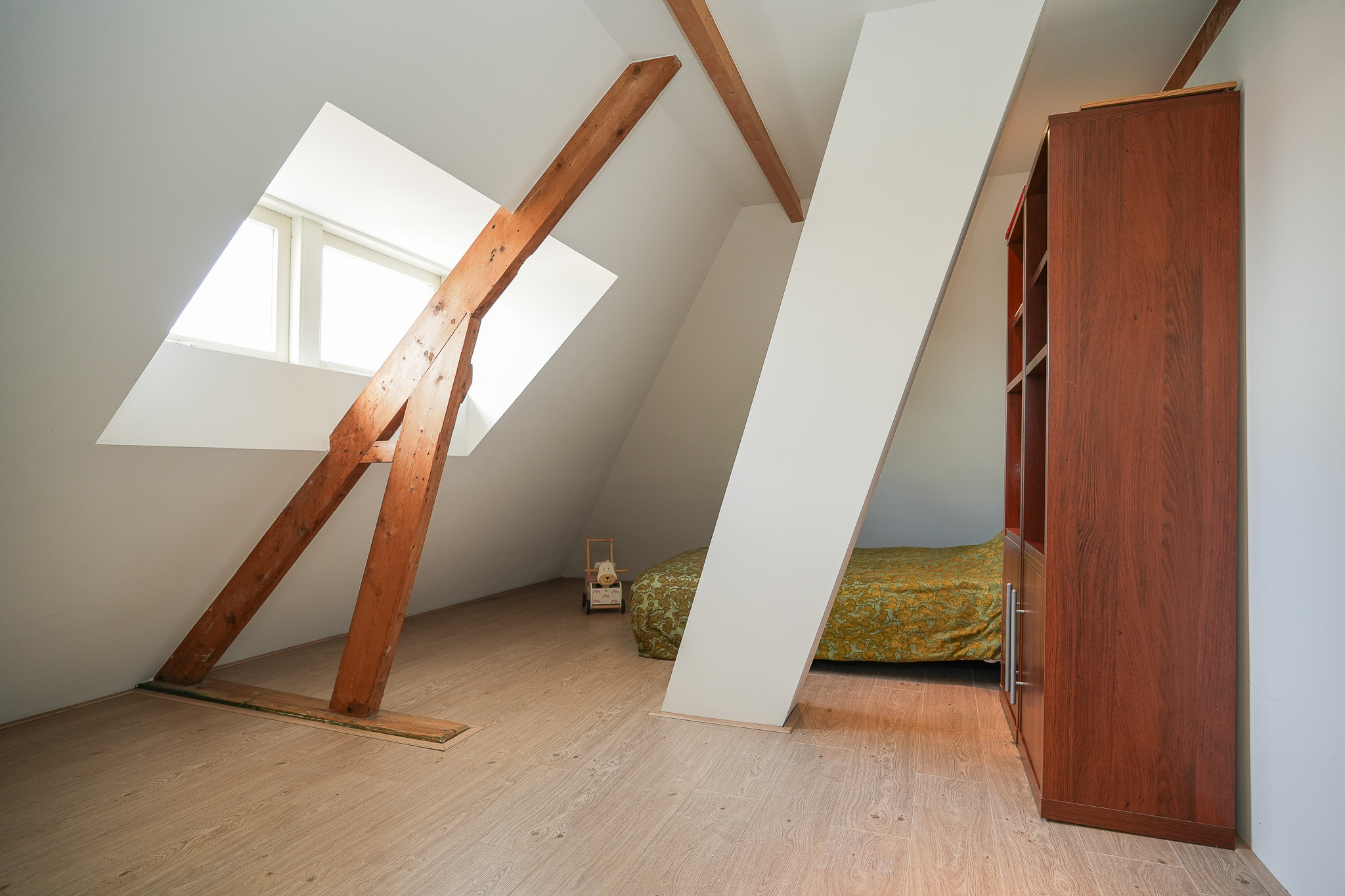 This floor offers two additional bedrooms, both located beneath the insulated roof and finished with smooth plasterwork. The front bedroom features a wide dormer window, while the rear bedroom is fitted with two roof windows. The floor is finished with PVC.