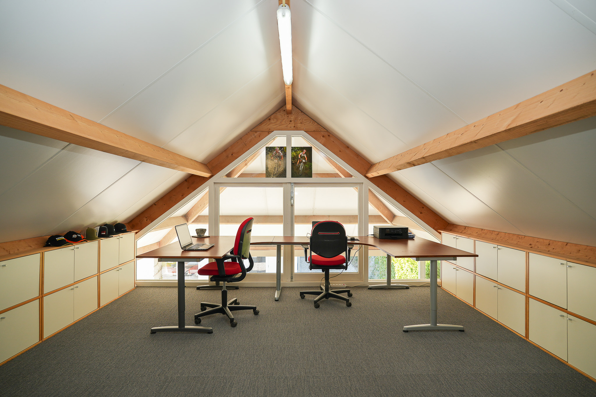 The outbuilding is therefore highly suitable for use as a studio, workspace or guest accommodation. The upper floor is accessed via a fixed staircase and offers a pleasant, light workspace beneath the roof, which can be heated electrically.