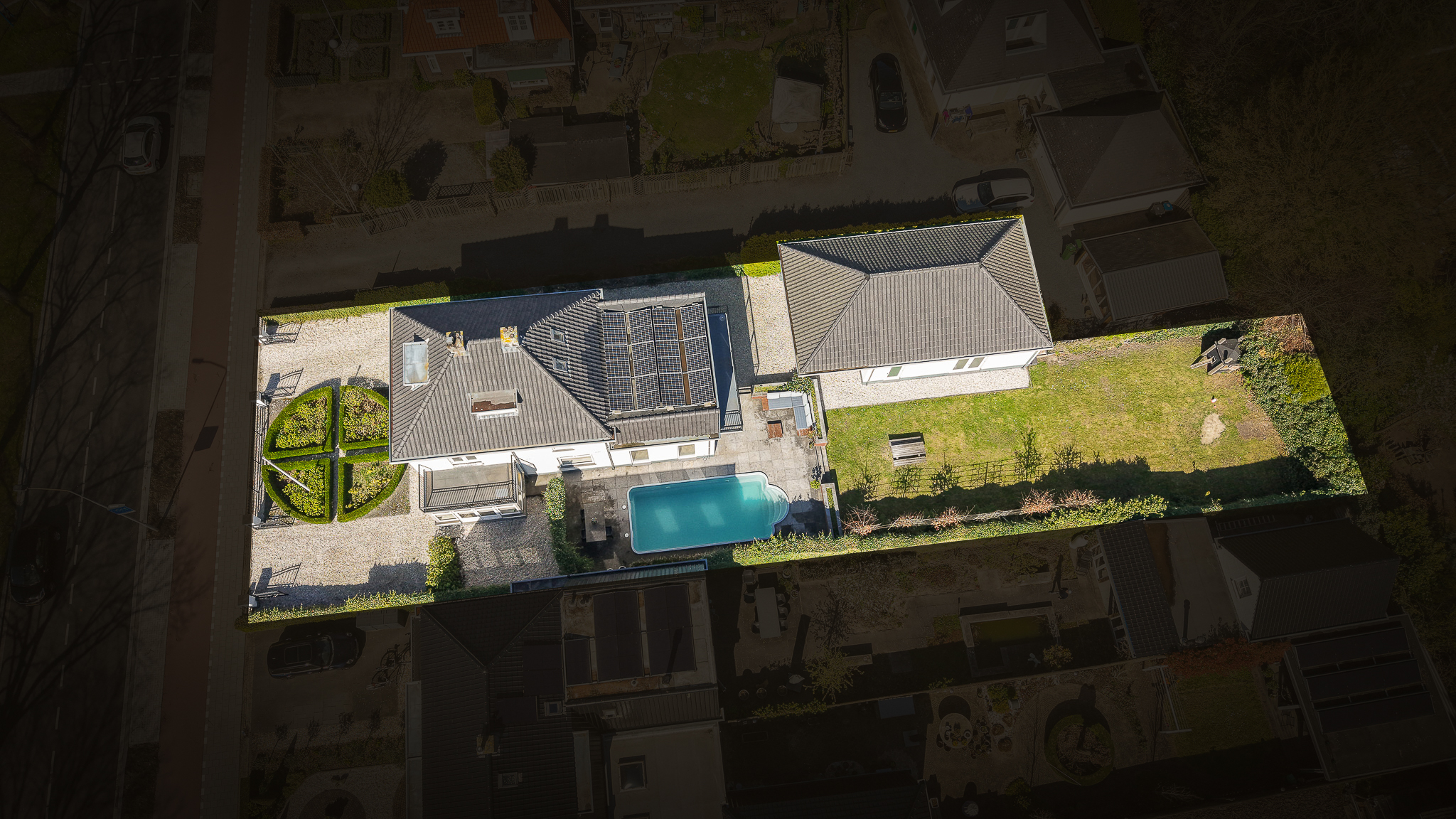 The electrical installation has been completely renewed, incorporating retro-style switches combined with Philips Hue lighting. Twelve solar panels have been installed on the flat roof, and the main roof was fully renovated in 2024, including new battens and tiles. The zinc work had already been renewed the year before.