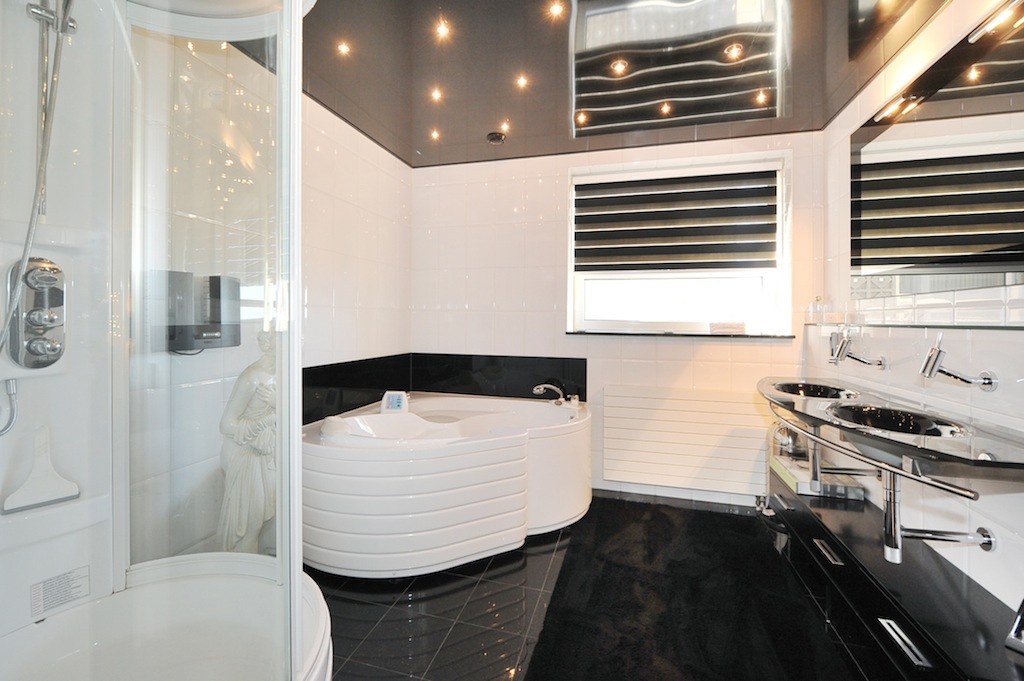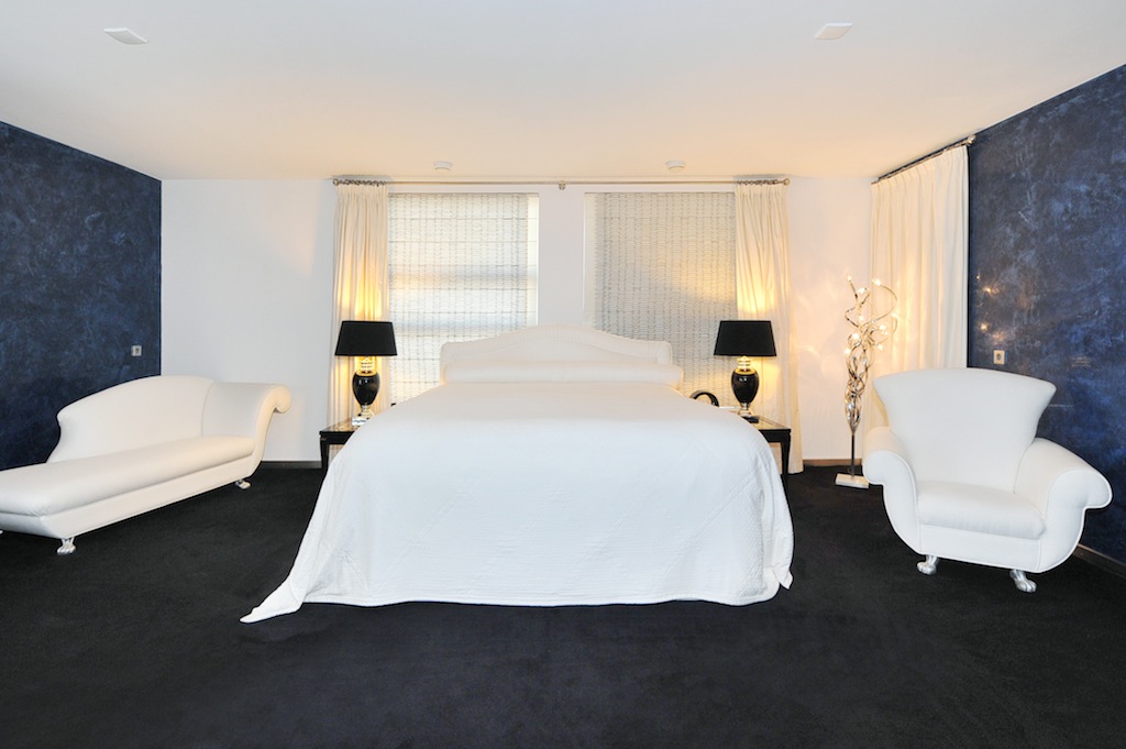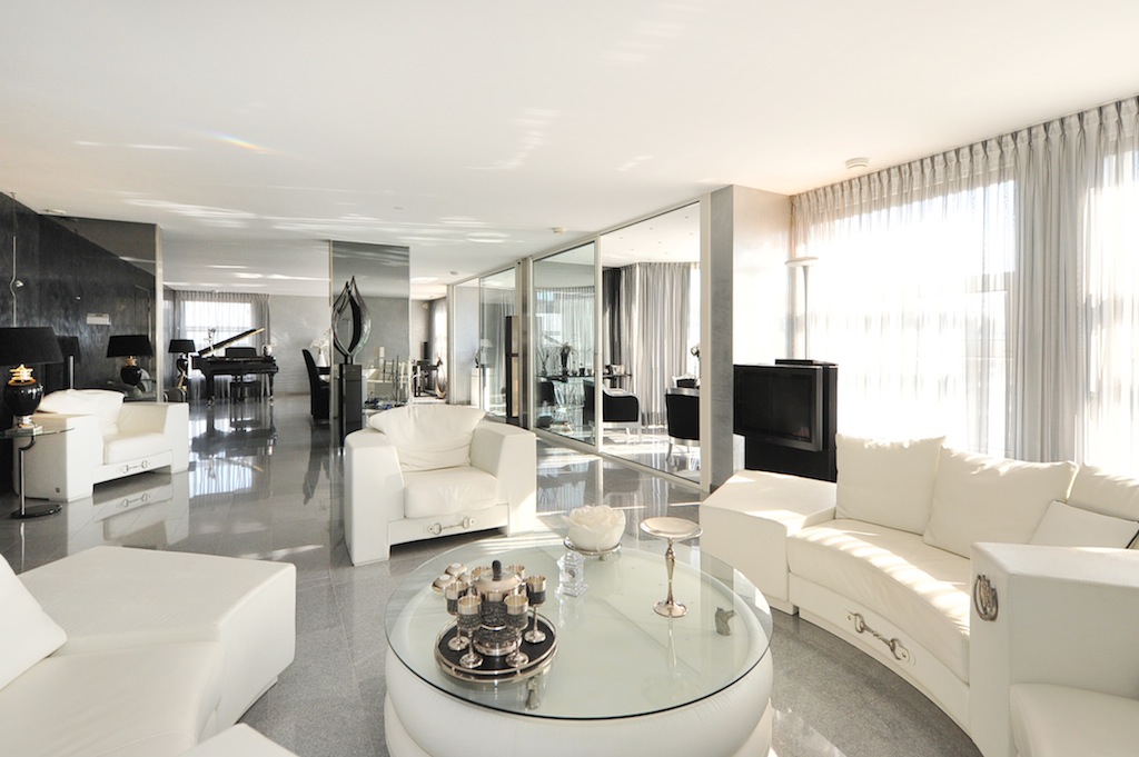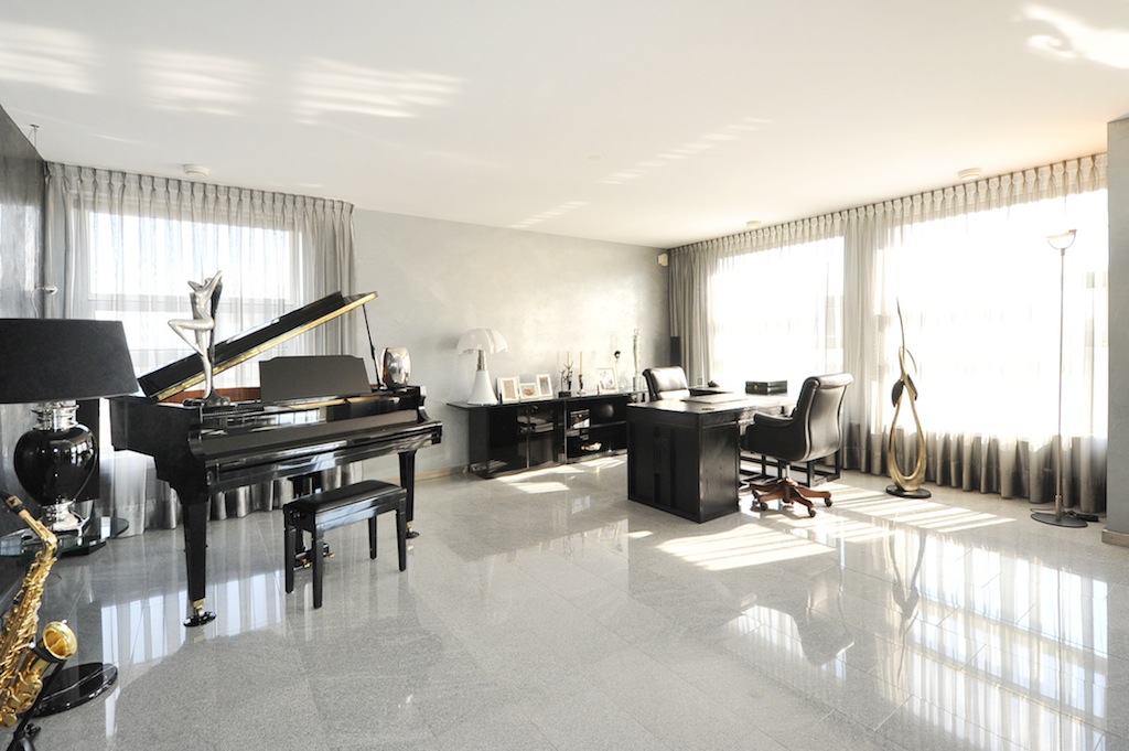 10e verdieping: eigen entree, ruime hal met garderobe, twee separate toiletten, royale slaapkamer (voormalig twee slaapkamers) met toegang naar eigen badkamer voorzien van ligbad, douche en toilet, dichte keuken met hoek opgestelde keukeninrichting en diverse inbouwapparatuur, zeer ruime living met grote raampartijen en twee aangrenzende en halfronde serres, de living is voorzien van een fraaie Chinees travertinvloer, middels een aangrenzende gang heeft u toegang naar een aparte kleedruimte, een tweede badkamer met ligbad, aparte douche en wastafel, een bergruimte met opstelplaats c.v.-combiketel en aansluiting wasmachine en droger, een aparte sauna en een tweede ruime slaapkamer.