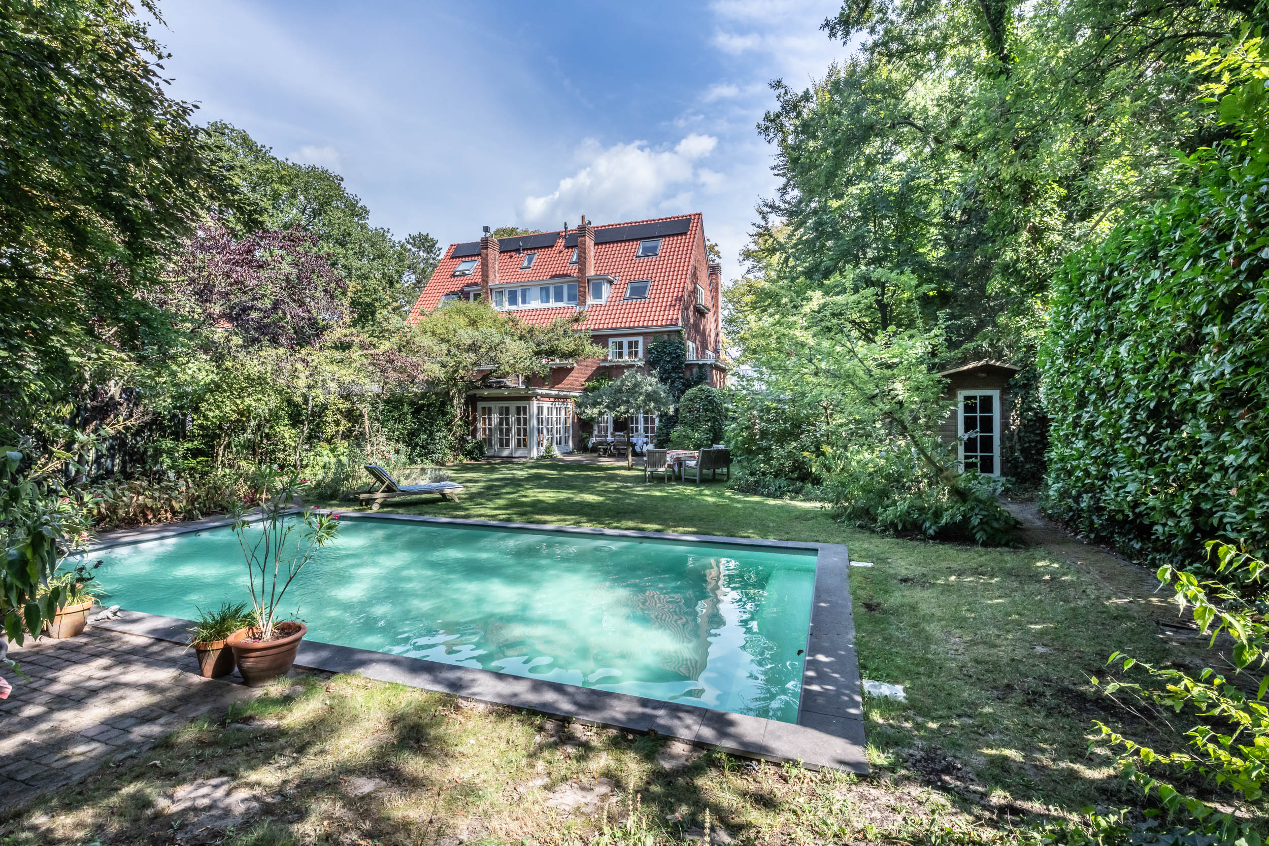 Aan de groene en rustige Grenslaan ligt deze goed onderhouden half vrijstaande karakteristieke, onder architectuur gebouwde villa met zwembad en garage op een groot perceel van ruim1000m2. Alle woonvertrekken liggen prachtig op de zon (west- en zuidzijde). Een familiehuis bij uitstek: 6 slaapkamers en 2 badkamers! Door de uitbouw (geheel in stijl met het hoofdhuis) aan de zijkant van het huis, is er veel ruimte op de begane grond gecreëerd voor bijvoorbeeld een speelkamer, tv-kamer of werkkamer. De fraai aangelegde tuin heeft meerdere terrassen, een zonnige ligging op het westen en biedt alle privacy! Aan de achterzijde van de tuin, waar het perceel grenst aan de Wikkelaan, is parkeergelegenheid voor twee auto’s op eigen grond en een eigen laadpaal. In de tuin zijn diverse opstallen: een houten vrijstaande schuur in de achtertuin en een garage.