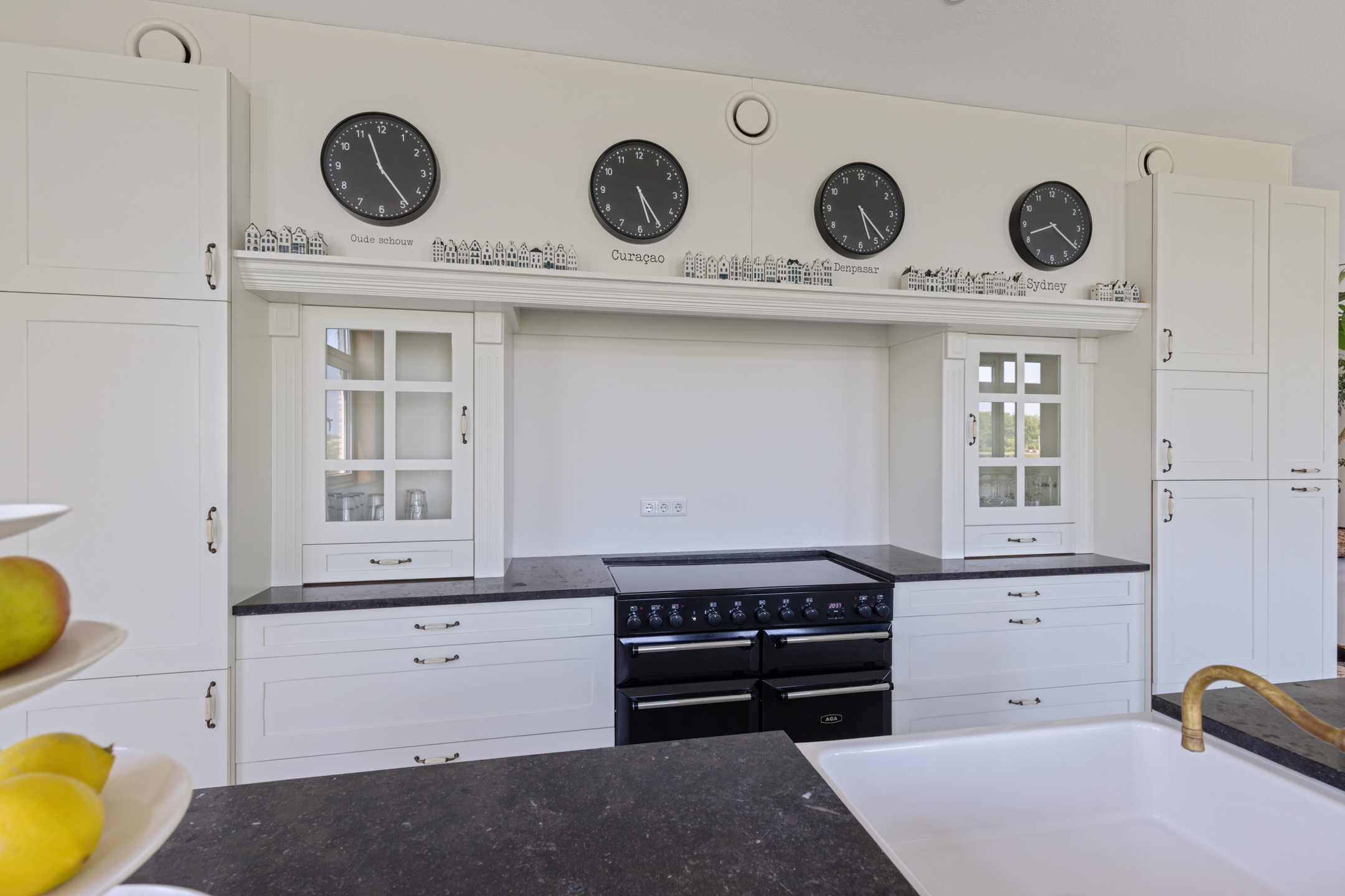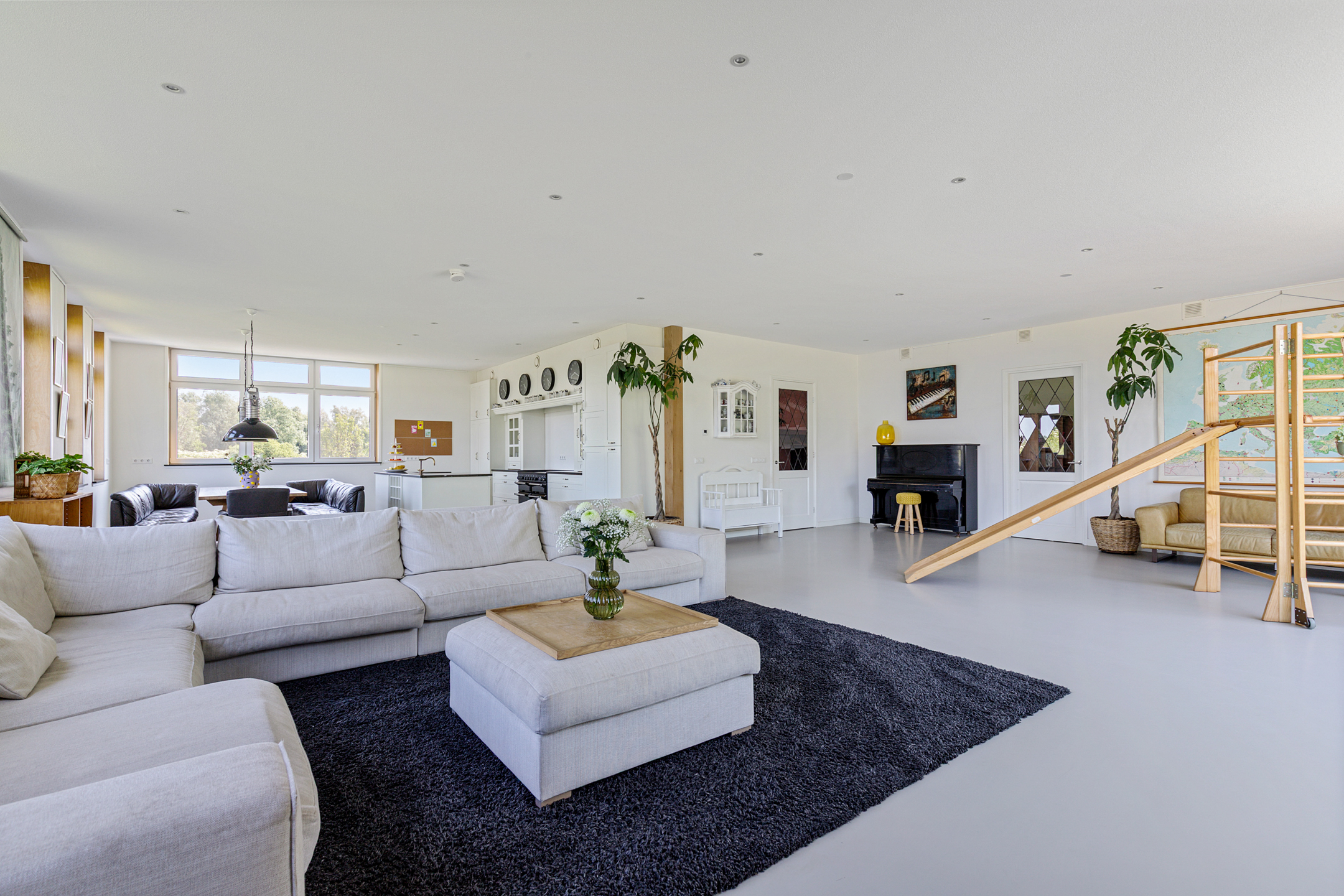 De living is een oase van licht, ruimte en uitzicht. Hoge schuifpuien zorgen voor een naadloze overgang naar terras en tuin, met directe zichtlijnen op het water en de groene omgeving. De open keuken met spoeleiland en veel kastruimte vormt het hart van de woning: hier dineert u met vrienden en familie terwijl u uitkijkt op een wisselend schouwspel van zeilboten en sloepen.