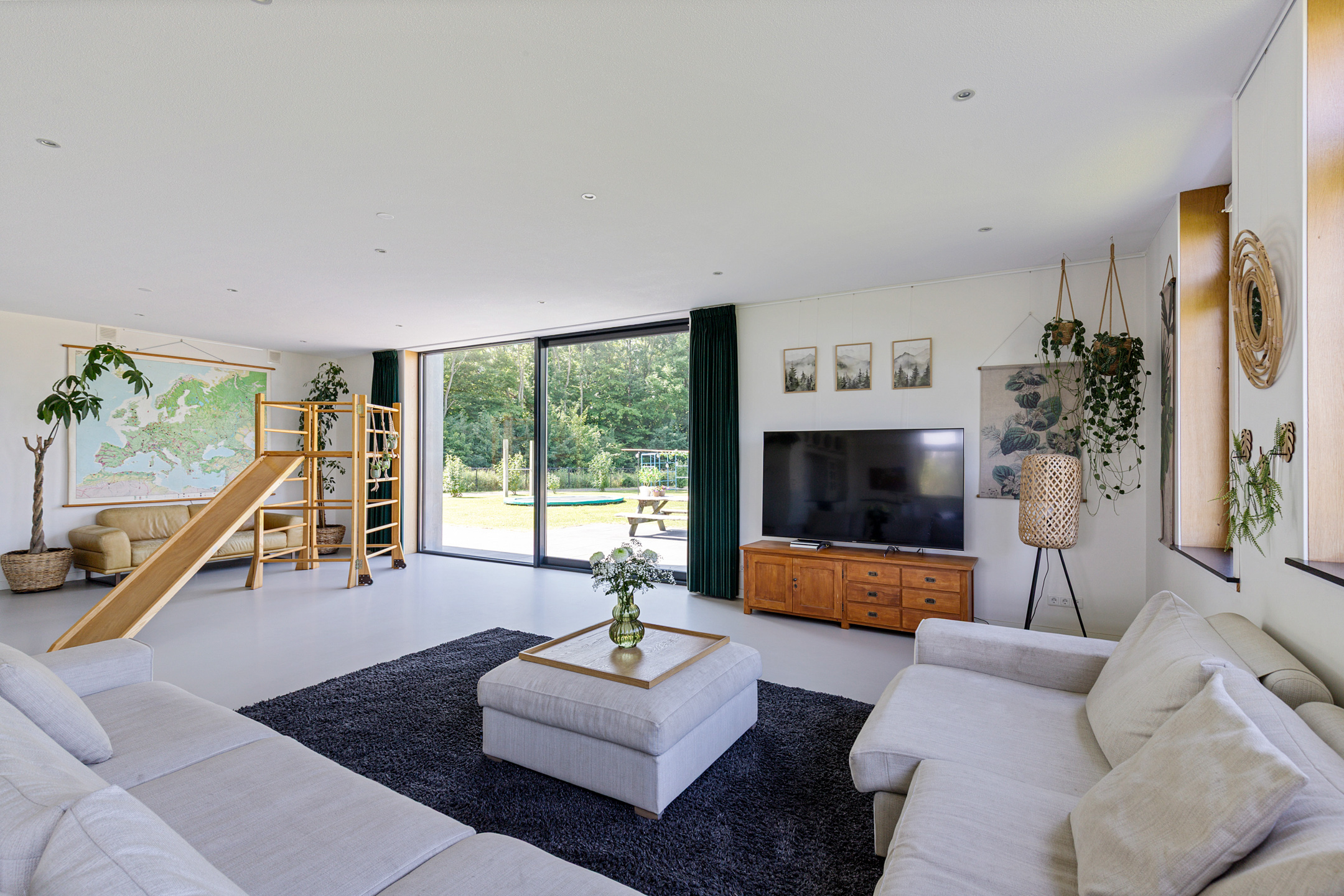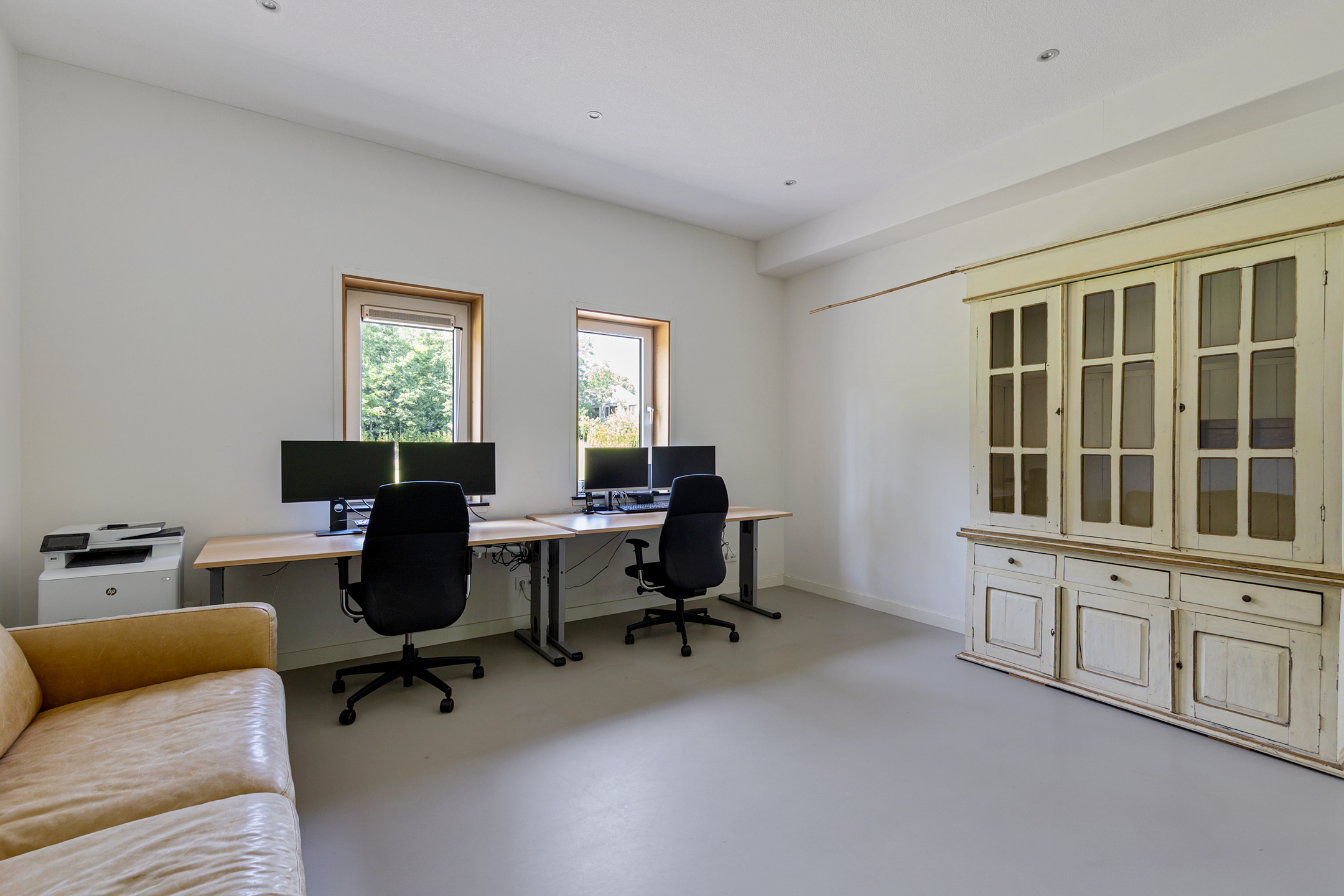 Grenzend aan de woonkamer bevindt zich een kantoor- of speelkamer met zicht op de tuin. De ruime bijkeuken is praktisch ingedeeld en voorzien van witgoedaansluitingen.