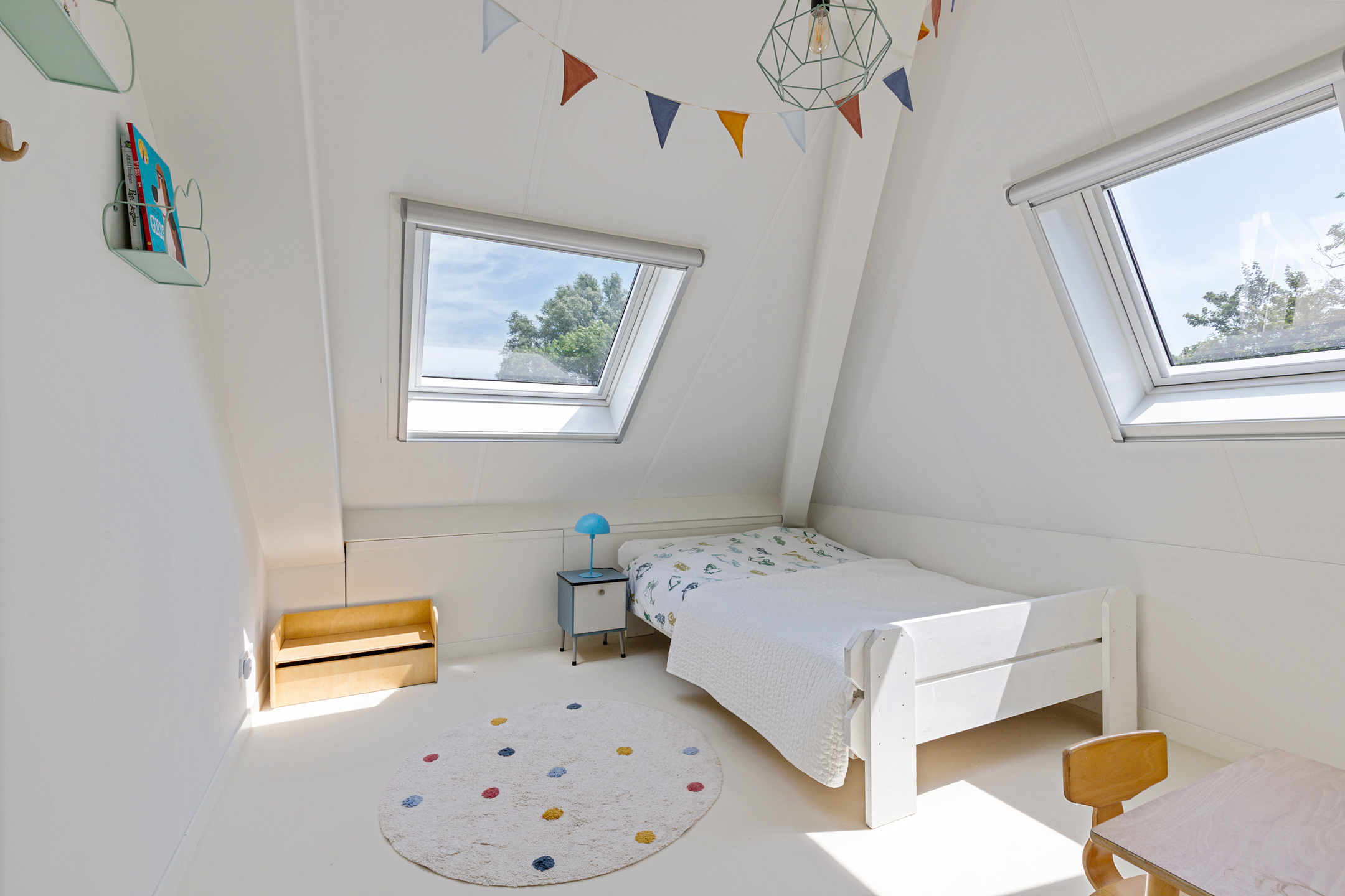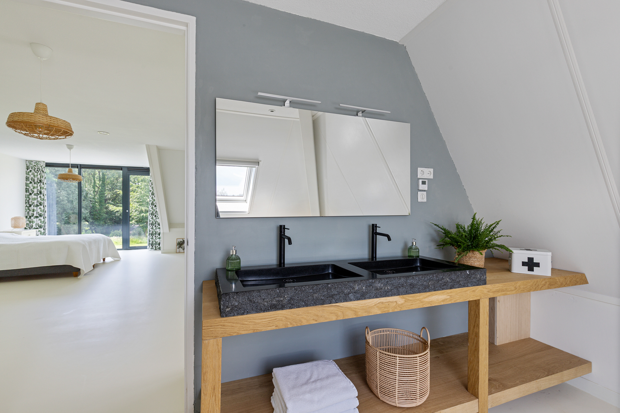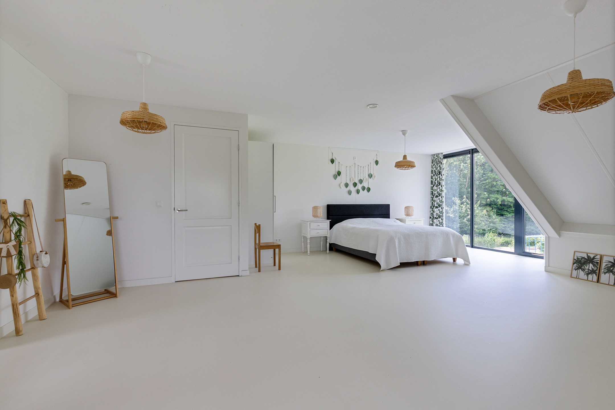 De master bedroom is een ware privésuite (46m2) met panoramisch uitzicht op het water via kamerhoge ramen in het zinken risaliet. Een extra dakkapel biedt zicht op het naastgelegen natuureiland. De luxe en-suite badkamer is voorzien van een vrijstaand ligbad, dubbele wastafel, toilet en inloopdouche. Hier wakker worden geeft elke dag energie.
