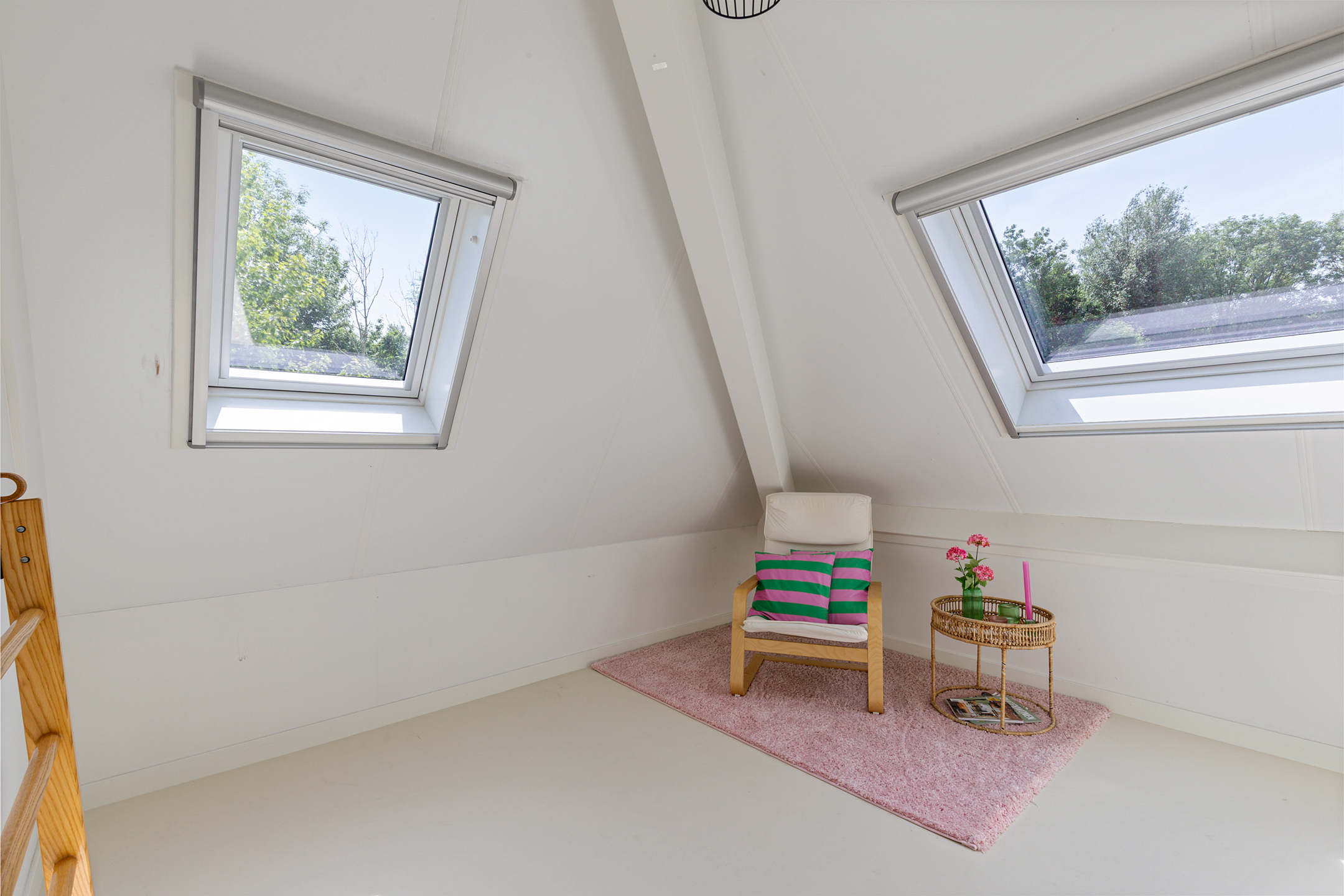 Via een vaste trap bereikt u de volledig geïsoleerde zolderverdieping met stahoogte over de volle lengte van de woning. Stoere stalen spanten en rustieke houten balken geven deze ruimte karakter. Met drie Velux dakramen is het hier licht en ruim. Ideaal als bergruimte of voor het creëren van extra woon- of werkvertrekken.