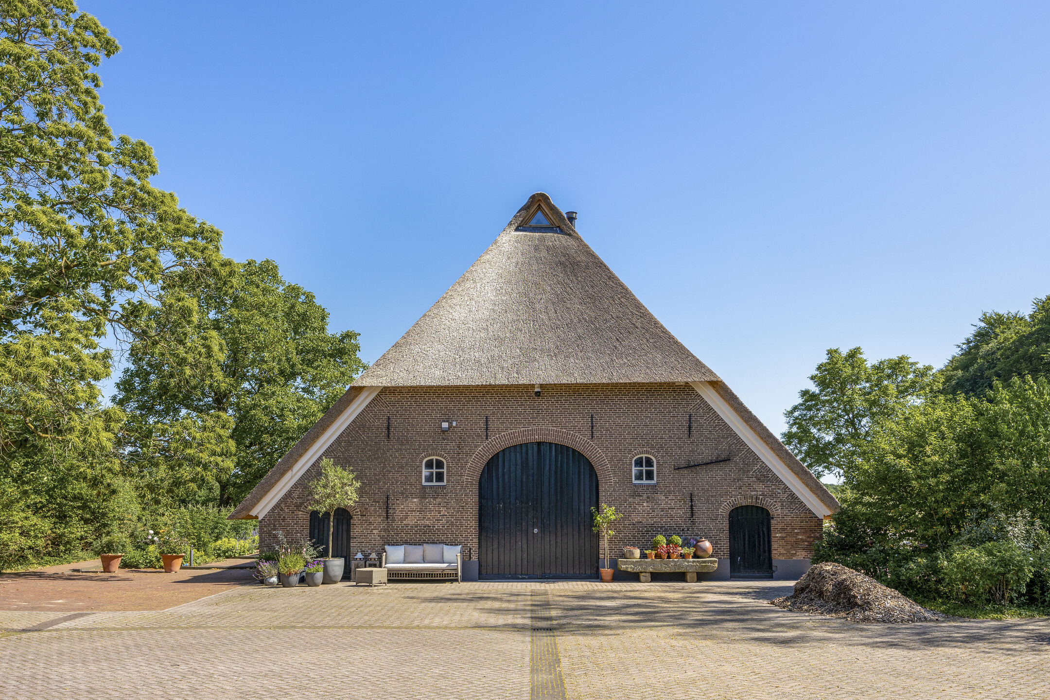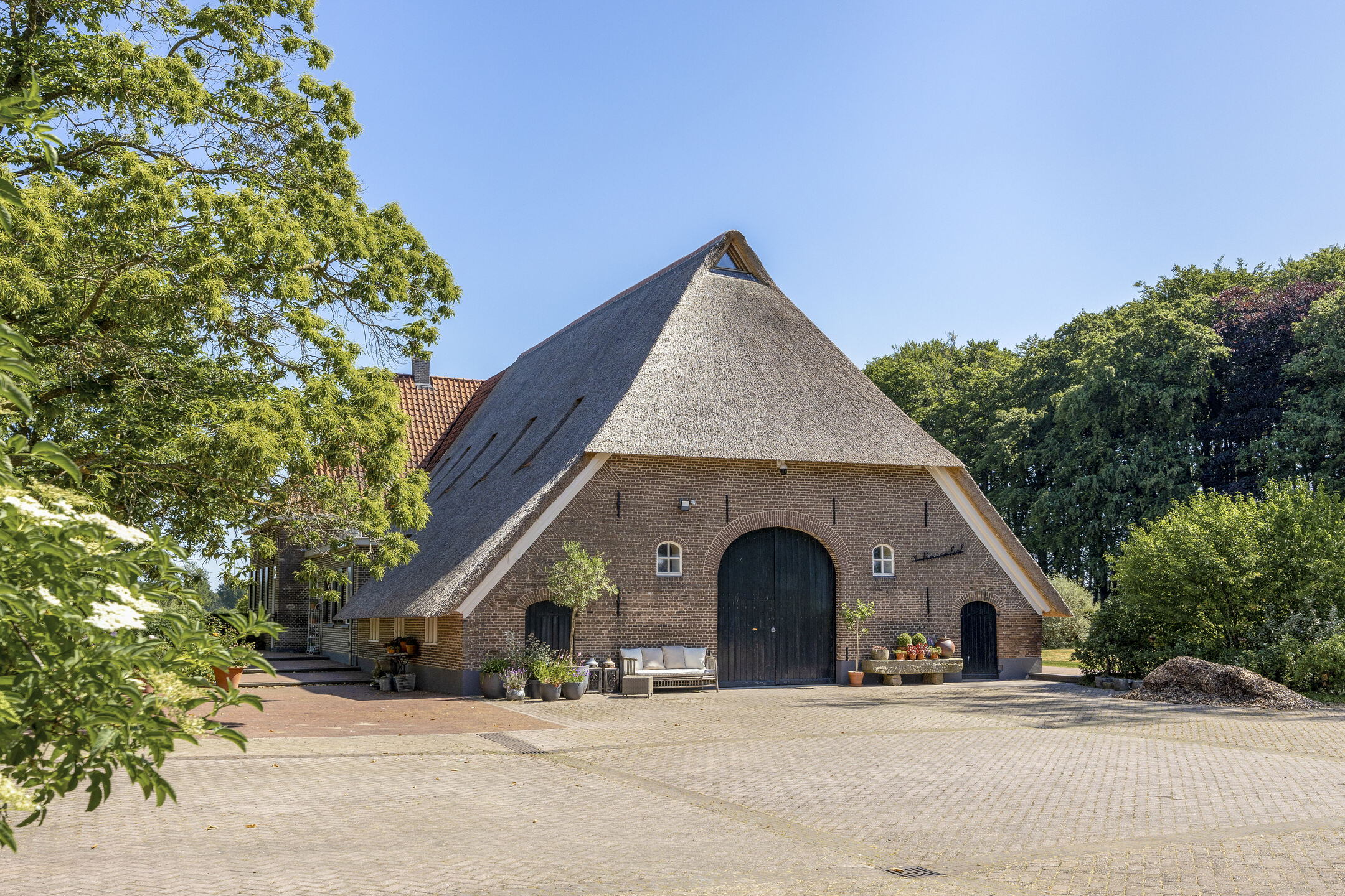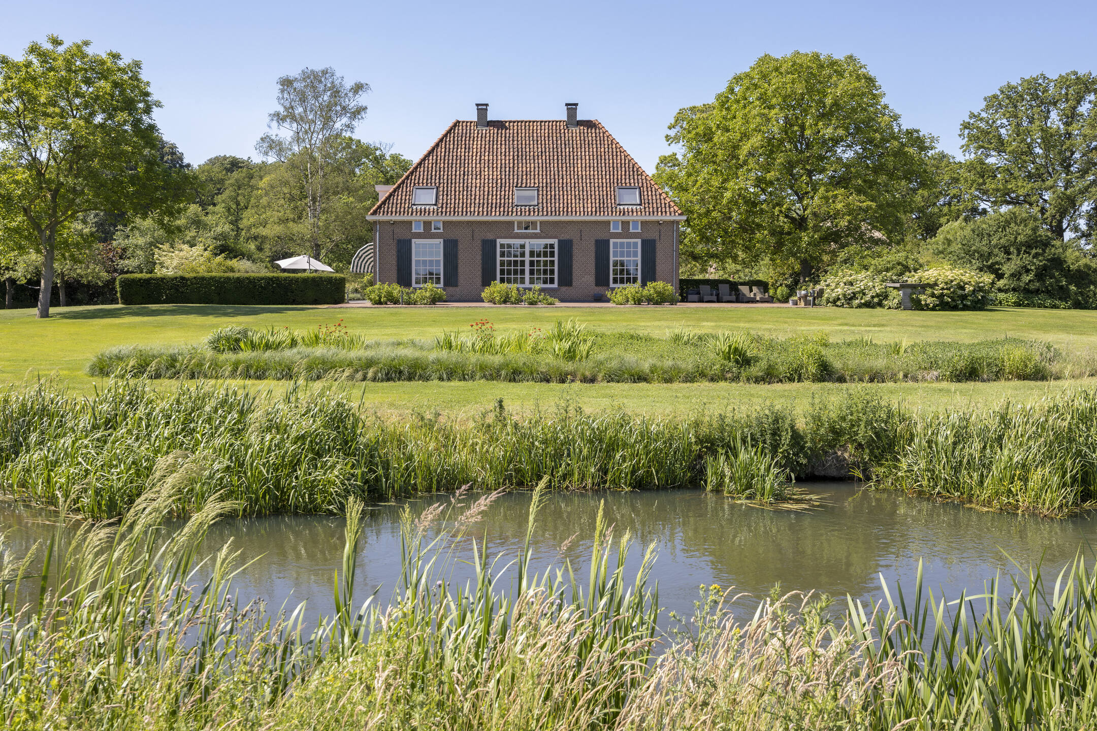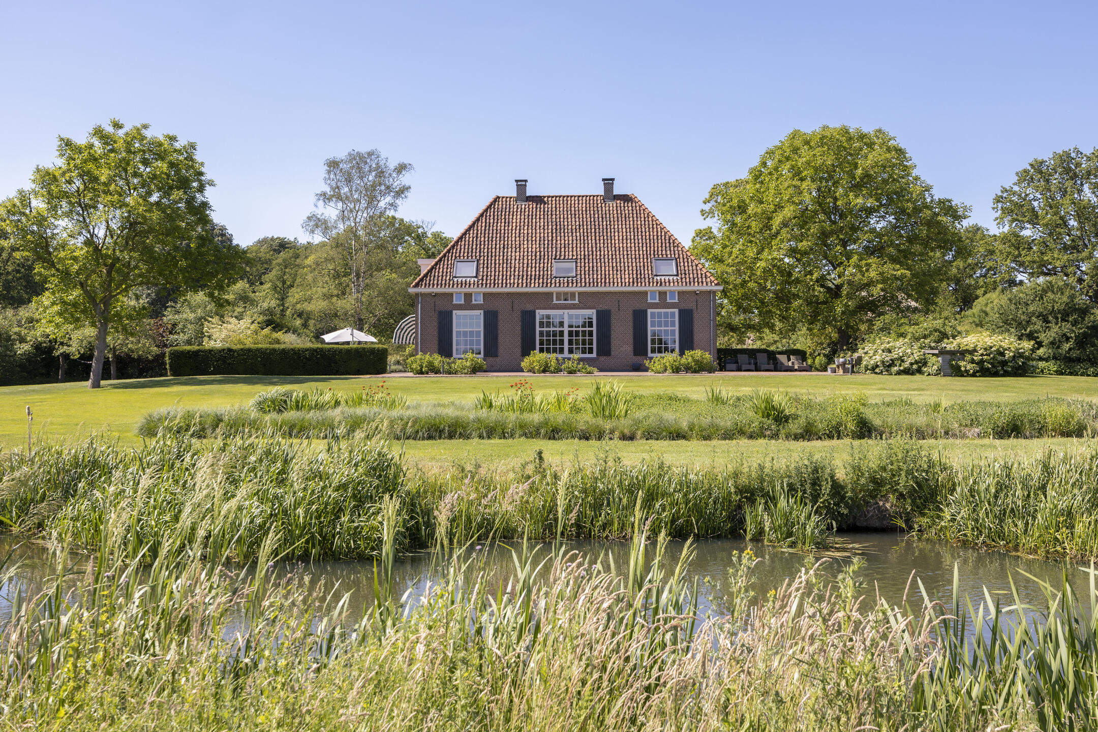 Na een lang leven – eeuwenlang – werd in 2011 deze fraaie hoeve omgebouwd tot een hoogwaardig afgewerkt en optimaal verduurzaamd woonhuis. Omdat de agrarische bestemming eraf ging, werd ook landschappelijk de omgeving anders ingevuld. Zo besloot men destijds om de historische gracht in ere te herstellen en weer rondom het huis te leiden.