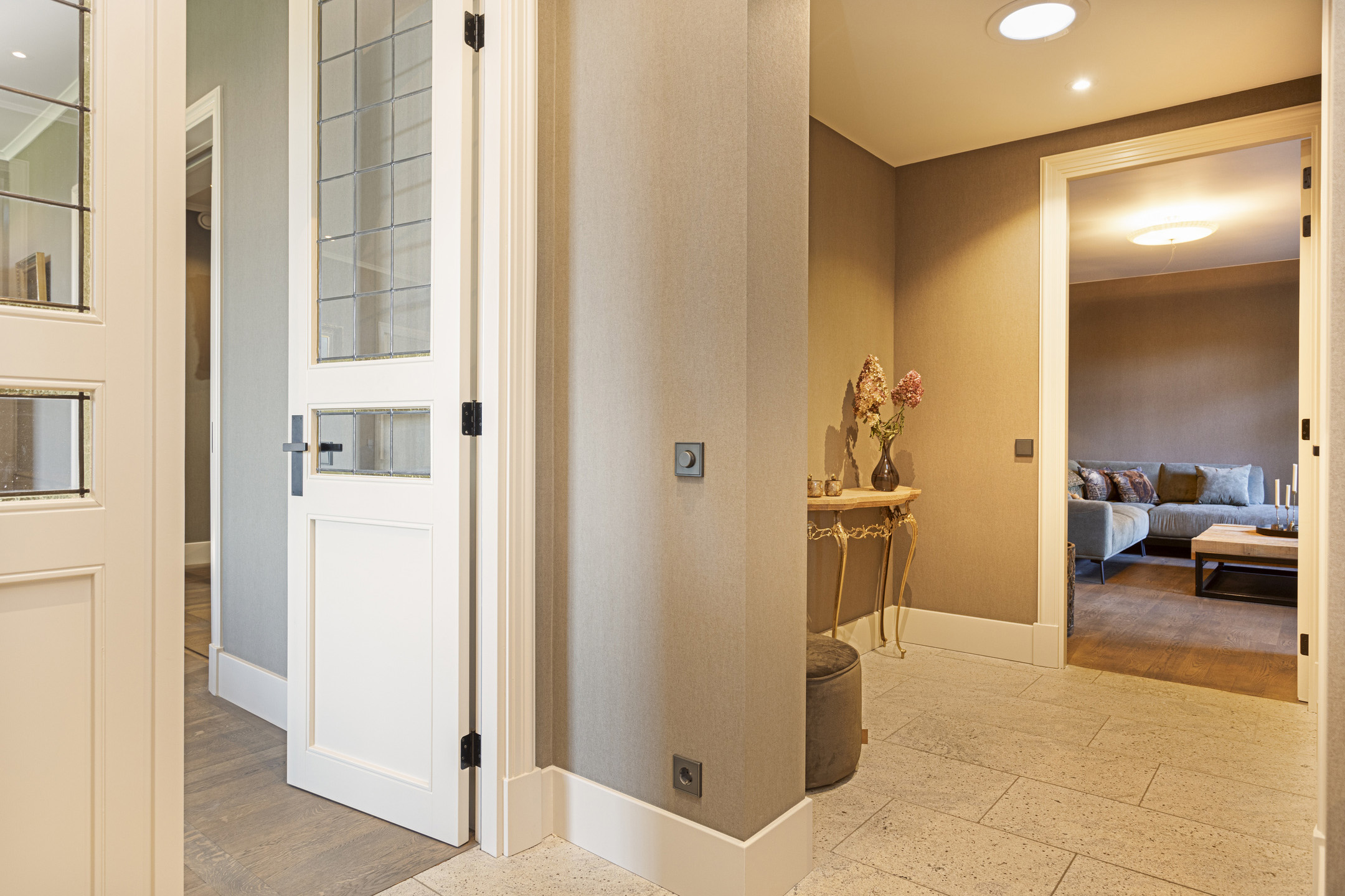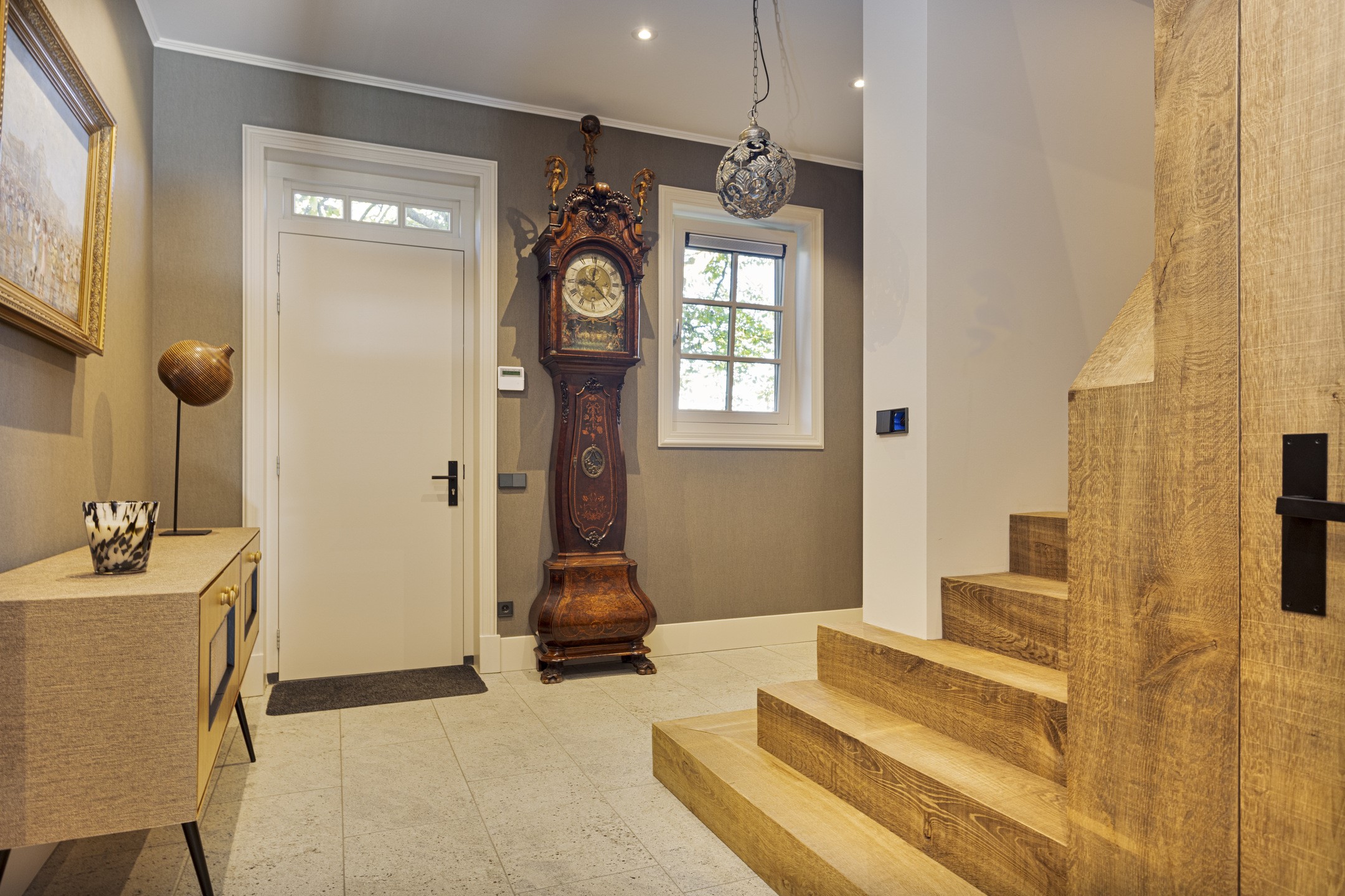 In de hal op de vloer de travertin Vieux de Bourgogne-dallen die ook in de keuken en de gang hun opwachting weer maken. Op de wand een uiterst smaakvol linnenstructuurbehang in een fijne taupekleur, die een fraaie achtergrond biedt voor ieder type interieur. Er is hier gekozen voor modern landelijk en alle elementen werken in volle harmonie samen tot een schitterende compositie. Links de trap naar de verdieping, rechts de WC – uit de kunst met schitterende geglazuurde Portugese tegels en matzwart keramiek sanitair in de vorm van hangcloset en wastafelopstelling- en de toegang tot de studio. Links de ruime kelder.