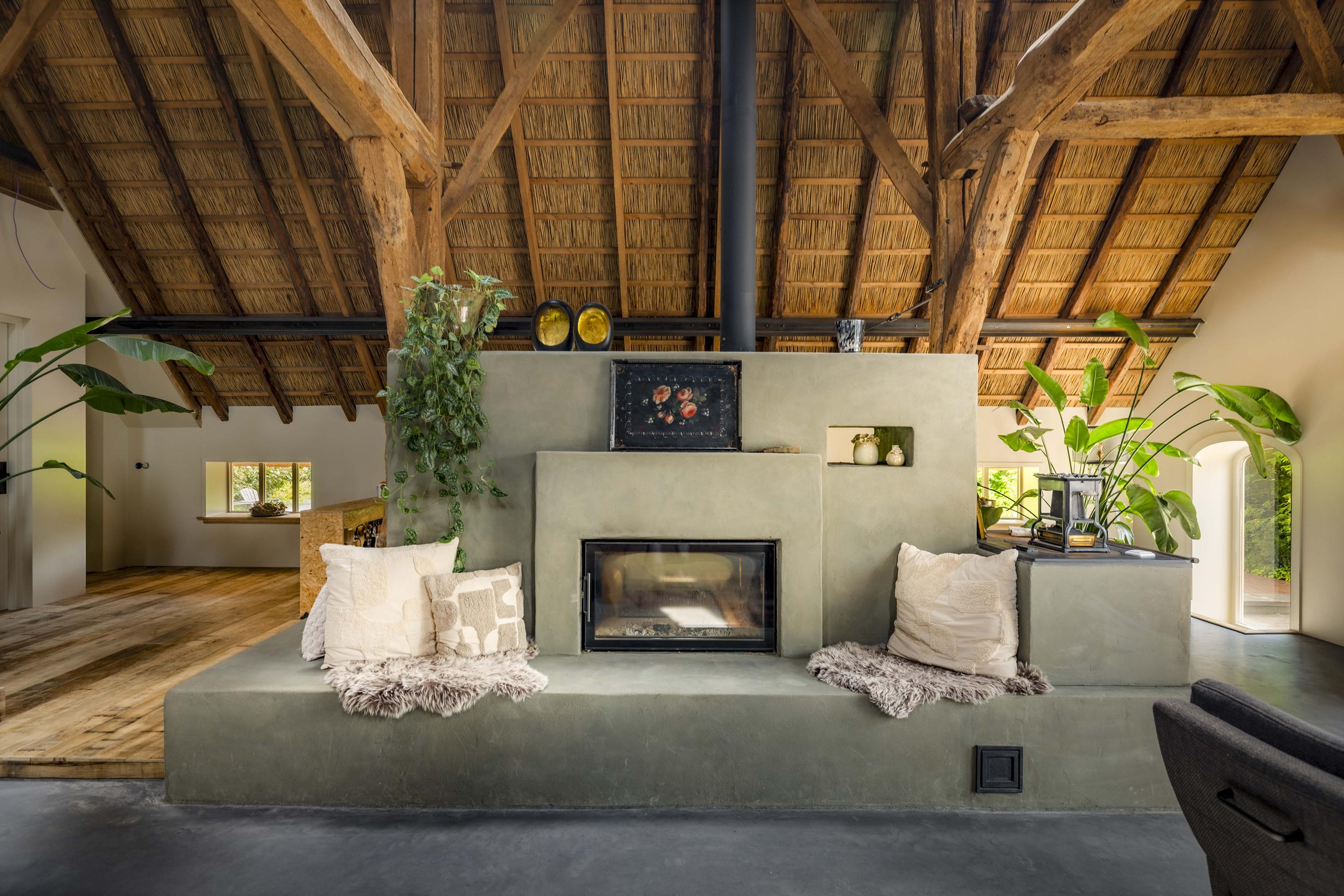 Wilt u werken vanuit huis en heeft u behoefte aan kantoorruimte? De geheel vernieuwde deel – met een waanzinnig gave leemkachel mét pizzaoven, een spiksplinternieuwe kap en rieten dak – biedt veel ruimte, genoeg om hier met meerdere mensen te werken. Ook is er beneden een prachtige studio ingericht, waardoor slapen en baden op de begane grond ook tot de opties behoort.