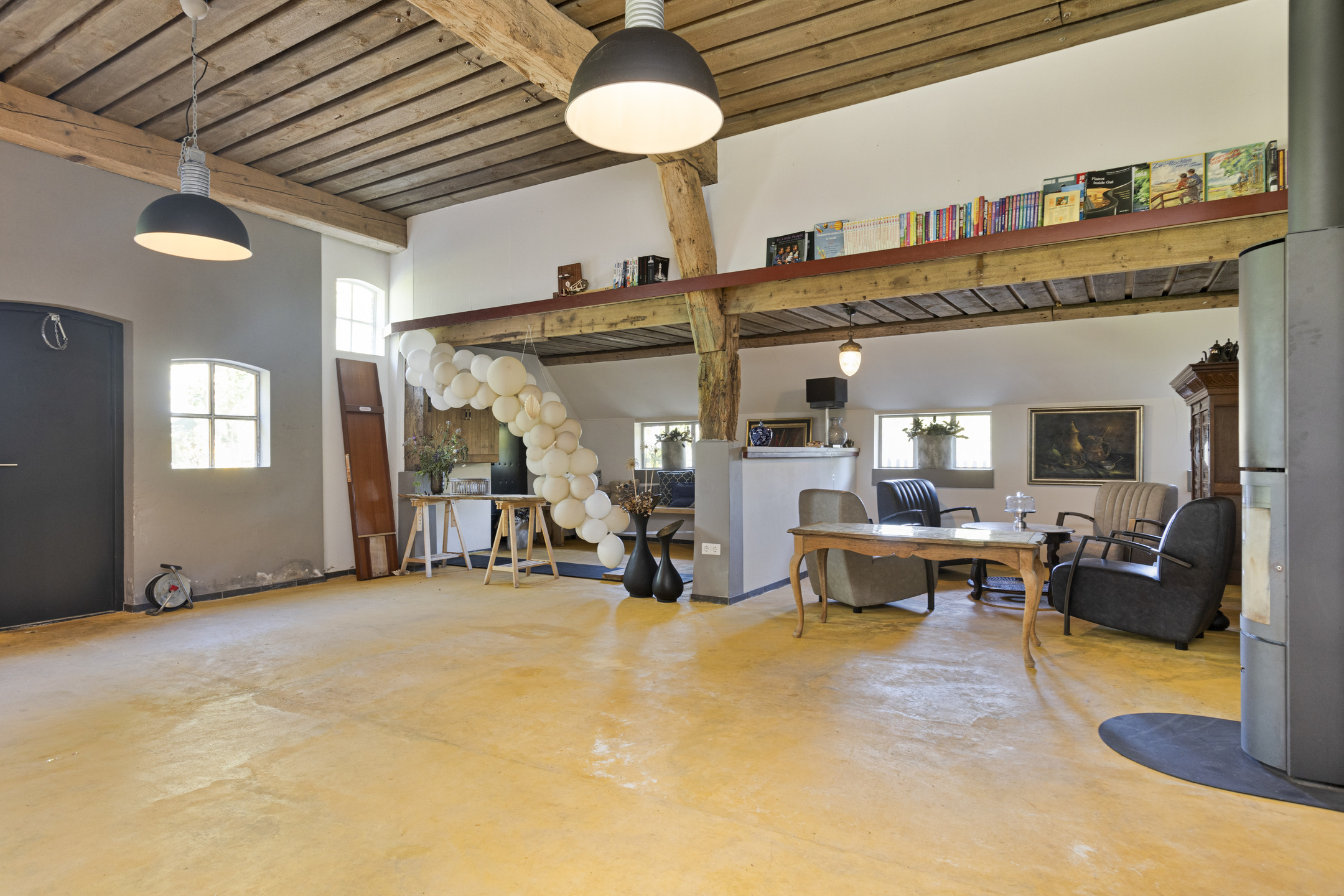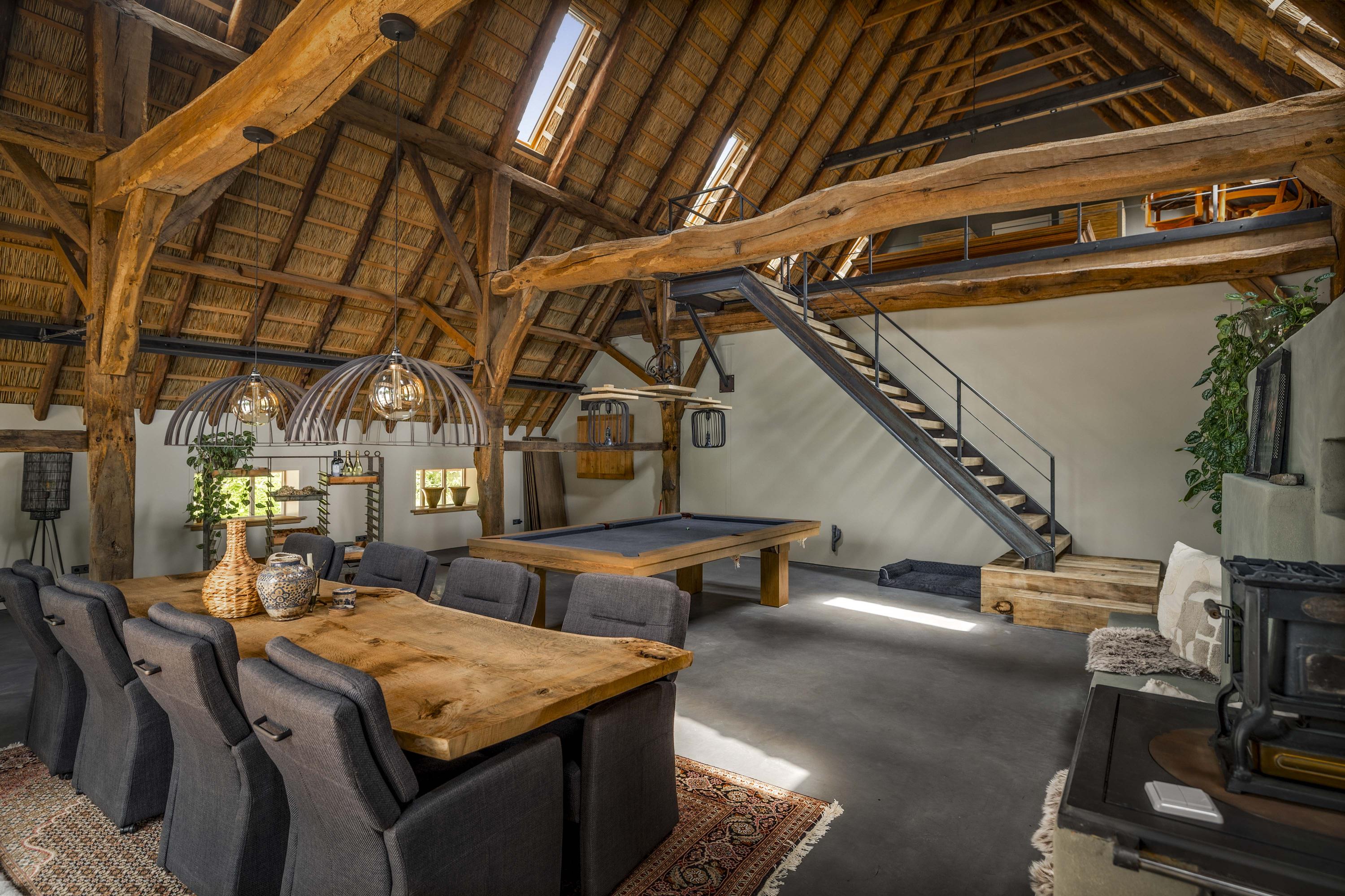 De deel, waar vroeger de koeien lekker stonden te herkauwen, is omgetoverd tot een supergave ruimte; de spanten en het dikke rietpakket (er zit nog isolatiemateriaal tussen) zijn in het zicht gelaten en de ruimte is lekker licht door de dakramen. De betonvloer – gereed voor het aanbrengen van vloerverwarming –, de schitterende leemkachel en de trap (smederij Oldenhave uit Vorden) geven het een rauw, industrieel randje. Beneden zijn er twee separate WC’s aangelegd. Boven wordt de biljartkamer gerealiseerd.