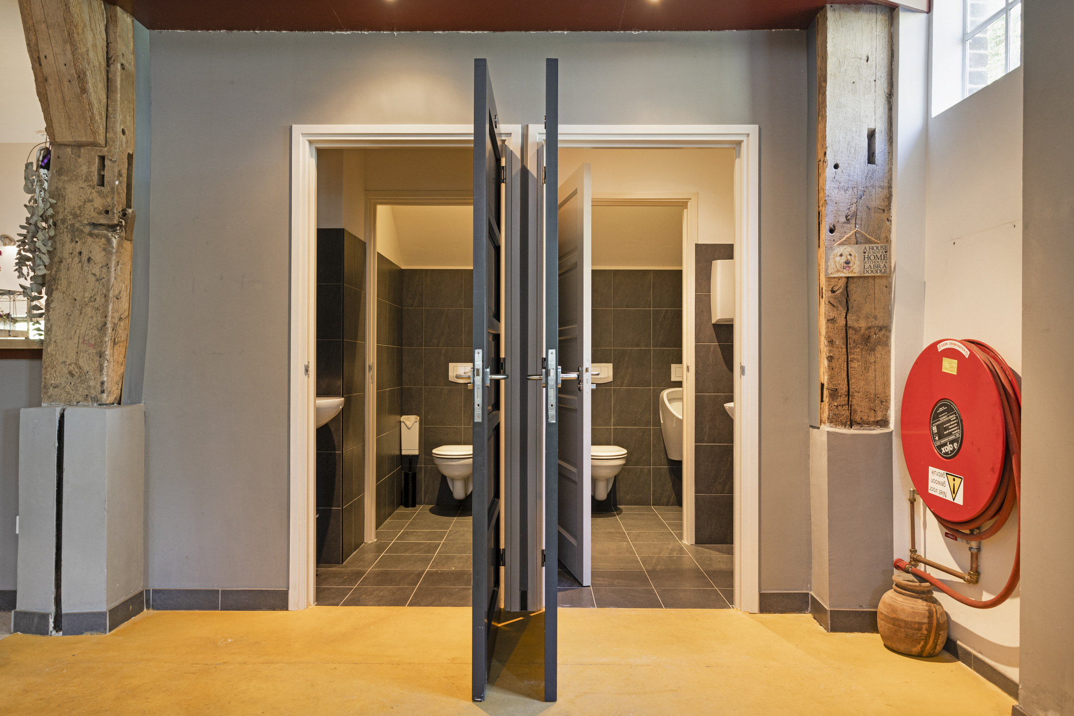 Door de grote houten poort, het erf op. De enorme Bentheimer voederbak die nu slechts nog dienst doet als landschappelijke verfraaiing, staat als een kunstobject voor de boomgaard. De grote deeldeuren bieden een vriendelijk aanzicht. Aan de linkerzijde de hoofdentree. Al het houtwerk zit dik in de lak (natuurlijke houtlakken op basis van lijnzaadolie waardoor het hout ademen kan) en ziet er ronduit fantastisch uit. Ook binnen wordt gauw duidelijk dat er kosten noch moeite gespaard zijn, en dat er uitsluitend de beste materialen gebruikt zijn.
