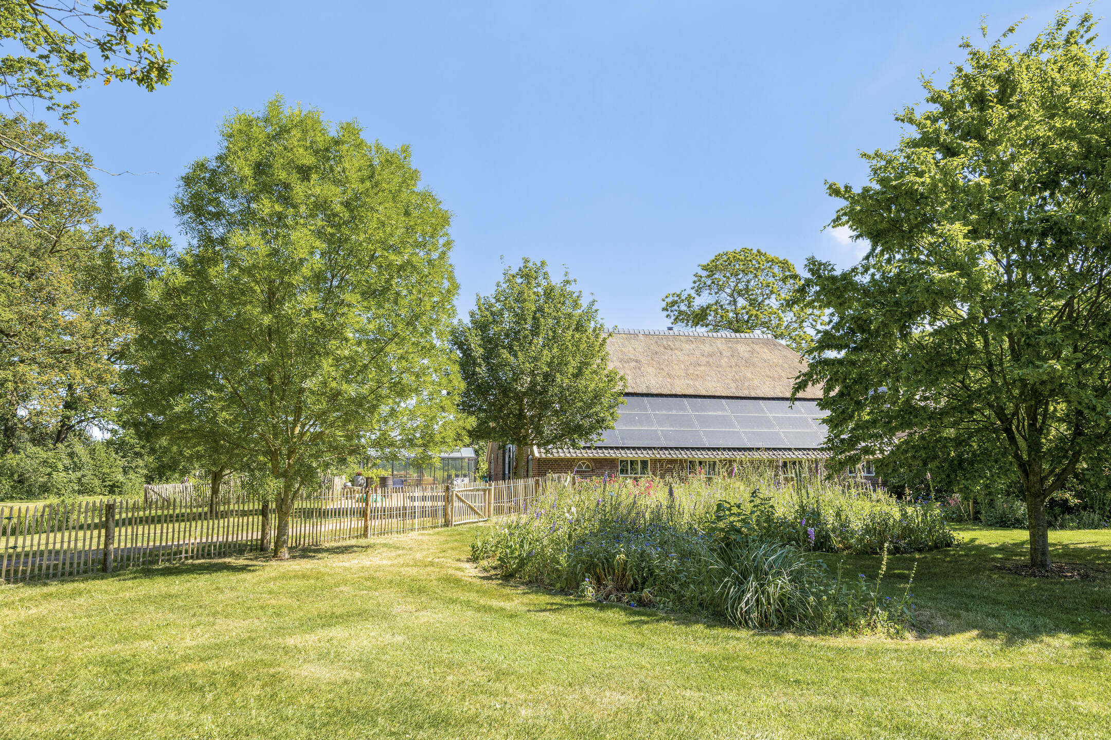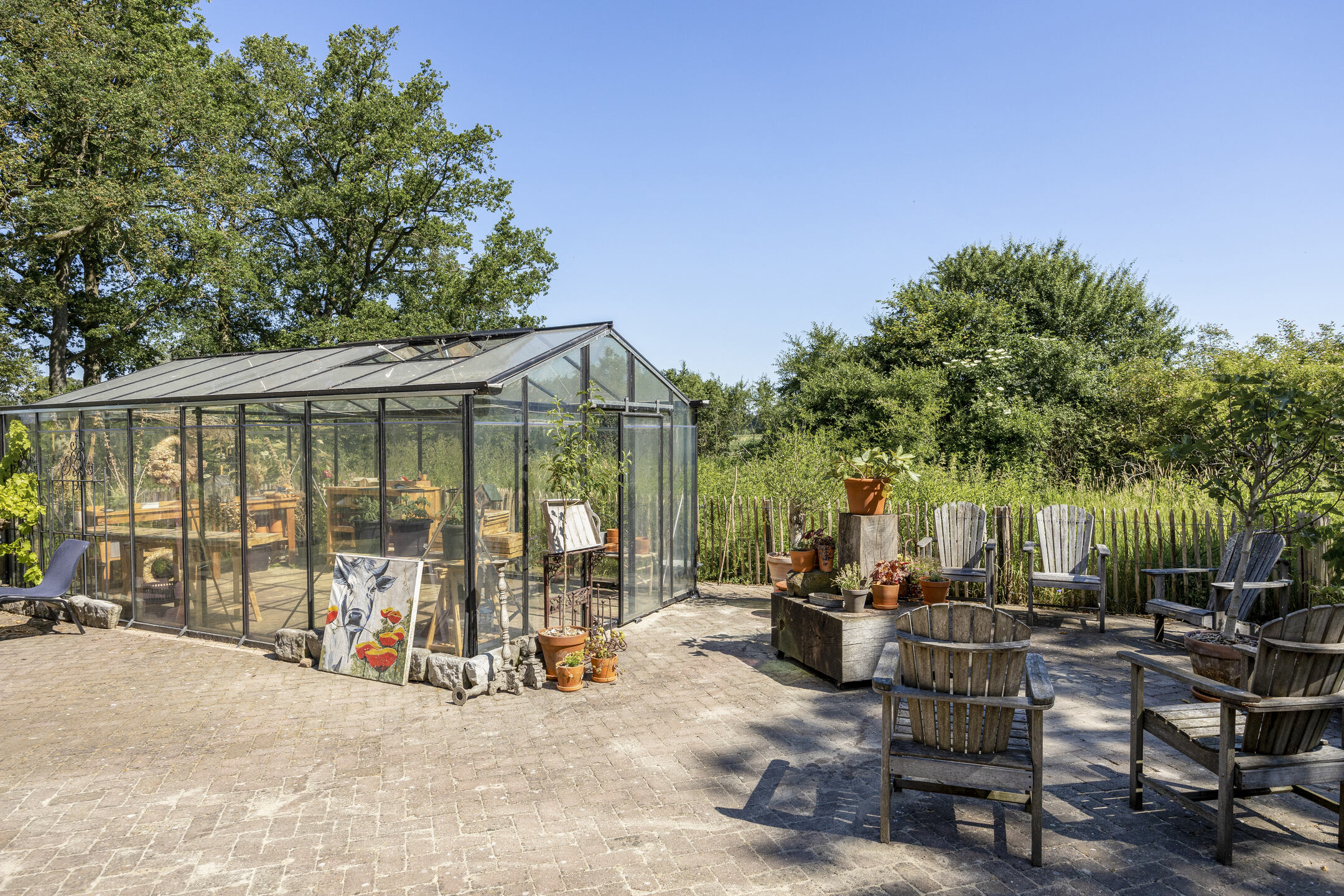 Voor de schuur staat een grote glazen kweekkas in de startblokken voor uw tomaten, citrusvruchten, oppottafel en stekjes. De moestuin, met de kastanjehouten hekjes, biedt meer dan genoeg ruimte om zelfvoorzienend te zijn.