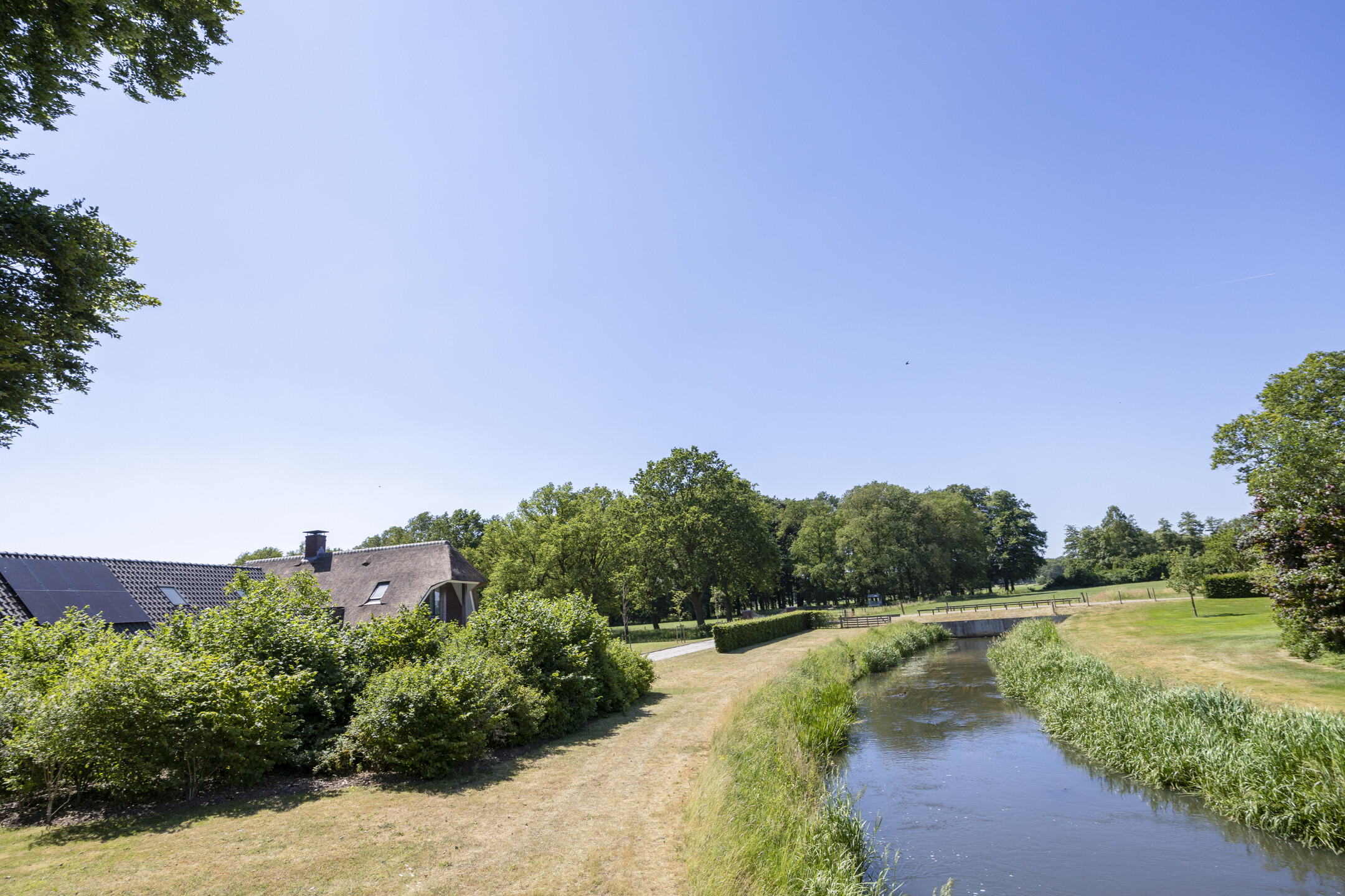 Wanneer een bureau als Eelerwoude zich met de groeninrichting bemoeit, dan weet je gewoon zeker dat het goedkomt. En zo geschiedde. De tuinen rondom het huis worden weer omzoomd door de gracht, waar het glasheldere water van de Berkel vrolijk doorheen klatert. Vanuit het huis is het wonen gericht op de Berkel en het dorpje verderop. Aan de rechterzijde heeft u uitzicht op het beukenbos, waar u via het bruggetje naartoe kunt om een wandeling te maken; tussen de bomen ligt een pad.