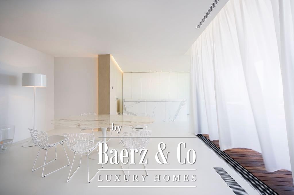 Het interieur van deze luxe woning is ontworpen door de bekende Belgische binnenhuisarchitect Filip Deslee. Het bestaat uit een ruime woonkamer, een moderne, volledig uitgeruste keuken met Miele-apparatuur, een zeer ruime hoofdslaapkamer met dressing en en-suite badkamer en nog twee slaapkamers die een tweede badkamer delen. Er is centrale airconditioning (warm/koud), vloerverwarming in de badkamers, domotica, een Sonos-geluidssysteem, een volledig ingerichte gym, een jacuzzi op het terras en een dubbele inpandige garage + berging van 73 m2.