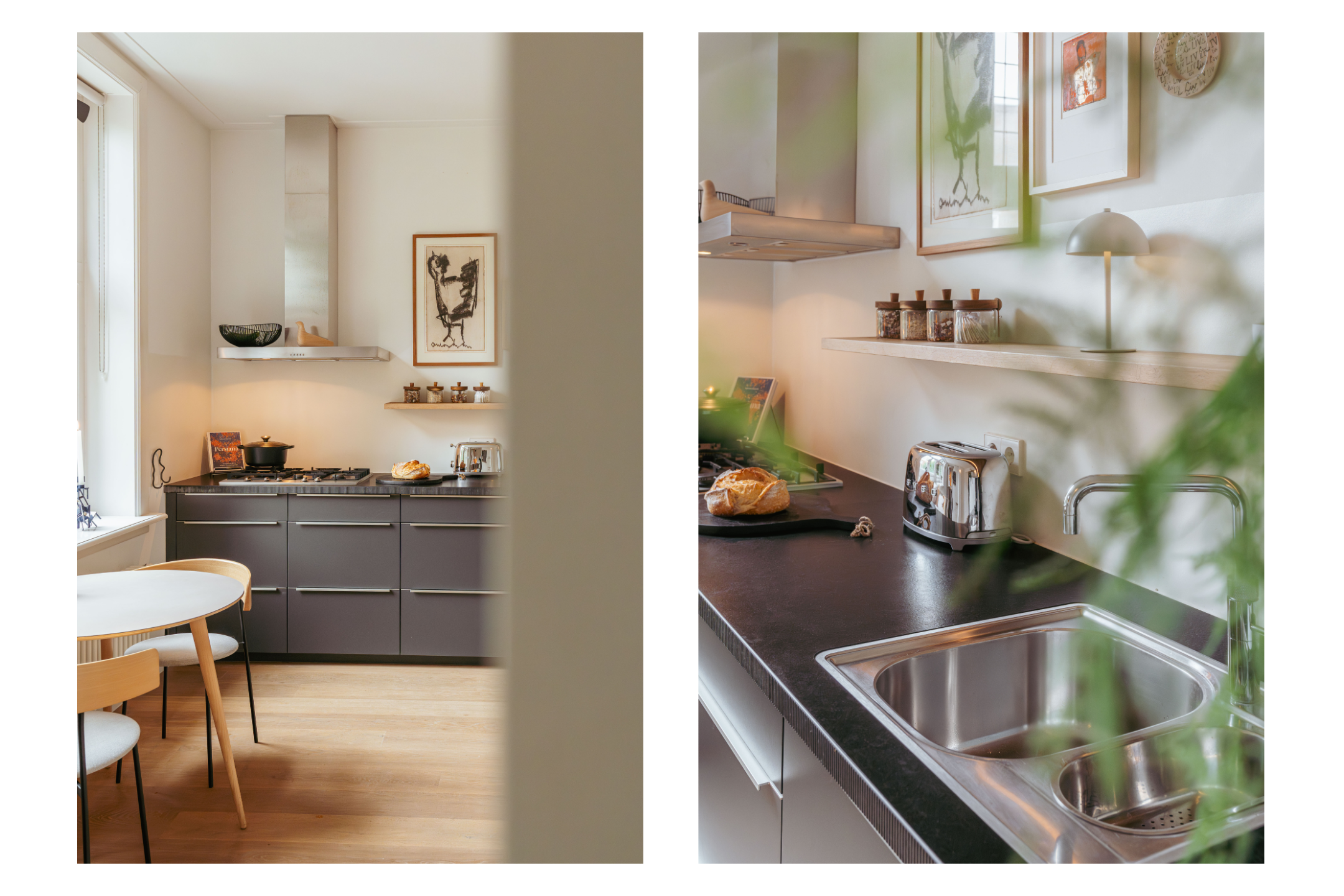 Op de tweede verdieping betreedt u het appartement, waar de hoge plafonds en authentieke kenmerken van de Amsterdamse School direct in het oog springen. U komt binnen in de moderne, strak afgewerkte keuken die is uitgerust met hoogwaardige inbouwapparatuur: een 5-pits gasfornuis met afzuiger, combi-oven, koel-vriescombinatie, vaatwasser en Quooker. Grote raampartijen met sierlijke details zorgen voor een prettige lichtinval en een elegant geheel. De aangrenzende woonkamer biedt ruimte voor een royale zithoek en een ruime eettafel. De sfeervolle nissen met ingebouwde spotverlichting en de charmante erker met draai- en kiepramen geven de ruimte extra karakter en bieden een fraai, groen uitzicht over de De Lairessestraat.