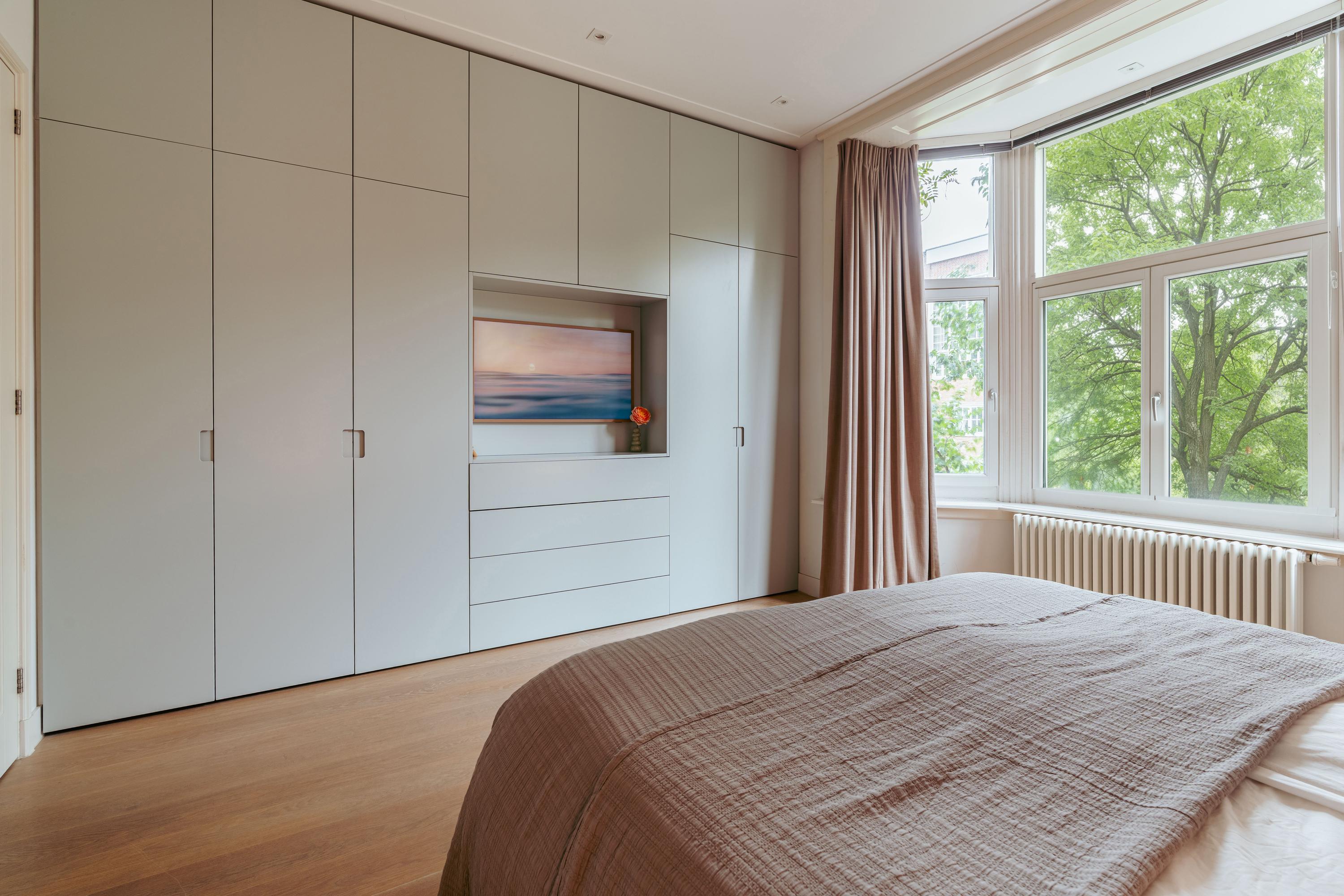 Aan de rechterzijde van het appartement bevindt zich de goed bemeten slaapkamer, voorzien van plafondhoge op maat gemaakte kasten met mogelijkheid voor ingebouwde tv. Ook hier zorgt een erker voor veel licht en een ruimtelijk gevoel. De en-suite badkamer is uitgerust met een ligbad, inloopdouche, wastafelmeubel en aansluitingen voor wasmachine en droger. Naast de badkamer bevindt zich een separaat toilet met fonteintje.
