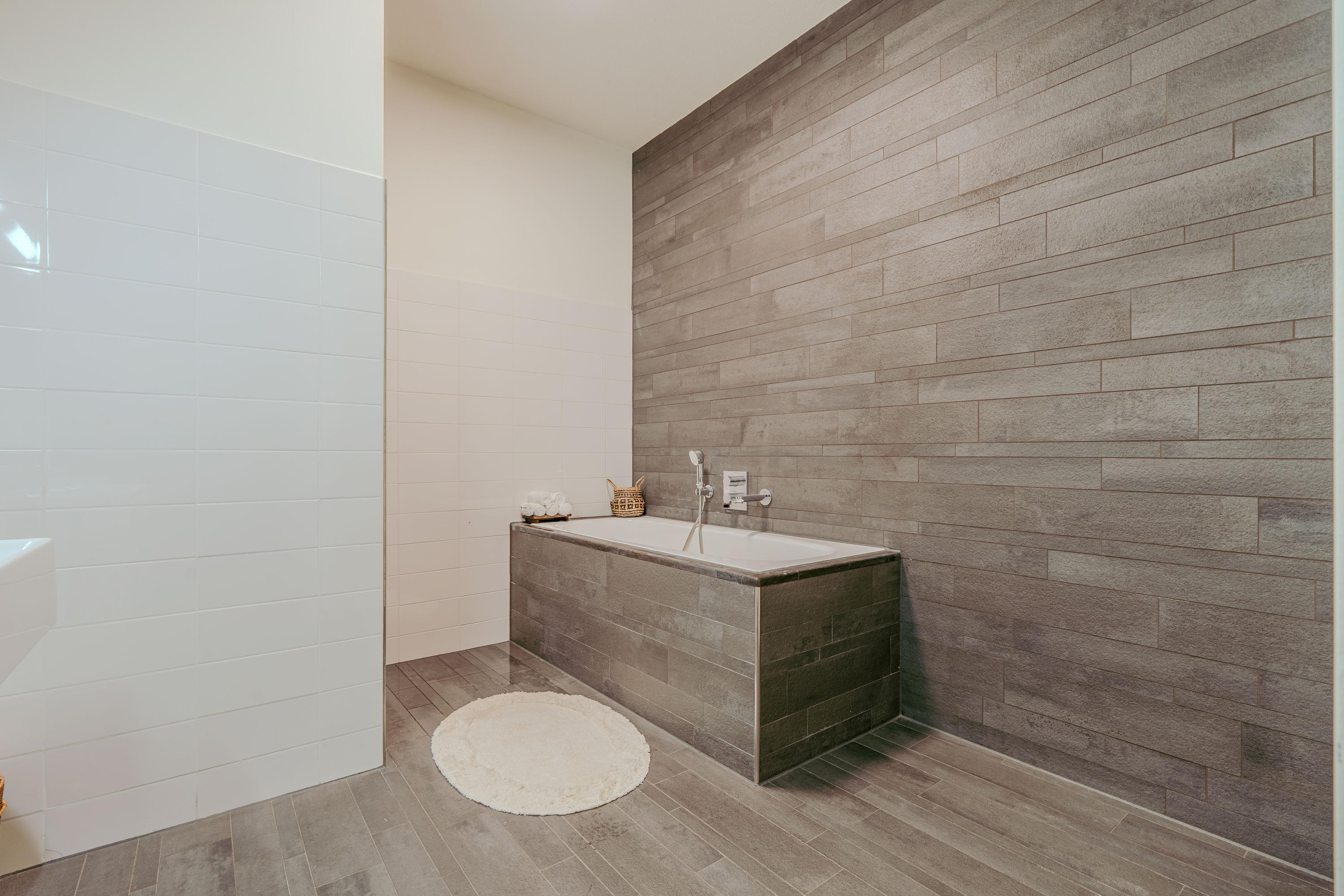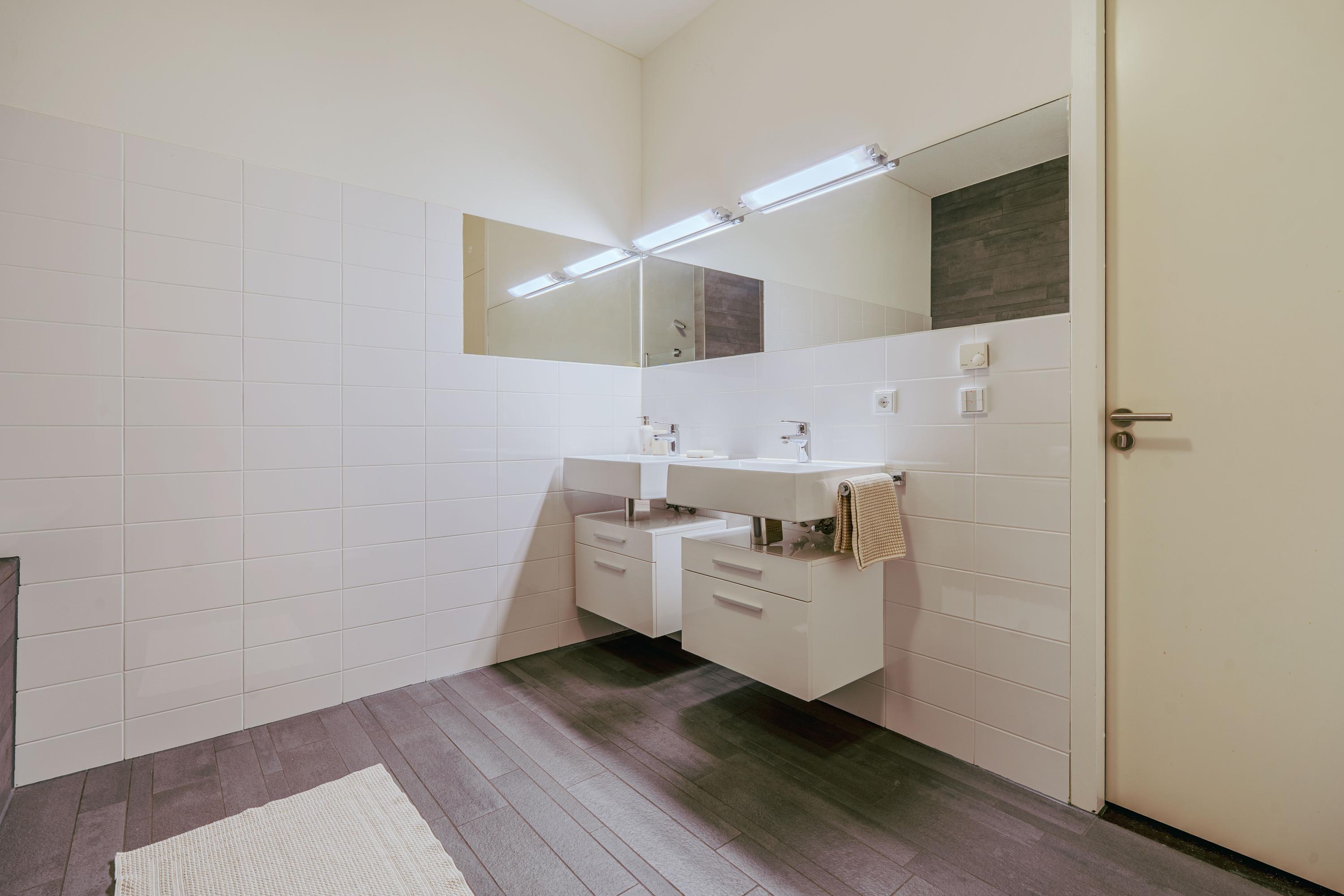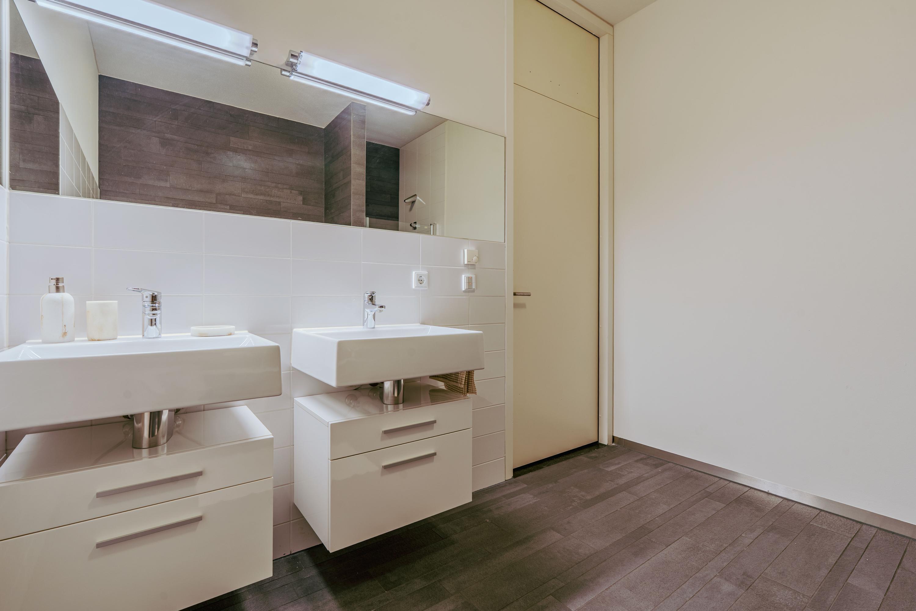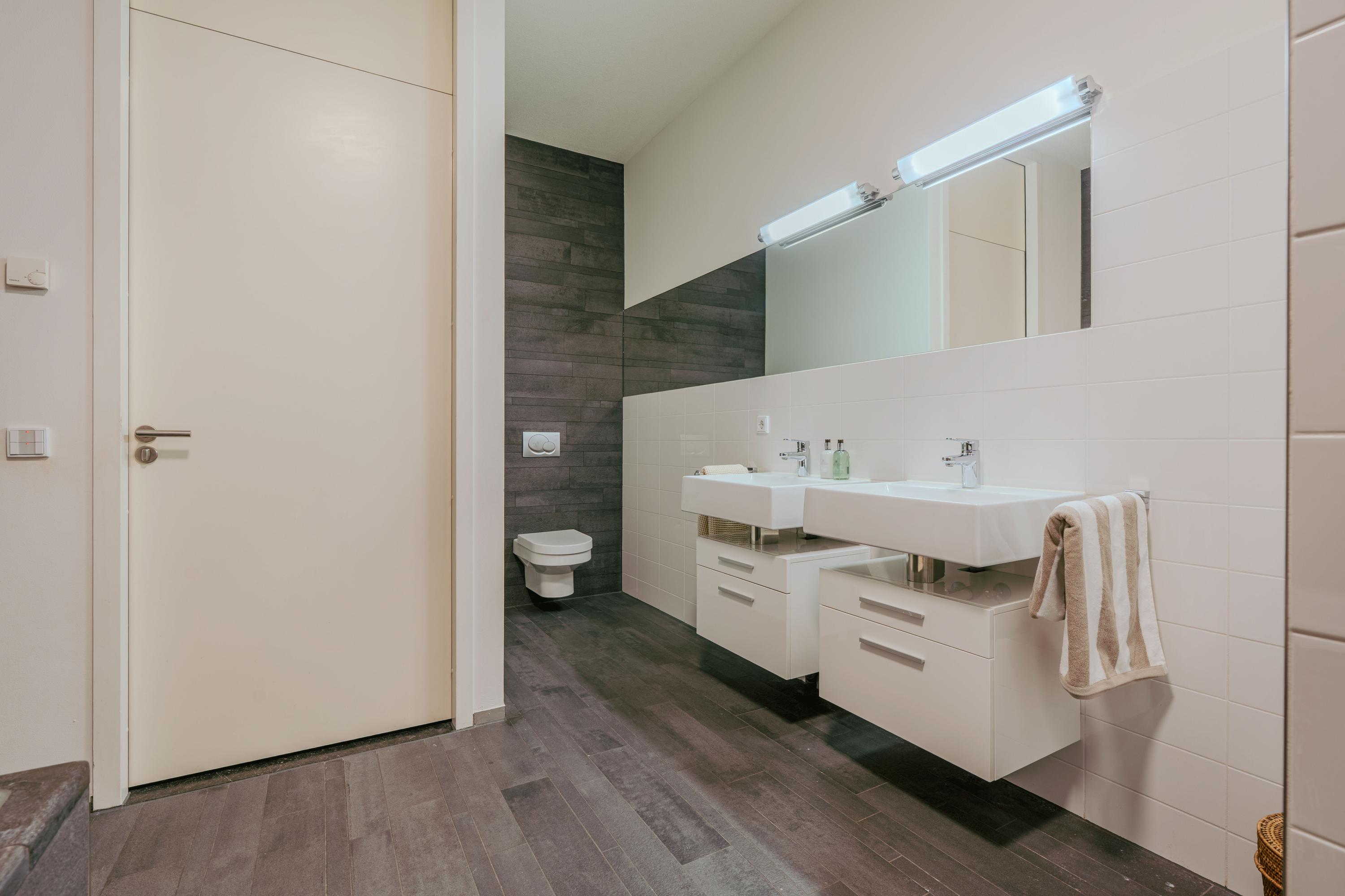 Een tweede hal verbindt de woonruimte met de slaapvertrekken aan de voorzijde en badkamers aan de achterzijde. Beide slaapkamers zijn opvallend ruim en over de lengte gestrekt, wat zorgt voor een open en rustgevende sfeer. De hoofdslaapkamer beschikt eveneens over een serre en voelt daardoor extra ruimtelijk aan. Achterin bevinden zich twee moderne badkamers, elk met dubbele wastafelmeubels, een ligbad en inloopdouche.