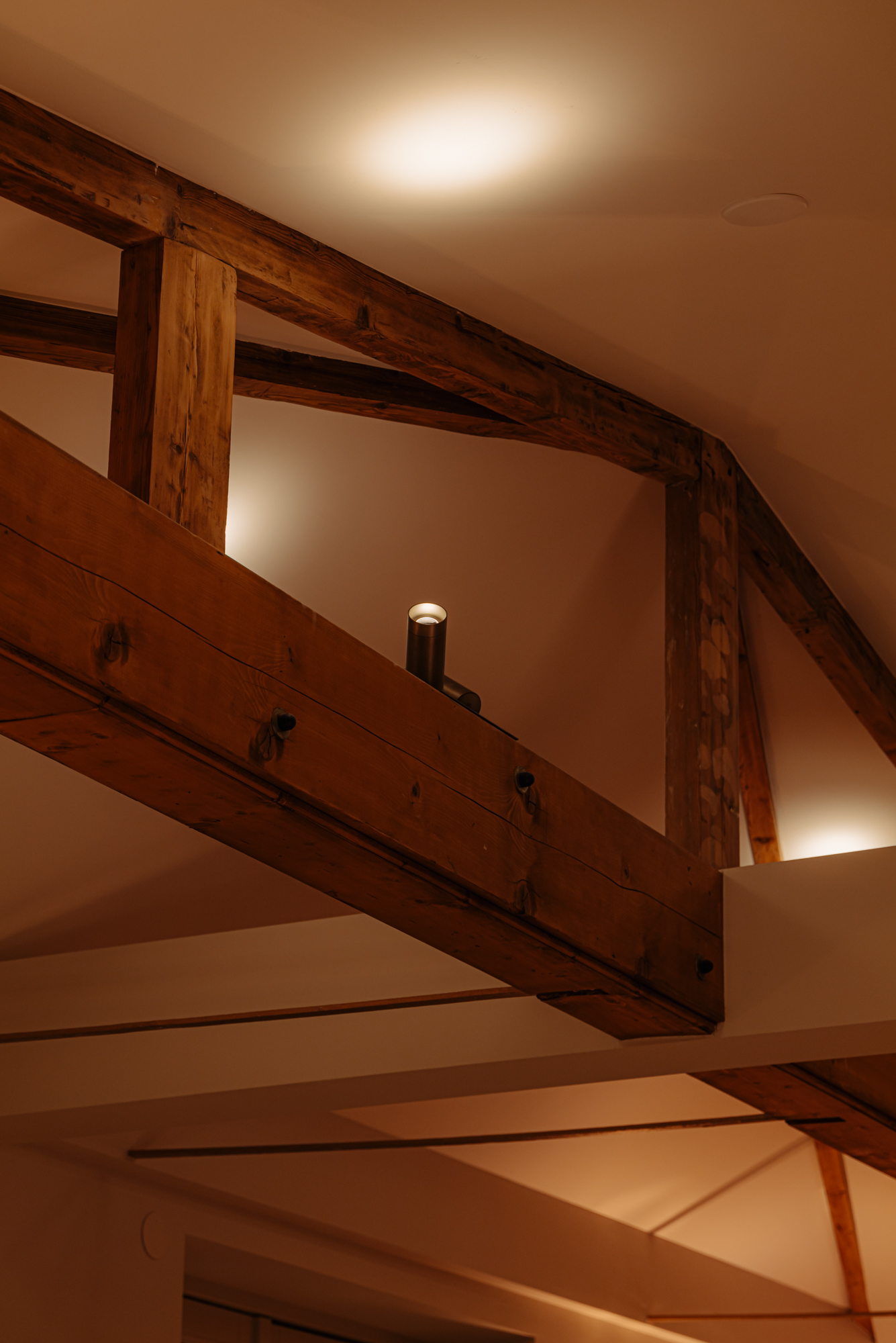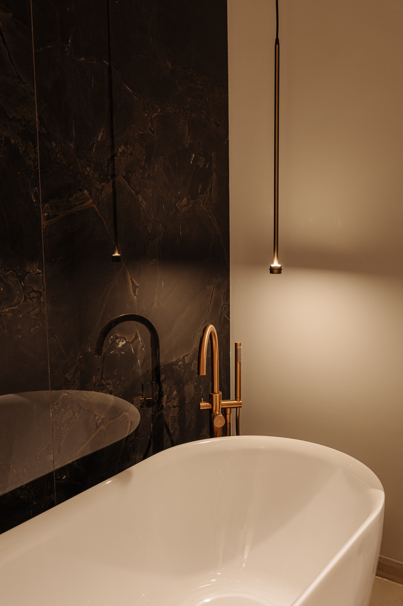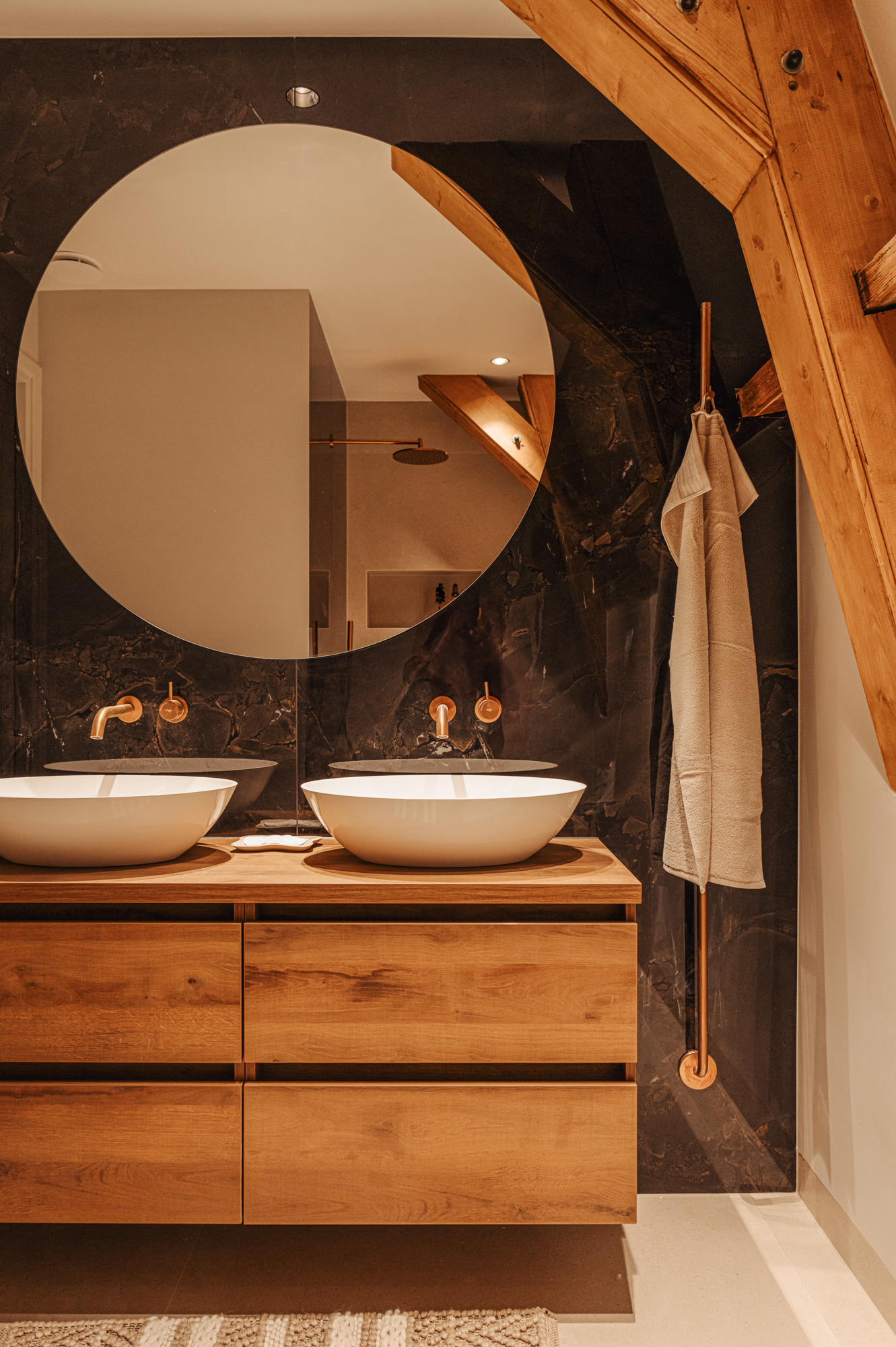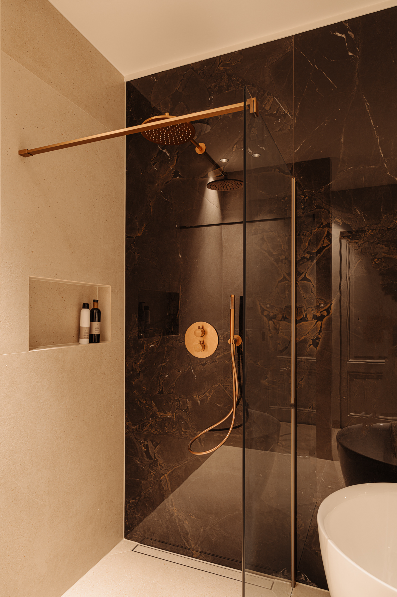 De slaapkamers aan de achterzijde genieten van een overvloed aan natuurlijk licht en zijn beide royaal van afmeting, waardoor er eenvoudig een derde slaapkamer te realiseren is. Ook hier zijn de prachtige originele houten balken, die bijdragen aan de karakteristieke charme van de woning, volop aanwezig. De Master bedroom beschikt over een eigen en-suite badkamer, uitgerust met een dubbele wastafel, een royaal ligbad, een ruime inloopdouche en een toilet. Deze badkamer biedt alle comfort en luxe die men zich kan wensen. De tweede badkamer is eveneens elegant ingericht en voorzien van een dubbele wastafel en een inloopdouche.