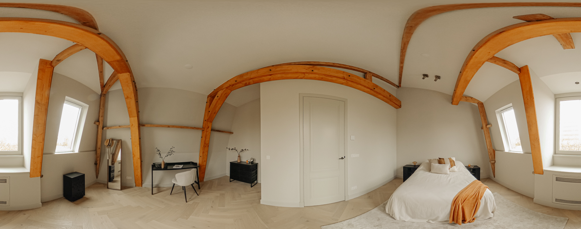 Bij binnenkomst via de lift, welke in de woning uitkomt, betreed u de overloop welke toegang biedt tot alle vertrekken. Aan de voorzijde bevindt zich de lichte en ruime woonkamer. Met de originelen houten balken in het zicht ervaart u hier de luxe en comfort in combinatie met originele elementen. De Italiaanse open designerkeuken met kookeiland is uitgerust met alle denkbare inbouwapparatuur en biedt een perfecte balans tussen stijl en functionaliteit. De verfijnde combinatie van de kasten in de warme tint van notenhout met een stenen aanrechtblad zorgt voor een prachtige en sfeervolle uitstraling van de ruimte. Middels meerdere openslaande deuren is er vervolgens toegang tot het zonnige dakterras.