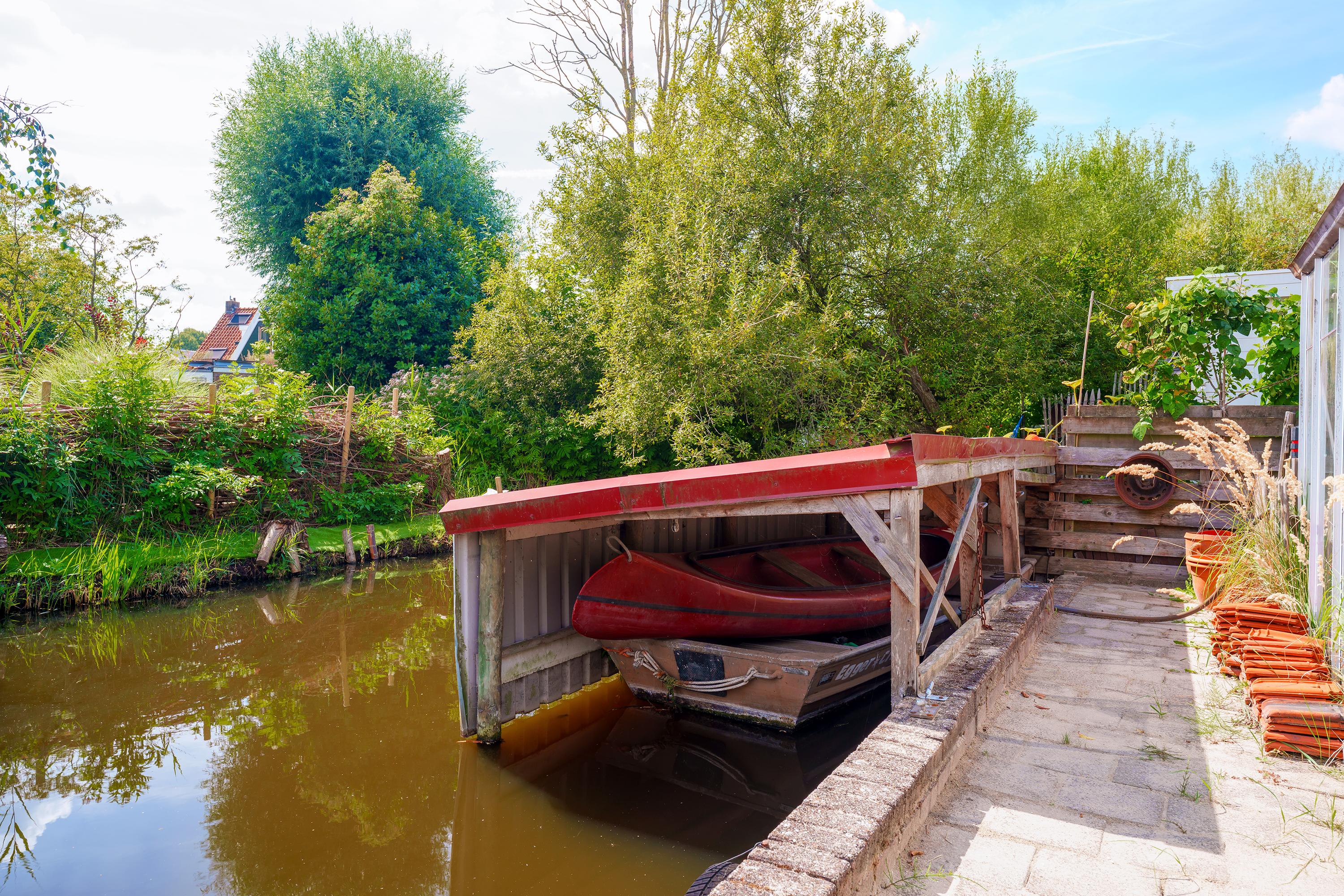 De tuin is bereikbaar via het zijpad. Hier tref je een overkapping, ruime schuur, (groenten-)kas en boothuis. De volwassen beplanting geeft rust, schaduw, geur, kleur en beleving. Op het zuiden en met veel privacy!