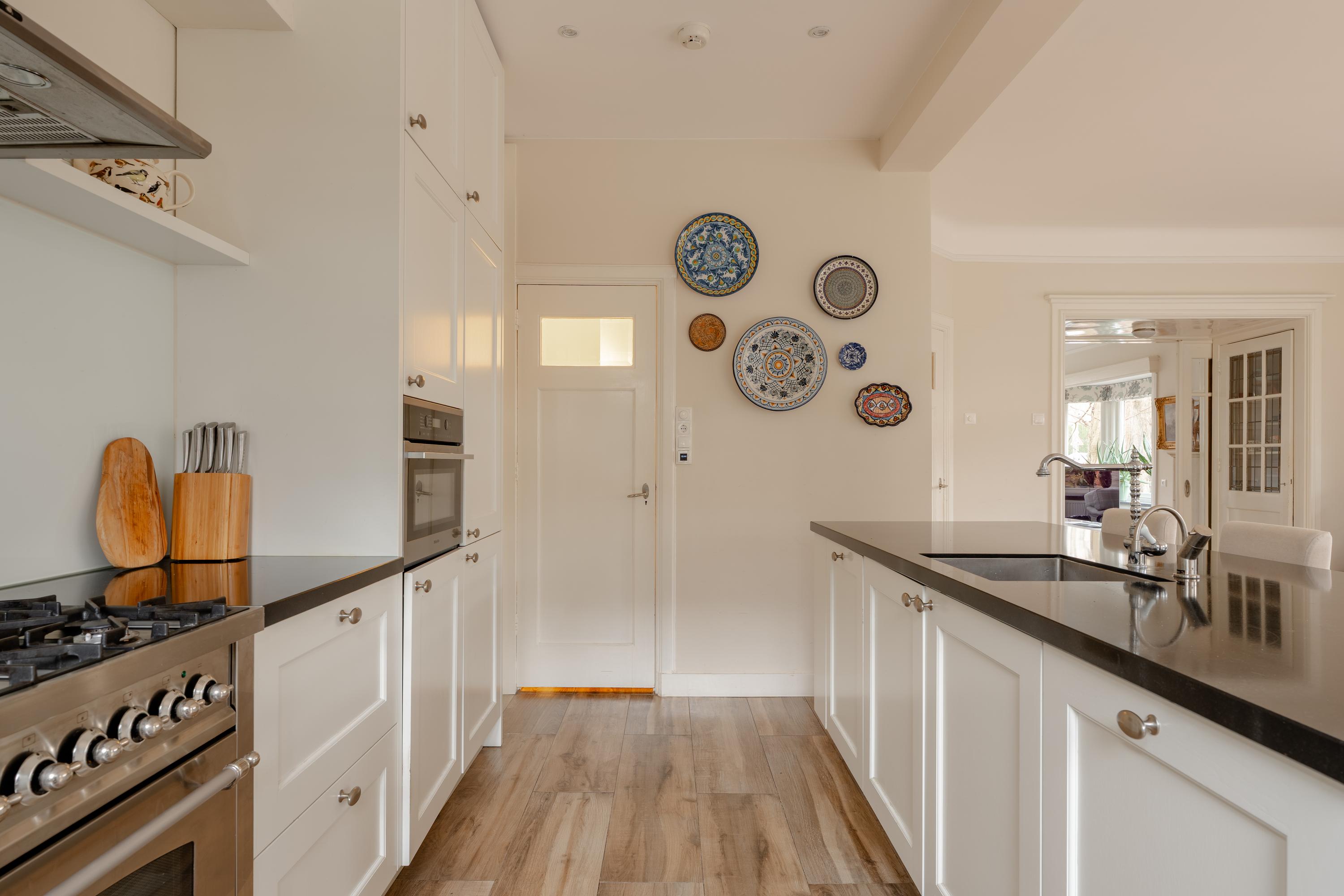 Vanuit de woonkamer loopt u door naar de ruime eetkamer met aansluitend de halfopen keuken. Deze keuken is voorzien van diverse inbouwapparatuur, waaronder een vaatwasser, Quooker en magnetron. Daarnaast beschikt de keuken over een ruim gasfornuis met oven. Vanuit de keuken heeft u tevens toegang tot de ruime kelder.