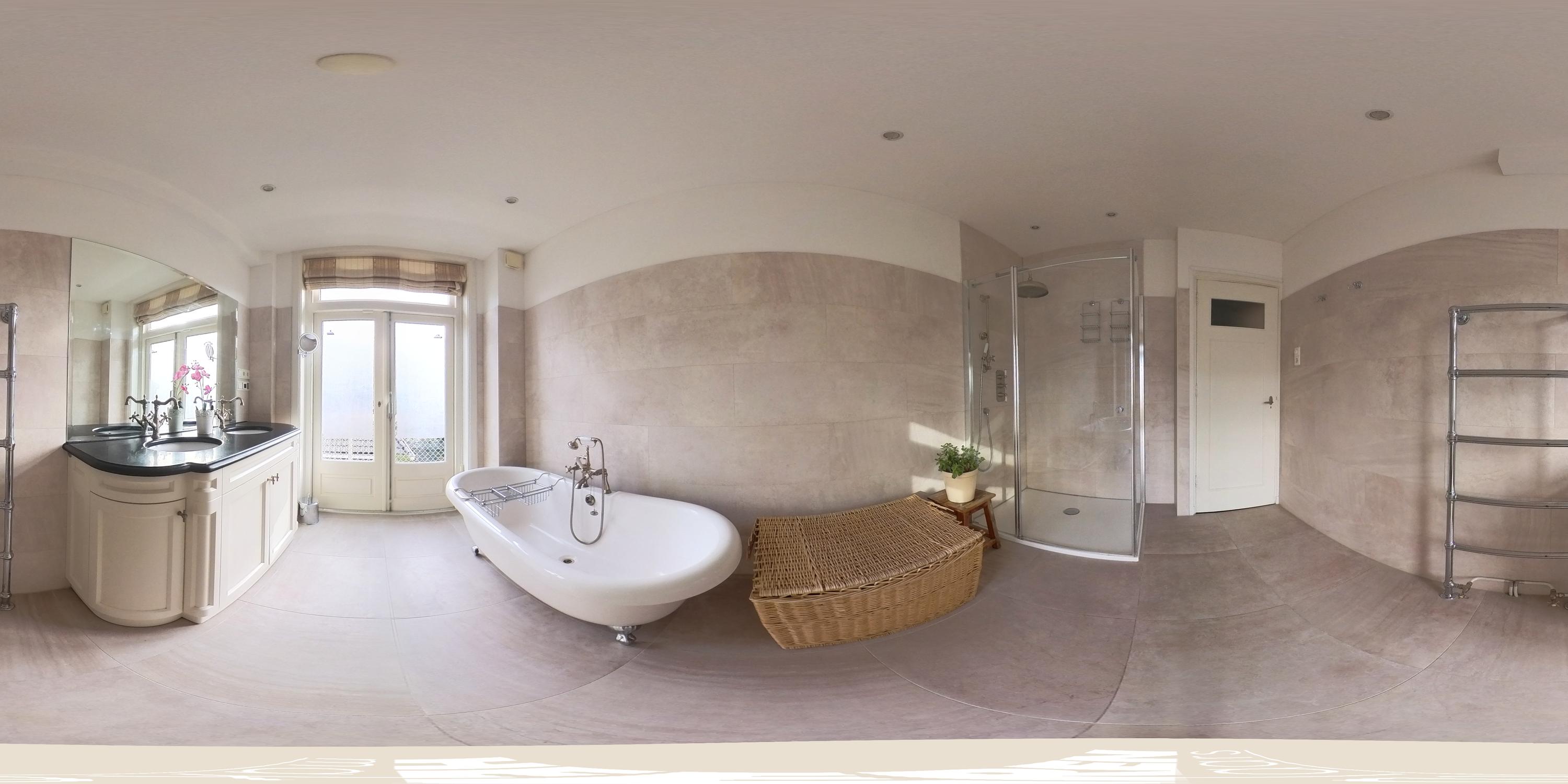 Aan de achterzijde van de woning bevindt zich de ruime master bedroom met toegang tot het balkon. De klassieke badkamer, uitgevoerd in beton ciré, beschikt over een douche, dubbele wastafel, handdoekradiator en een vrijstaand ligbad. Via de openslaande deuren in de badkamer heeft u eveneens toegang tot het balkon.