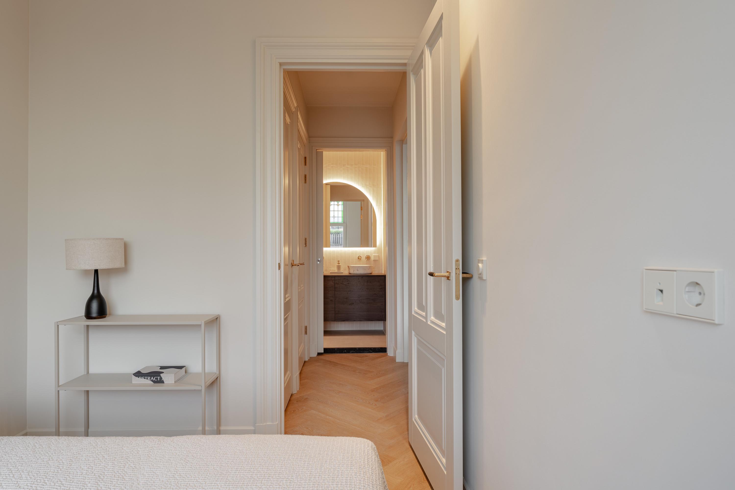 Dit luxe appartement is gelegen op de derde verdieping en wordt gekenmerkt door een ruime en open indeling, met grote raampartijen aan zowel de voor- als achterzijde die zorgen voor een prettige lichtinval. De woning is hoogwaardig afgewerkt en biedt een comfortabele woonomgeving met een rustige, verfijnde uitstraling. De woonkamer is gesitueerd aan de voorzijde van het appartement en beschikt over een plafondhoogte van circa 3,07 meter. De woonruimte vormt samen met de keuken en eetkamer één grote, open leefruimte. De luxe keuken is centraal in de woning gelegen en uitgevoerd met een royaal spoel- en kookeiland, voorzien van een inductiekookplaat, spoelbak en Quooker. Daarnaast beschikt de keuken over een koelkast, vriezer, combi-oven, klimaatkast en voldoende kastruimte. Het kookeiland fungeert tevens als comfortabele bar. Aan de achterzijde van het appartement bevindt zich het overdekte balkon, dat een fraai uitzicht biedt over de groene tuinen aan de achterzijde en een rustige plek vormt om buiten te zitten. Aan de voorzijde van de woning bevindt zich de gang, vanwaar toegang is tot de eerste slaapkamer, het separate toilet, de wasruimte/berging en de eerste badkamer. Deze badkamer is uitgerust met een inloopdouche en een dubbele wastafel met meubel. De tweede slaapkamer is gelegen aan de achterzijde van het appartement en beschikt over vaste kastruimte en een ensuite badkamer, voorzien van een inloopdouche en een wastafel met meubel.