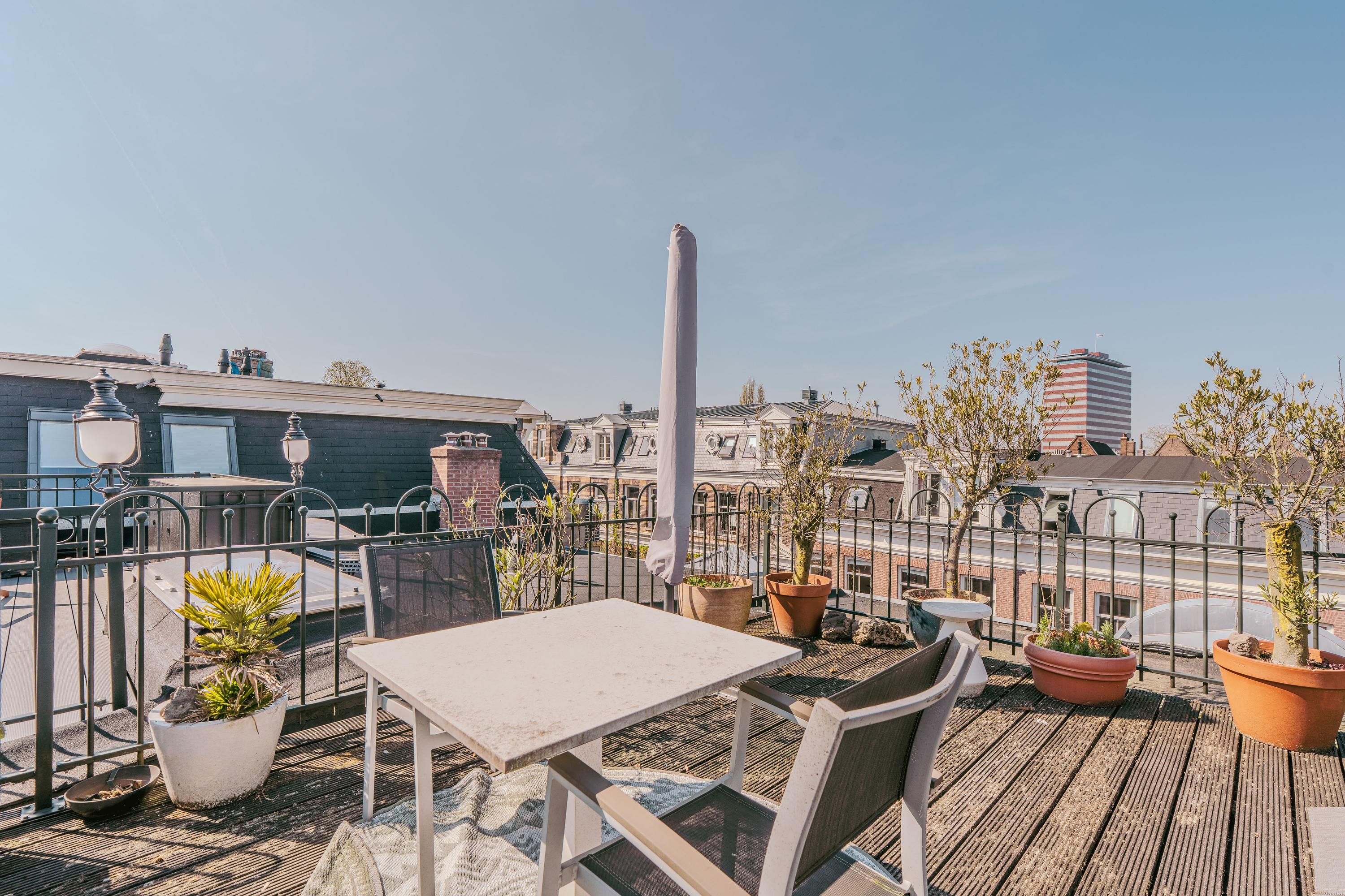 Via de tweede trap loopt u direct naar de woonkamer op de derde verdieping, voorzien van een kitchenette, twee ruime bergingen, airco en een extra badkamer. Deze badkamer is voorzien van een wastafel met meubel, een douche en een toilet. Aan de voorzijde van deze verdieping treft u nog een vierde goed bemeten slaapkamer, met aangrenzend een fijne kantoorruimte en voorzien van een airco-installatie. Beide vertrekken zijn te bereiken middels het centrale trappenhuis aan de rechterzijde van de woning. Vanuit de woonkamer loopt u naar boven naar het zonovergoten dakterras, waar u tot in de late uren heerlijk kunt genieten van de zon. Het dakterras heeft een oppervlakte van meer dan 23m2, uitzonderlijk in de stad!