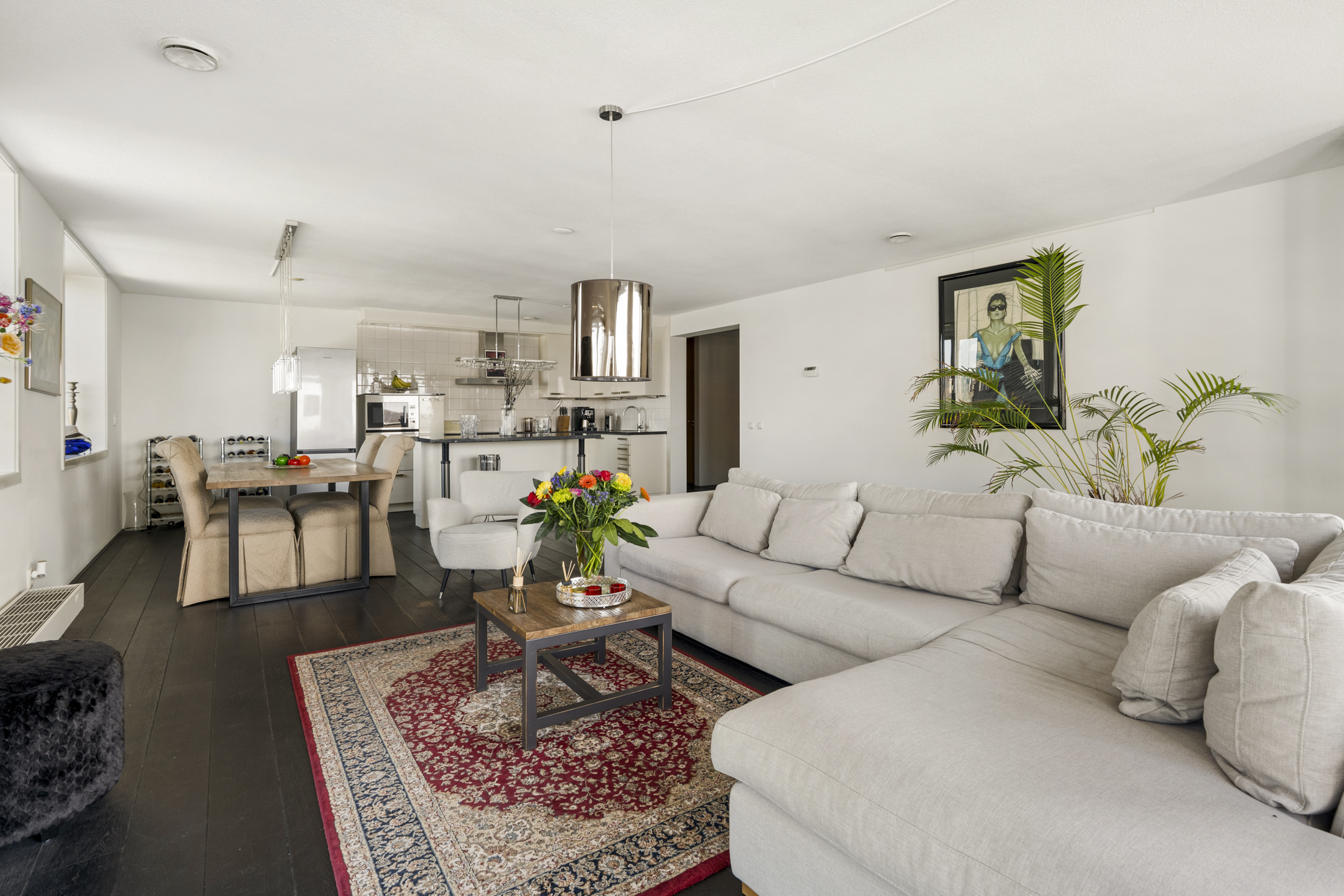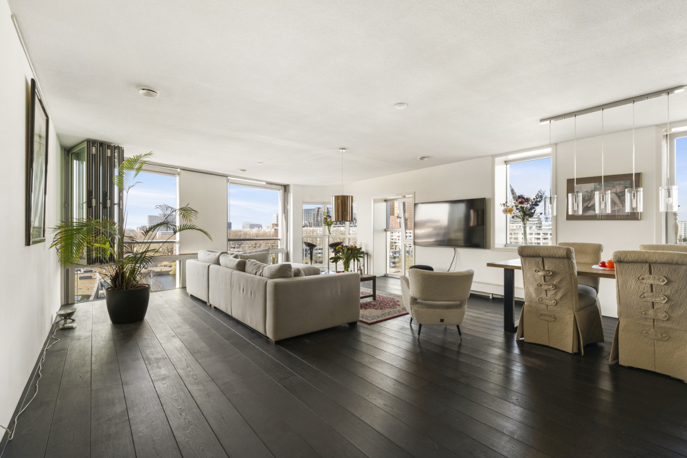 Ruime living, door de hoekligging en de gebogen hoekramen trekt het stadse en waterrijke vergezicht direct de aandacht mede omdat ook hier de gevel vrijwel geheel uit glas bestaat.