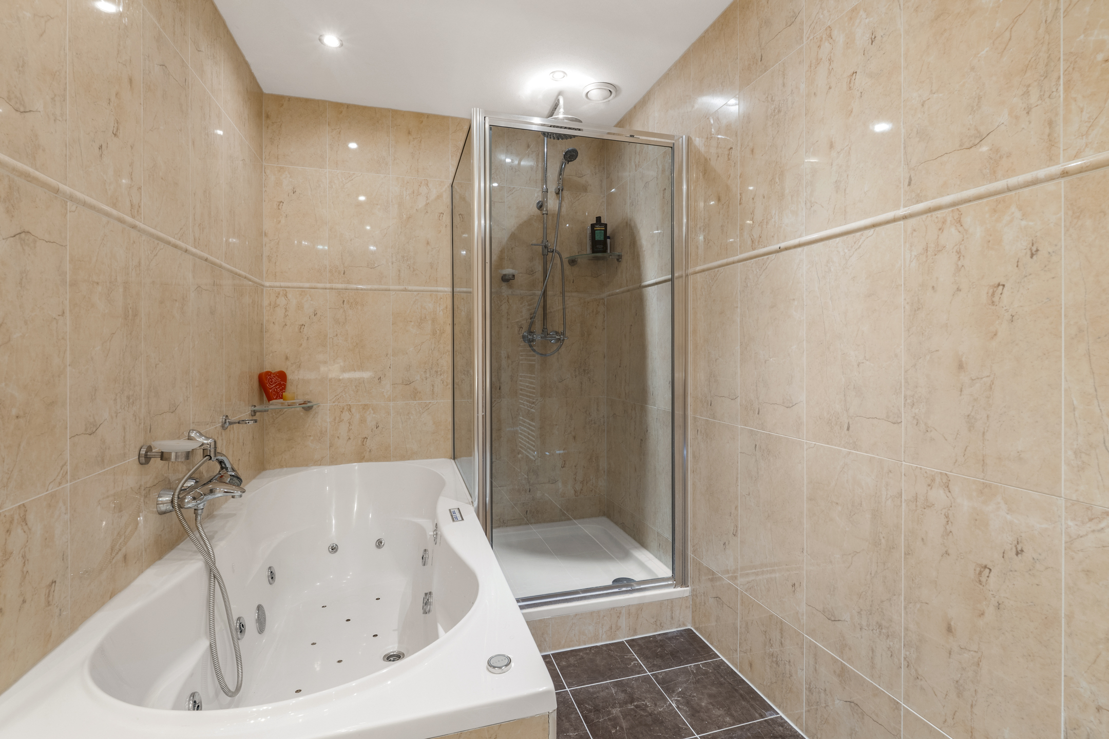 Aansluitend de ruime, luxe badkamer met fraai tegelwerk, in lichte kleurstelling met een dubbele wastafel in een meubel, een douche met regendouche en een ligbad met whirlpool.
