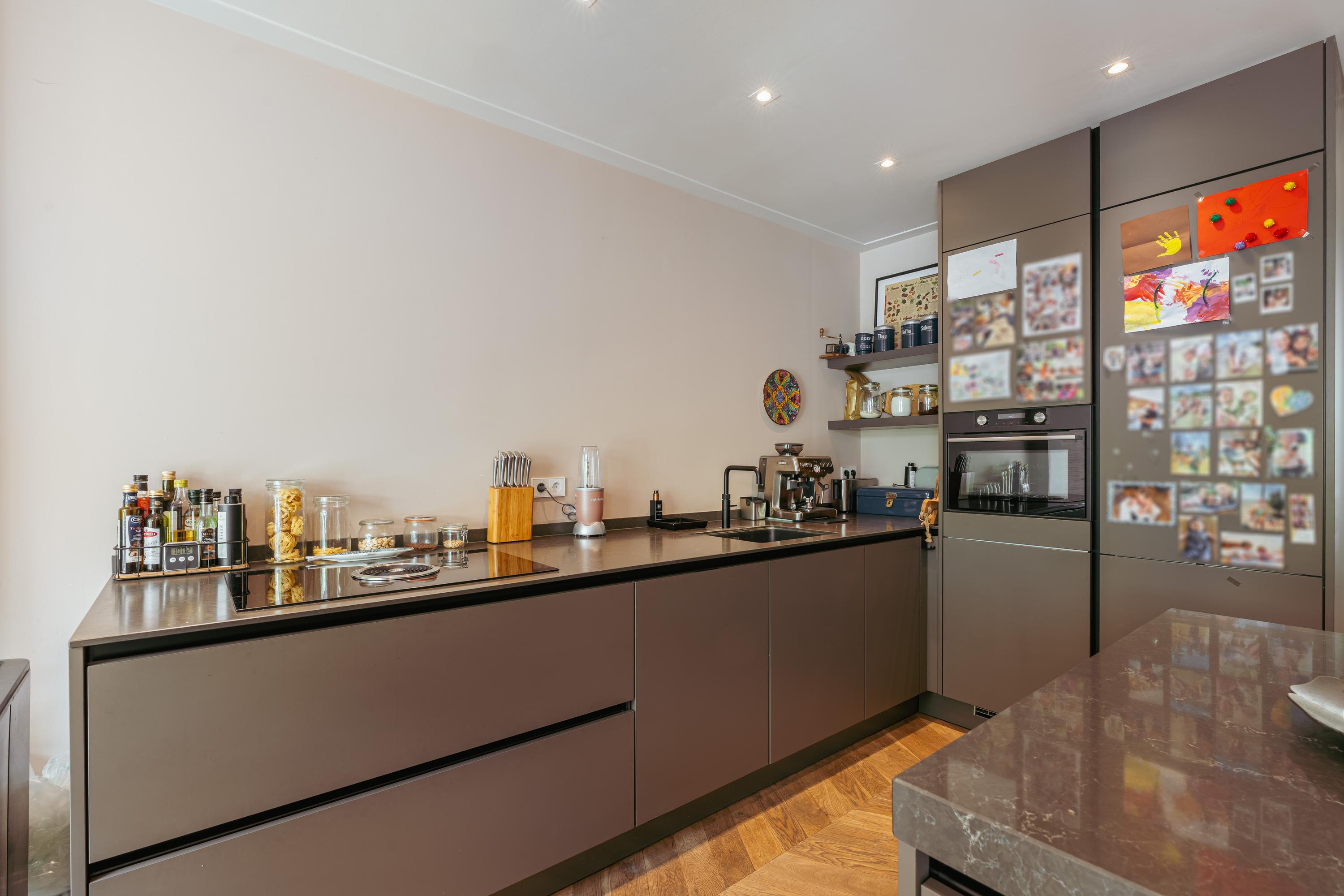 Aan de voorzijde bevindt zich de royale woonkamer, waar eenvoudig een comfortabele zithoek kan worden ingericht. Centraal in de woning treft u de open keuken met een stijlvol kookeiland en een gezellig bargedeelte. De keuken is uitgerust met hoogwaardige inbouwapparatuur, waaronder een 4-pits inductiekookplaat met geïntegreerde afzuiging, een vaatwasser, een koel-/vriescombinatie, een combi-oven en een Quooker. Een paar treden lager komt u in de recent gerealiseerde uitbouw met dakramen, die veel natuurlijk licht binnenlaten. Hier is momenteel een sfeervolle eetruimte ingericht, met daarnaast een extra zithoek rondom een moderne gashaard. Via plafondhoge glazen schuifdeuren bereikt u de fraai aangelegde tuin van circa 32 m², gelegen op het oosten. Daarnaast beschikt u over een praktische berging in de tuin.