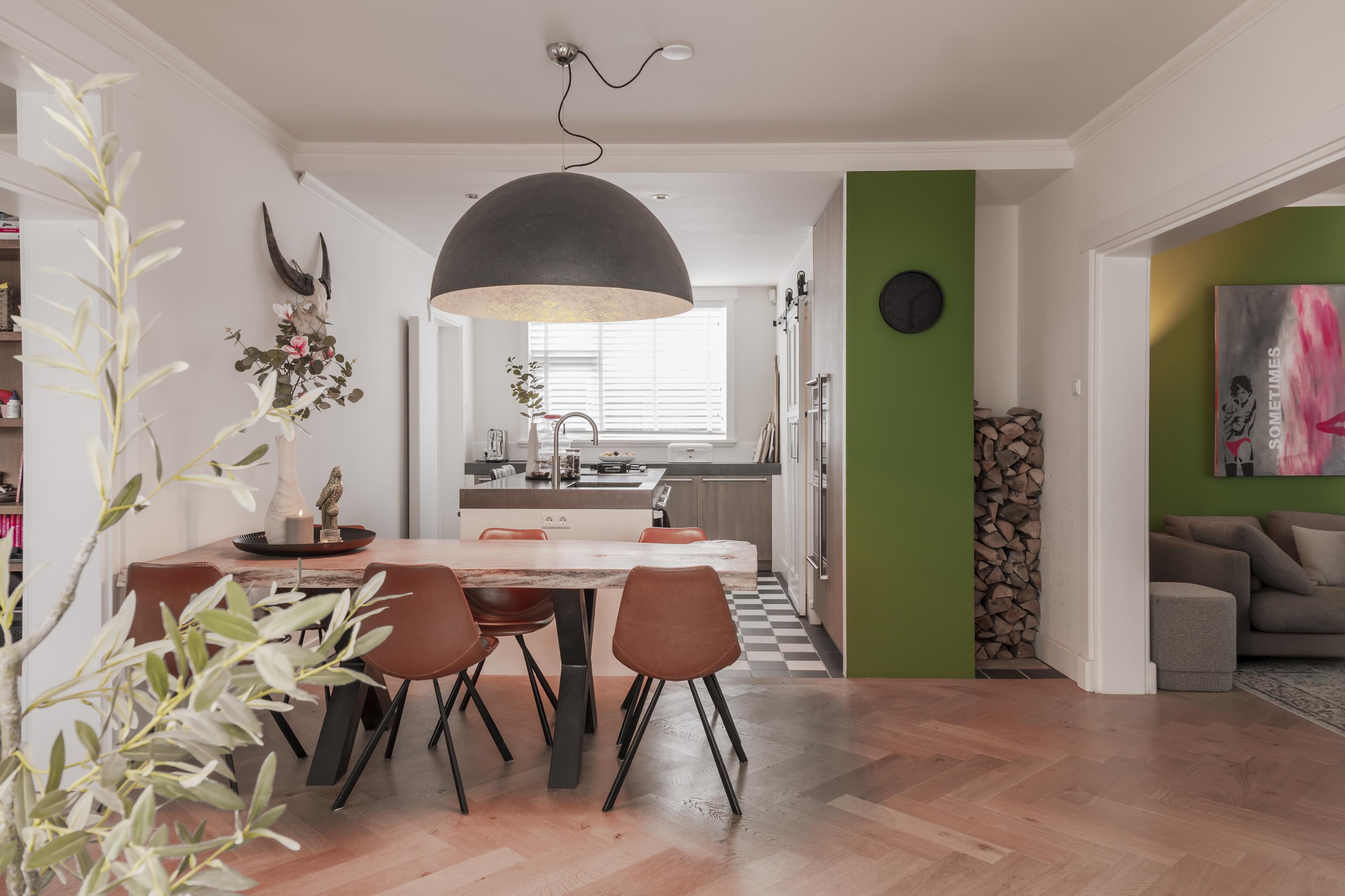 Entree met originele granitovloer, trapopgang, toilet en toegang tot de ruime kelder. De woonkamer met erker en houthaard biedt een fijne, royale leefruimte met volop mogelijkheden voor een comfortabele loungehoek. De luxe woonkeuken vormt het hart van de woning: ruim, licht en stijlvol afgewerkt, met kookeiland en hoogwaardige inbouwapparatuur. Vanuit de keuken is er een prettige verbinding met de entree en met de achtergelegen bijkeuken, inclusief een separate wasruimte.