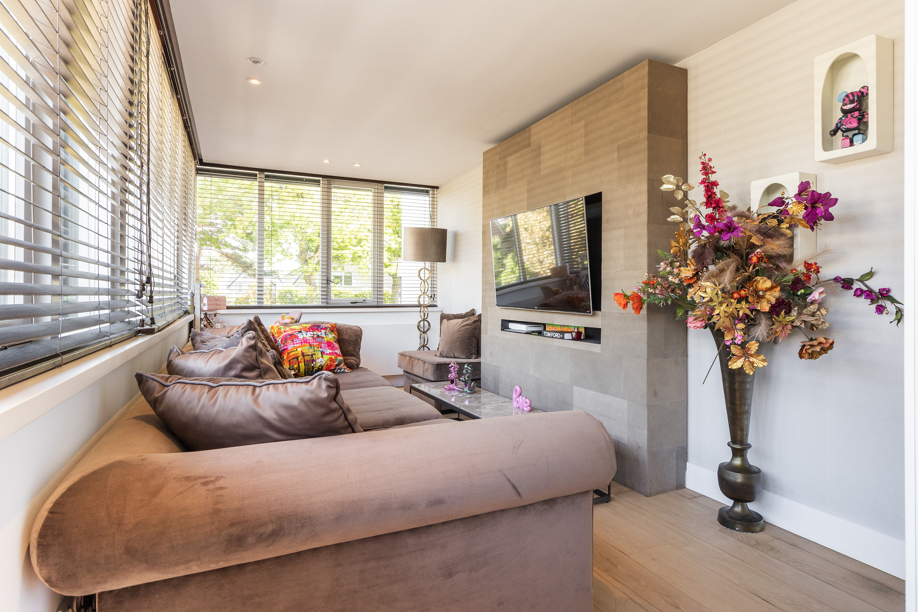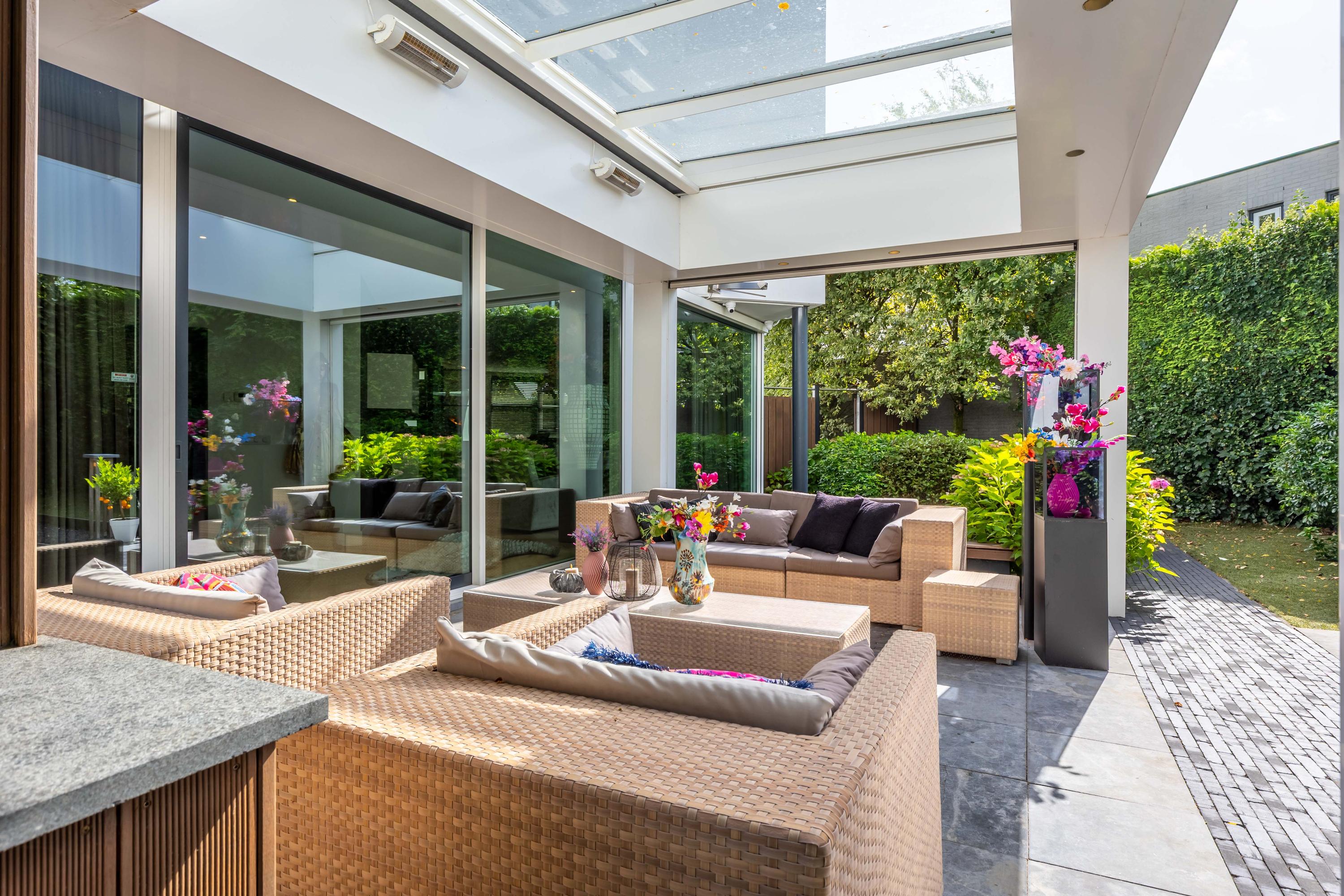 De living ademt rustige luxe, met een sfeervolle gashaard, maatwerkkasten en een geïntegreerde televisieopstelling. Grote raampartijen verbinden het interieur naadloos met de tuin; het lichtspel in huis is spectaculair.